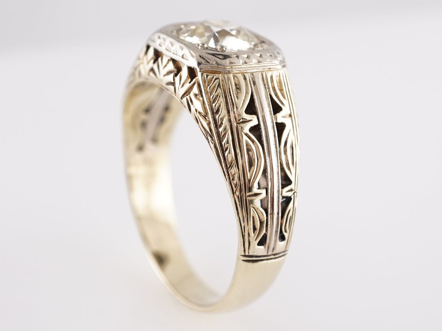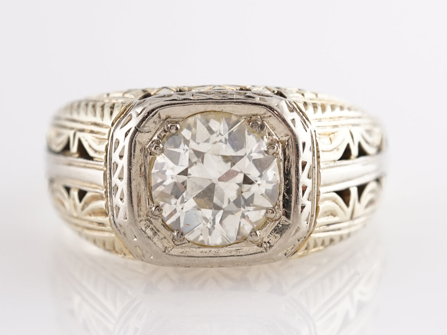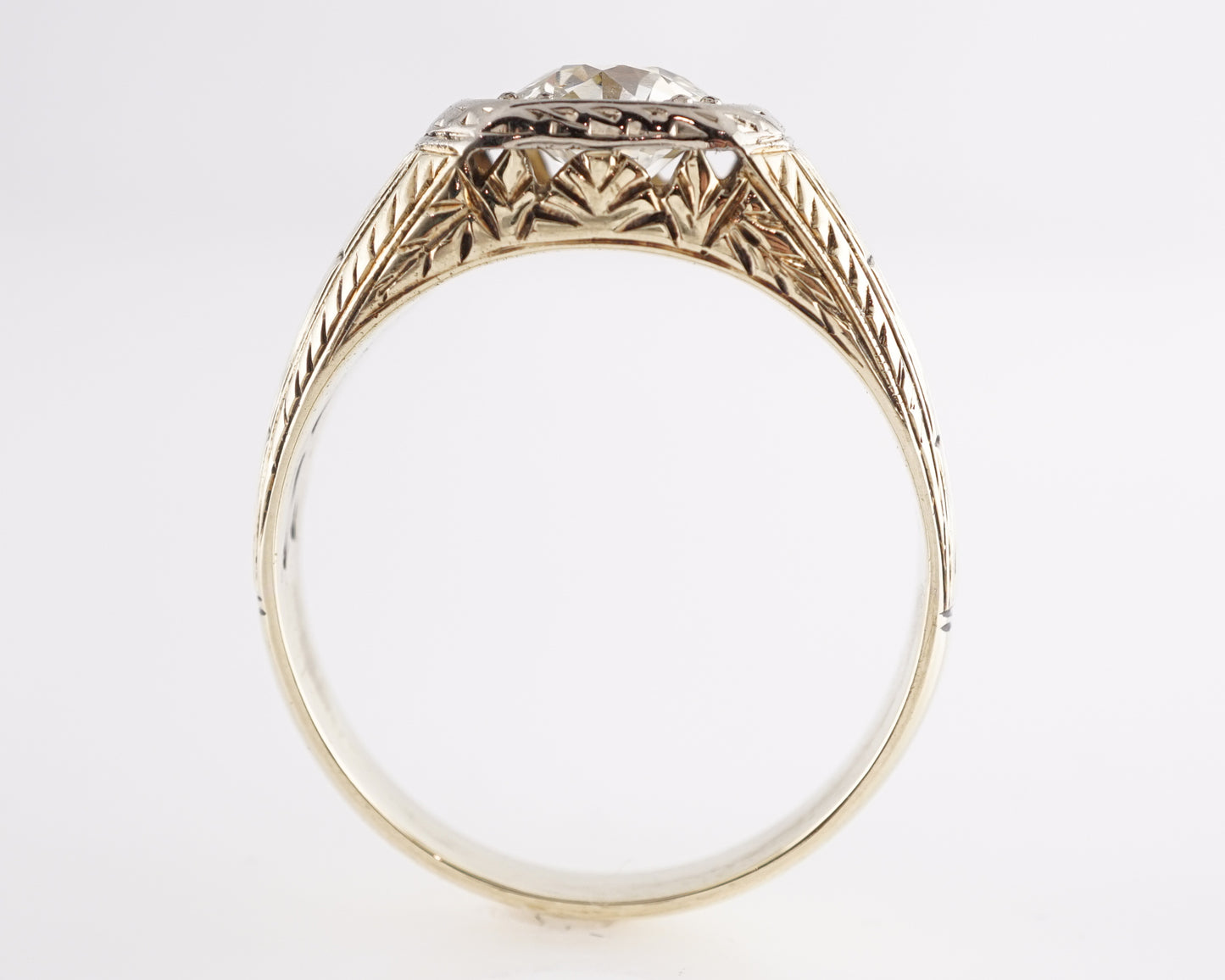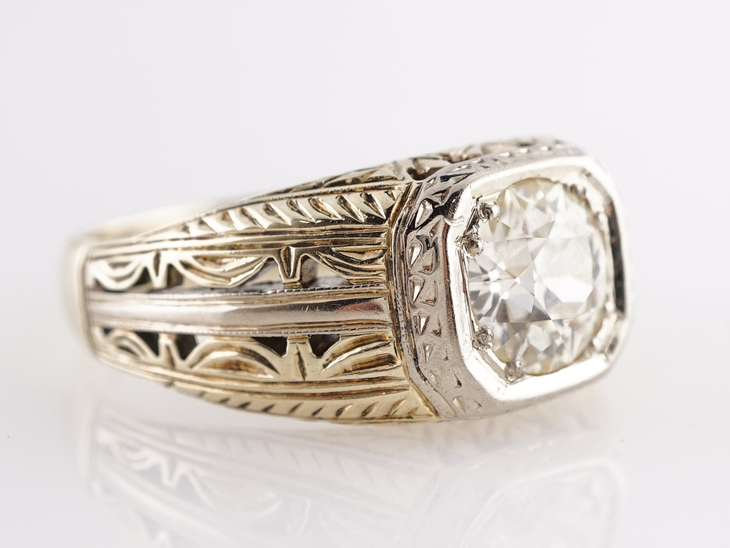 1.45 Art Deco Diamond Engagement Ring in 14k Yellow Gold. This ornamental Art Deco engagement ring features a 1.45 carat Old European cut natural diamond in 14k yellow gold. The center diamond has chunky facets and a very faint yellow tone that complements the warm, 14k gold band. The diamond is set in an Art Deco bezel mounting that features streamlined patterns and embellishments that are nostalgic of the design style of the early 20th century. The shoulders of the band are bold and thoughtfully geometric. Reserve this diamond engagement ring and bring a touch of history and vintage futurism to your special day!