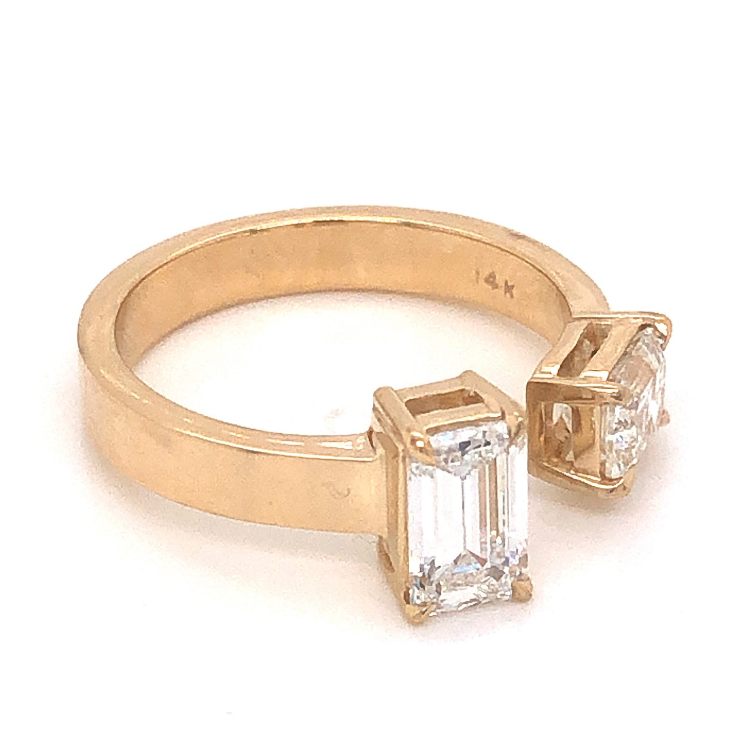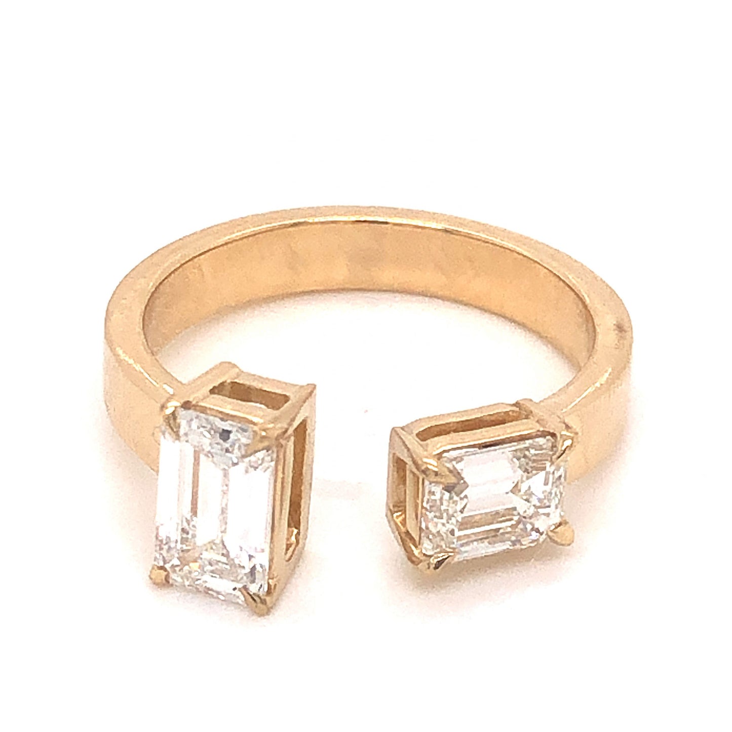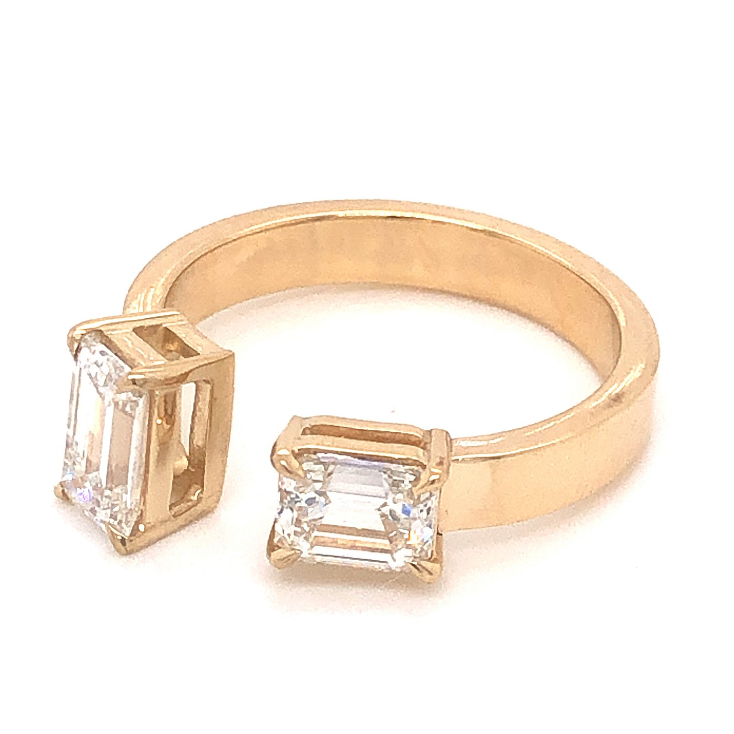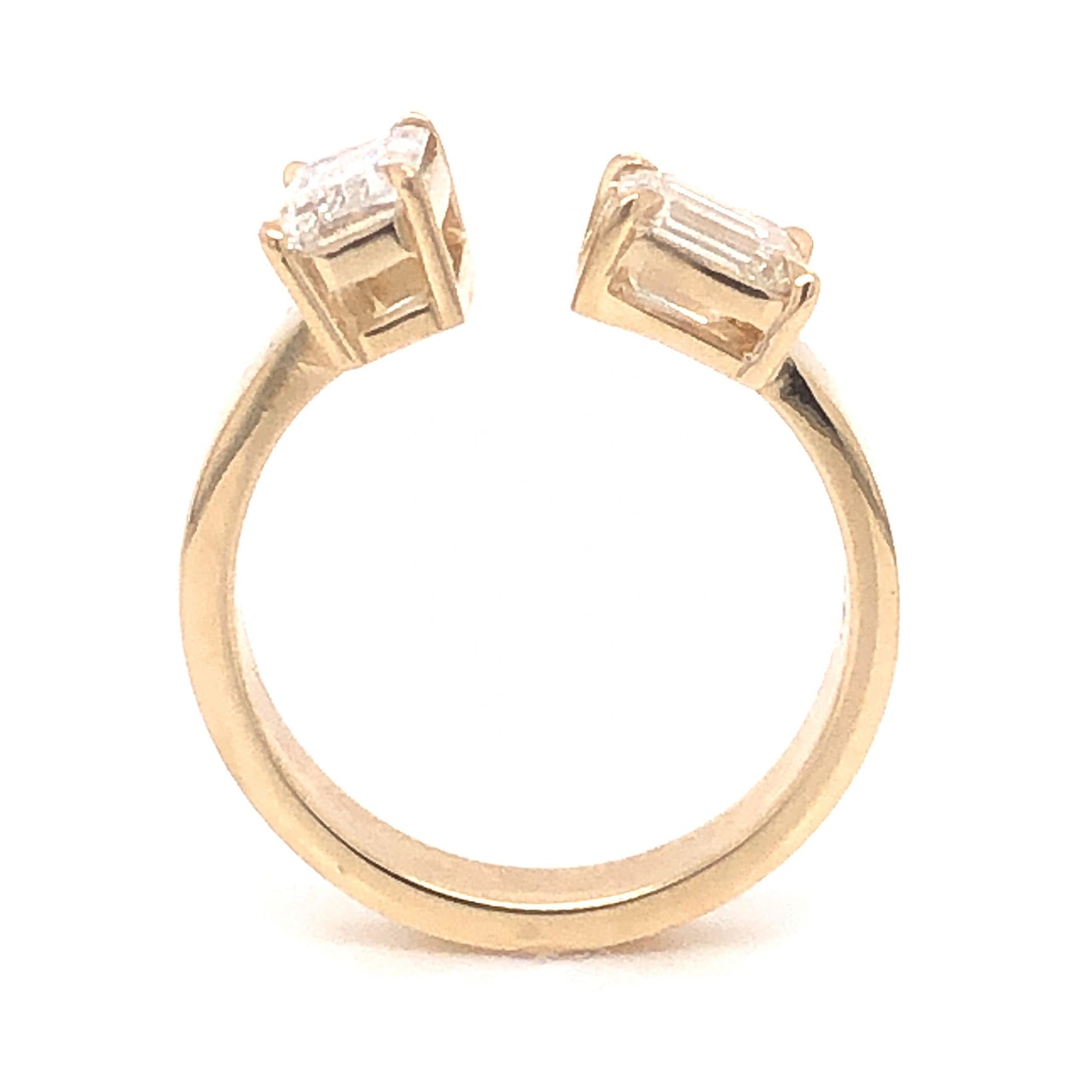 1.45 Emerald Cut Diamond Open Ring in 14k Yellow Gold. This modern, open ring features 1.45 carats of emerald cut diamonds finished in polished 14 karat yellow gold. The primary stone is a .75 carat emerald cut diamond. Set on the opposite side of the open band, a .70 carat emerald cut diamond decorates the end of the ring. Both of the diamonds are prong set. The primary diamond is colorless and the accent diamond cut is near colorless, both with an impressive clarity rating. The thick, 14k gold band measures 7.64mm wide and has a sleek, flat profile.