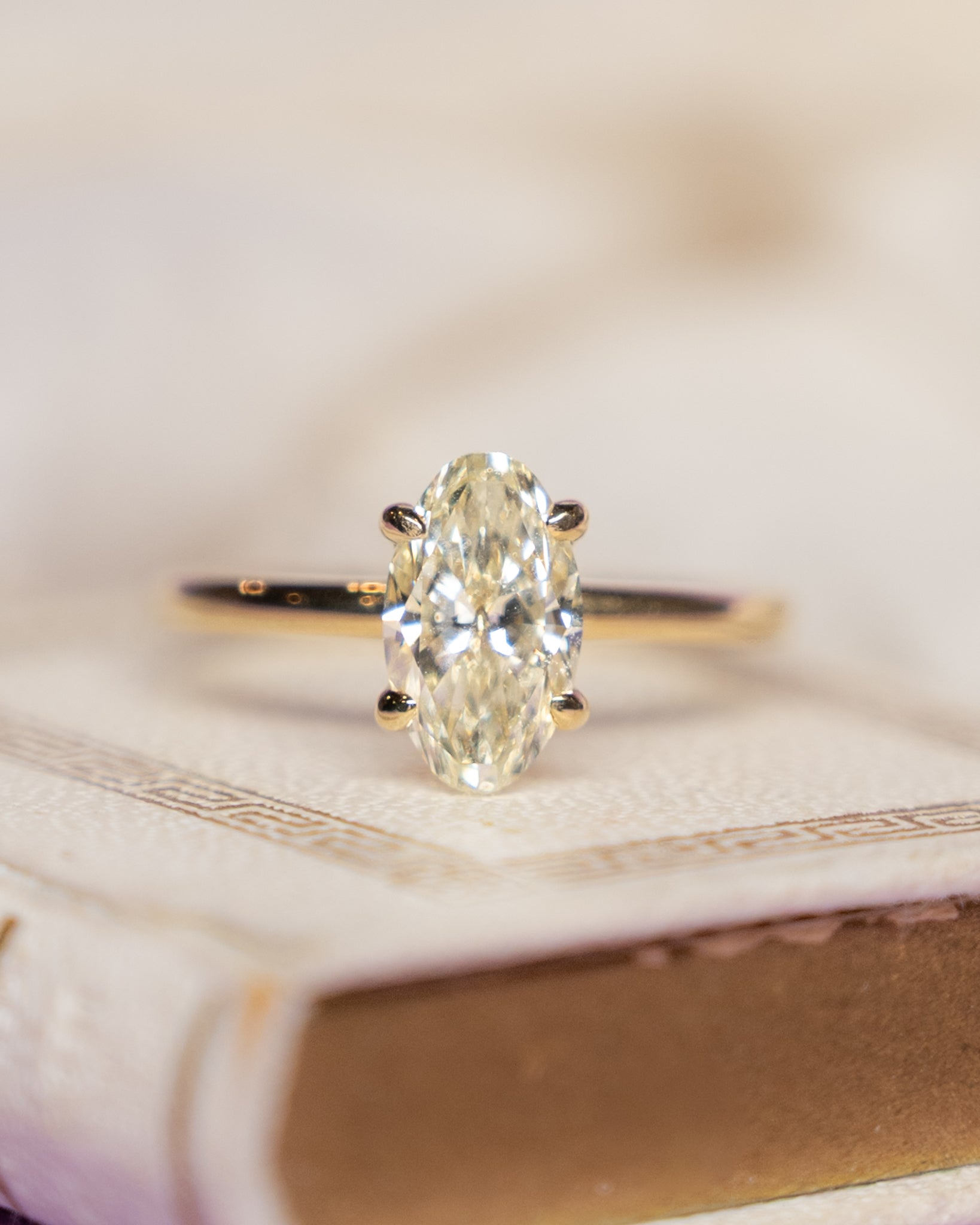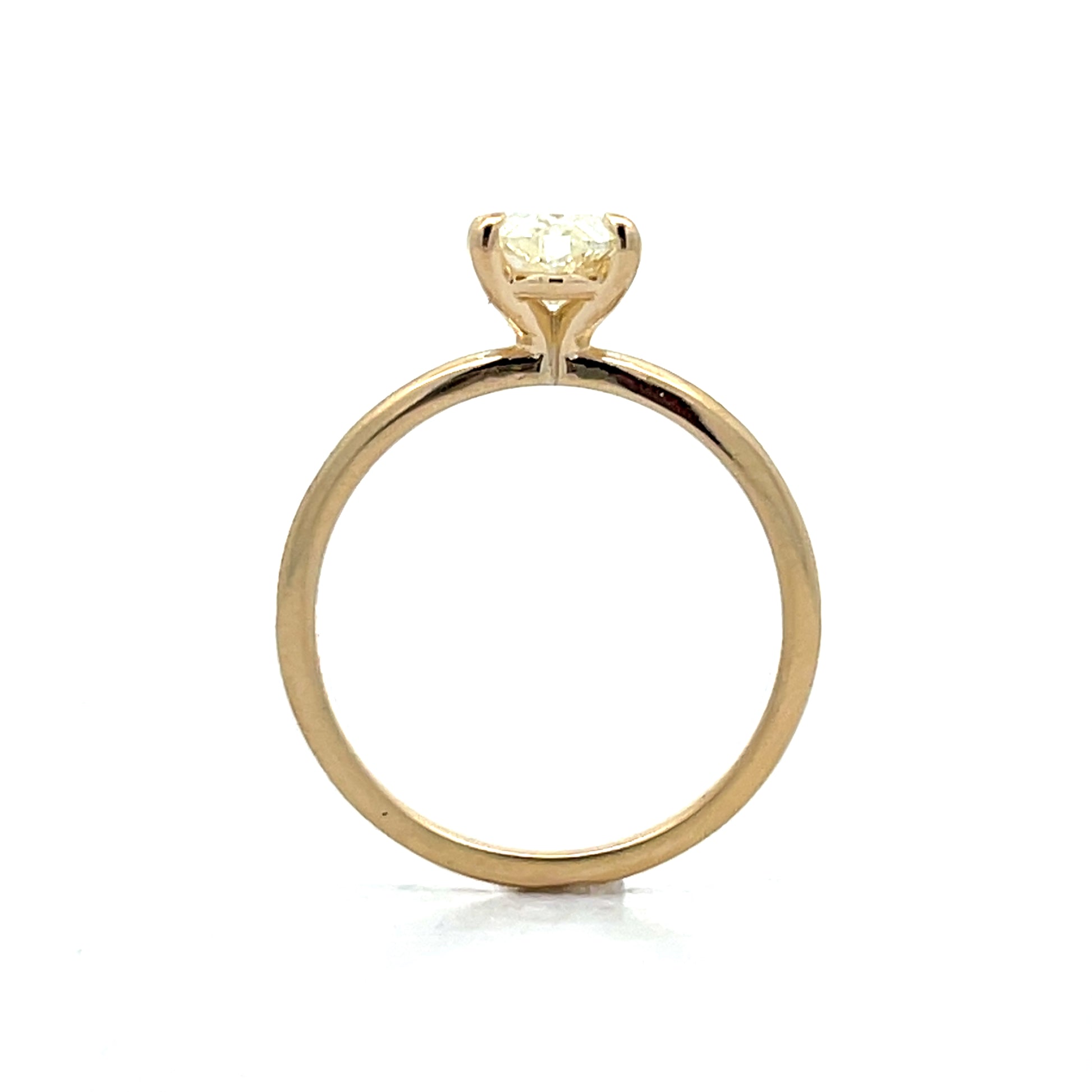This solitaire engagement ring features a GIA-certified 1.48 carat moval diamond in M color and VS2 clarity, held in a four-claw prong basket setting. The moval cut blends marquise and oval shapes into one distinctive form. Set in 14 karat yellow gold, the ring's 2mm band makes the ring easy to wear and pair with a wedding band.. The prong setting allows light to reach the stone from multiple angles while keeping it secure.