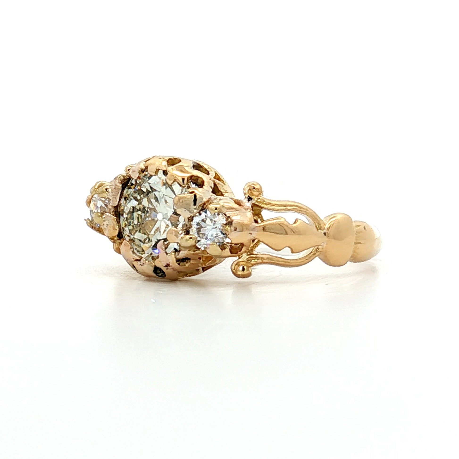 This antique Victorian engagement ring features a 1.48 carat GIA-certified old European cut diamond with SI1 clarity and M color as its centerpiece, flanked by two old European cut accent diamonds of .09 carats each. The three-stone design is set in 18 karat yellow gold with a decorative split shank characteristic of Victorian jewelry. Total carat weight is 1.66. The old European cut, popular during the Victorian era, has a distinctive cushion-like appearance with broader facets than modern round brilliants, giving these antique diamonds their characteristic glittery effect.