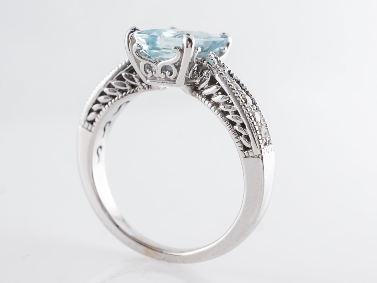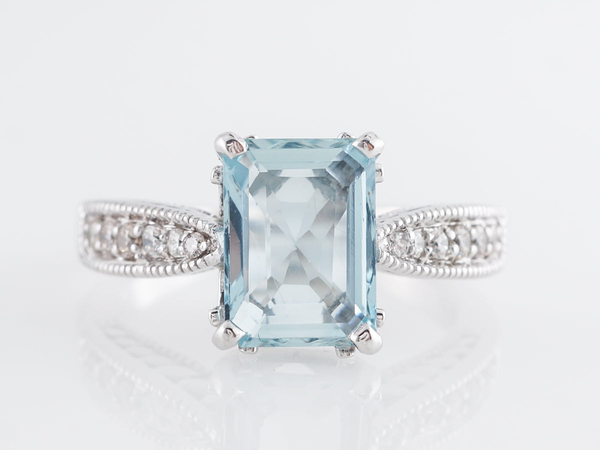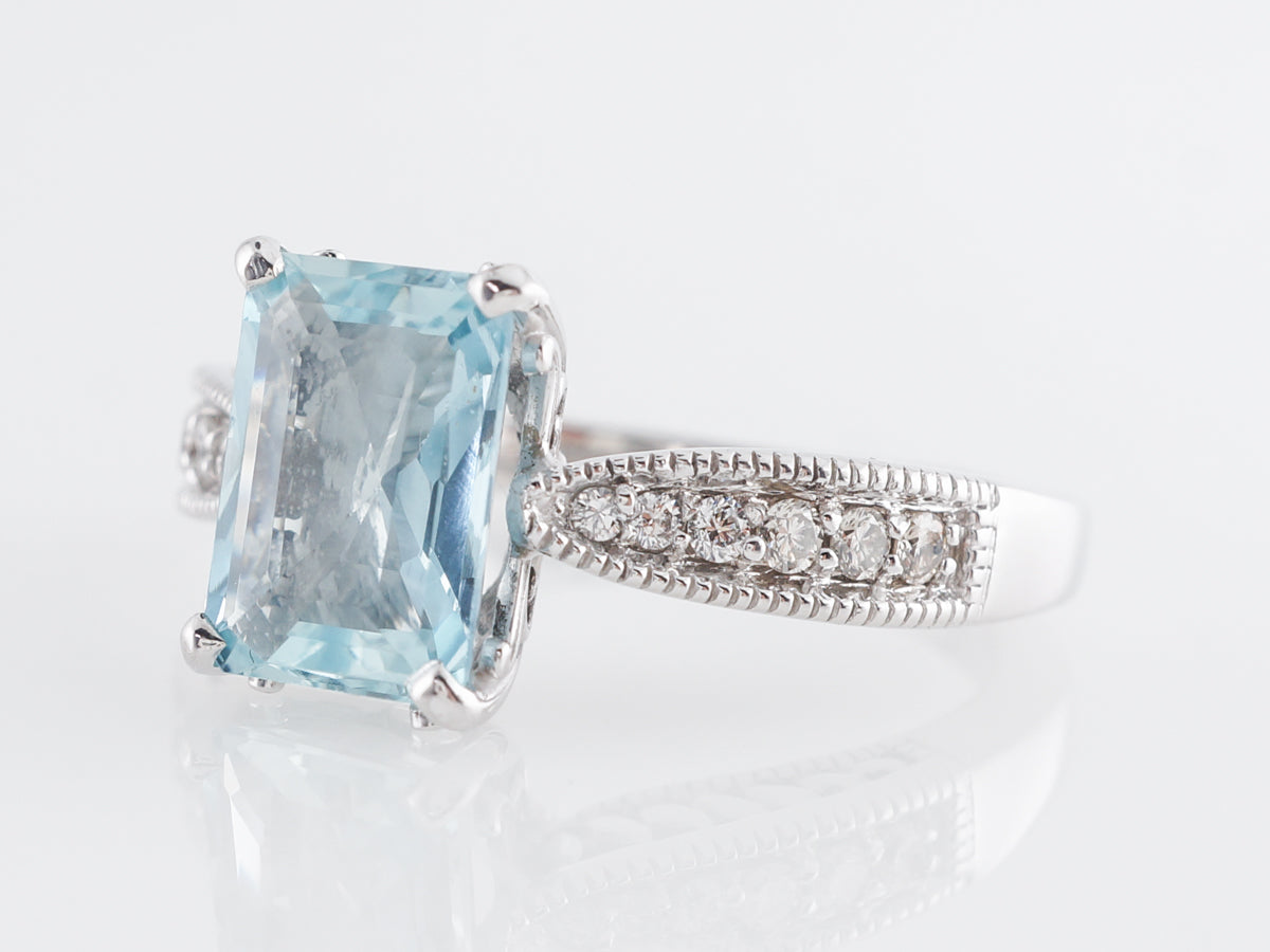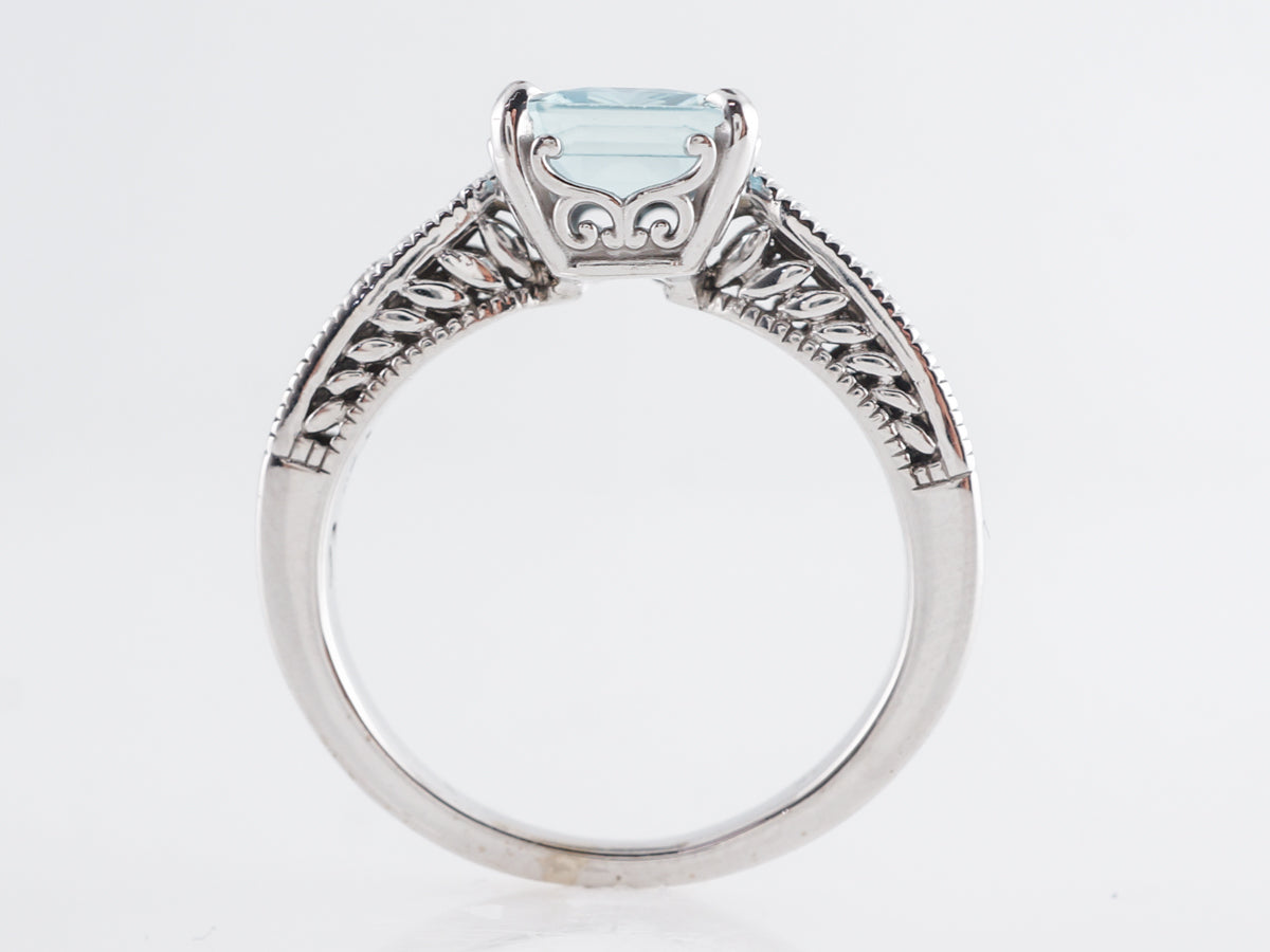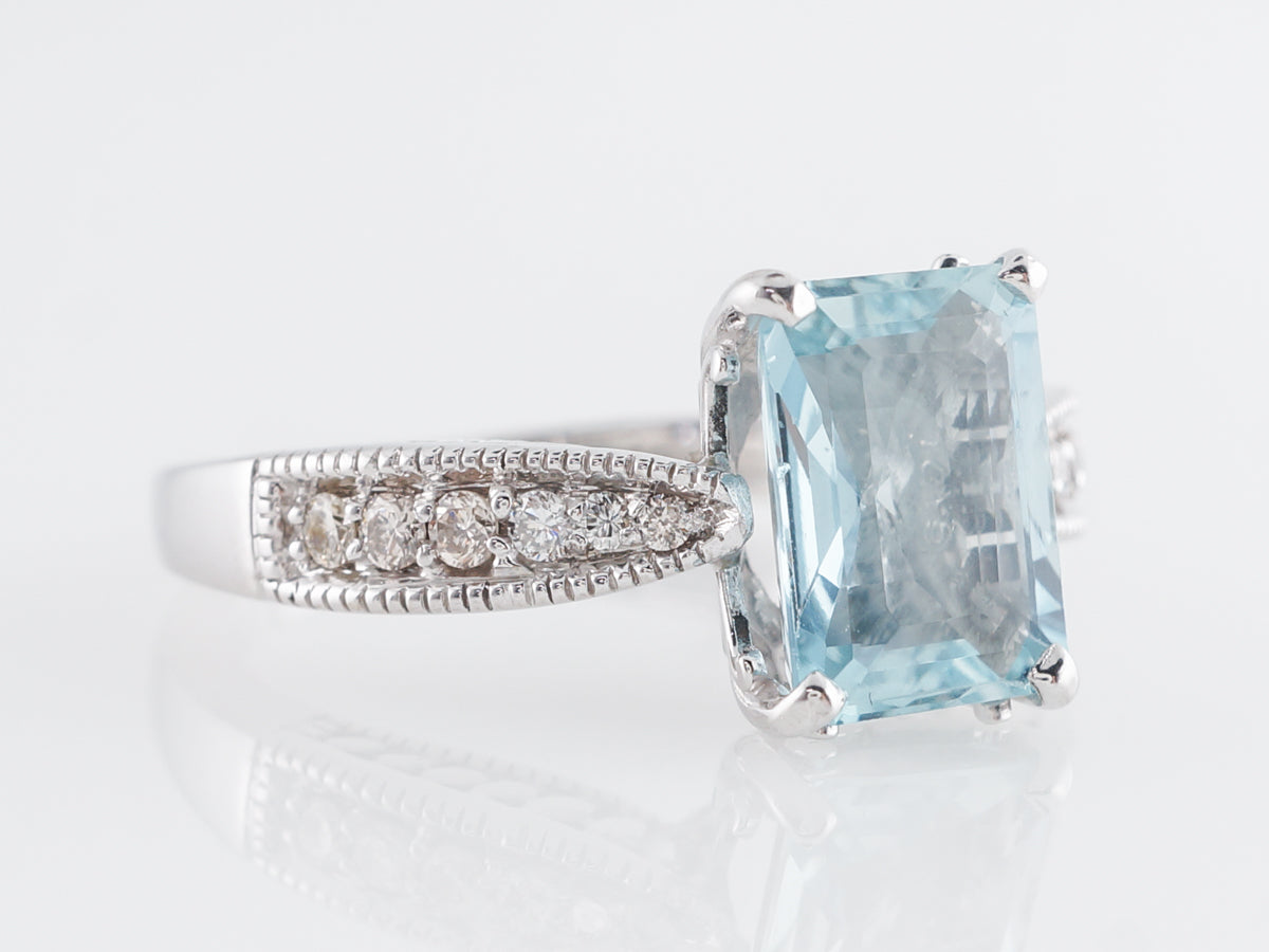 1.49 Emerald Cut Aquamarine w/ Diamonds 14k White Gold. This modern ring features a beautiful 1.49 carat emerald cut aquamarine. The beautiful center stone is accented by round cut diamonds, providing sparkle at every turn of the hand. Additionally, the diamonds are accented with curved milgrain detailing which provides added texture to the ring.