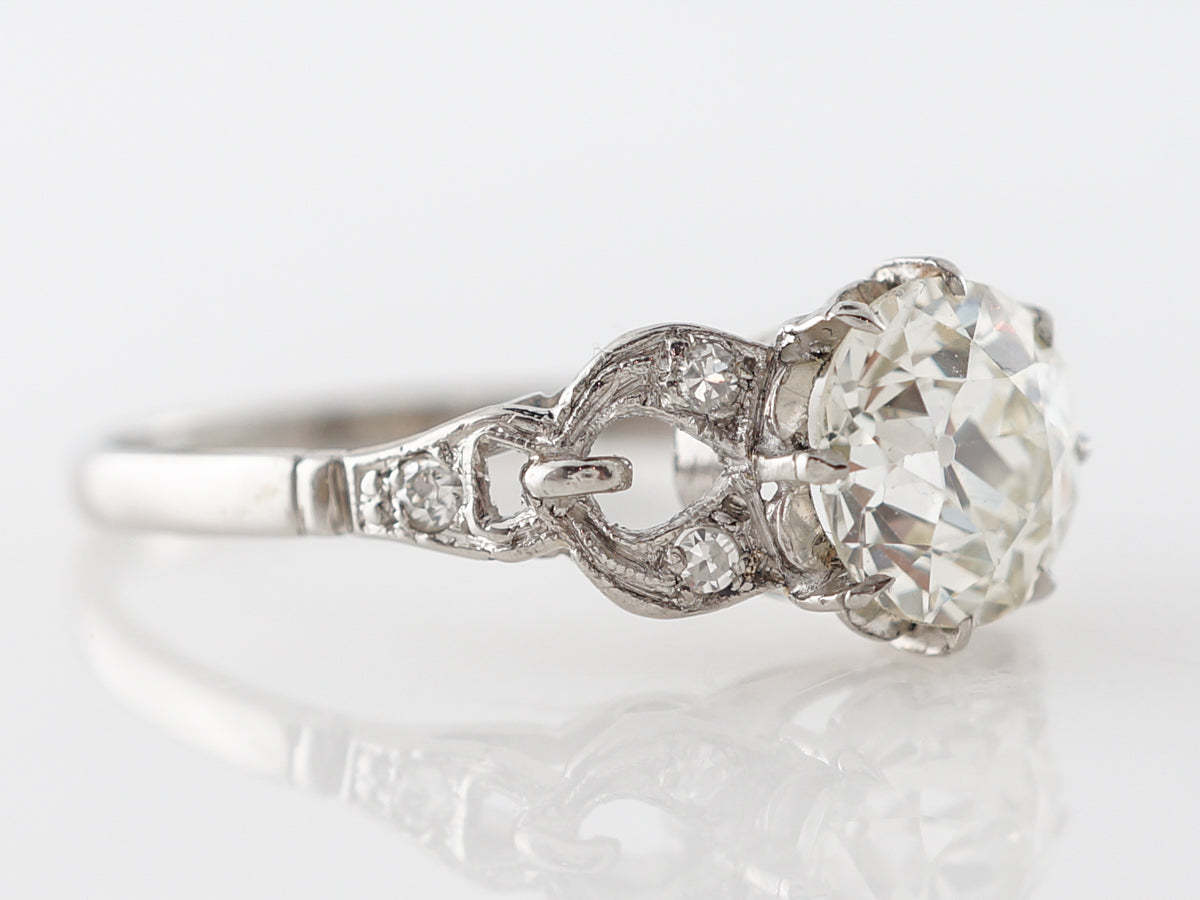 1.5 Carat Old European Diamond Engagement Ring Platinum. This superb Art Deco engagement ring features a 1.58 carat Old European cut diamond set in platinum. The shoulders of this ring are designed with adorable loops of open space that are connected with a polished piece of platinum, creating an almost braided look. Connecting the raised section of the shoulders to the band below are small circles, which add a nice dimension to the side profile. From every angle this is a fascinating ring to stare at and appreciate fine craftsmanship.