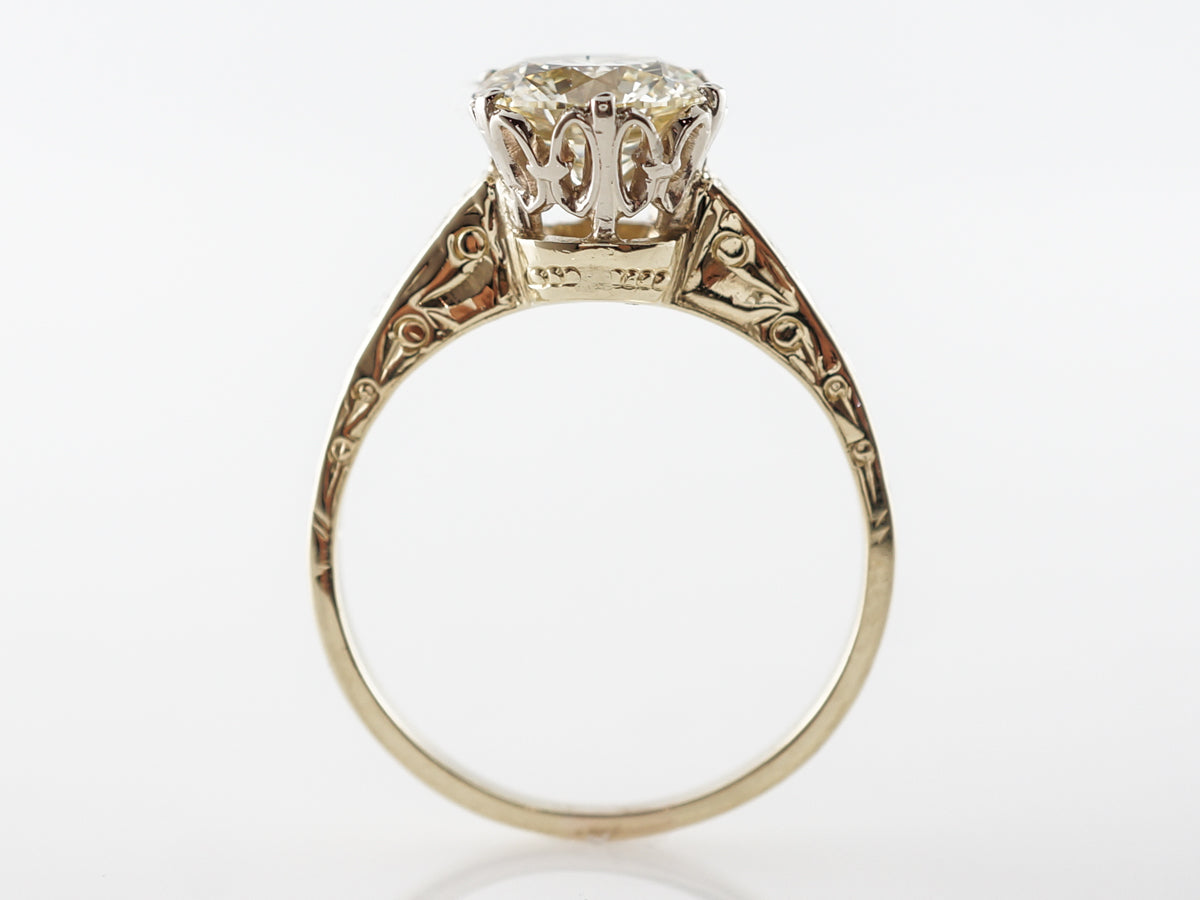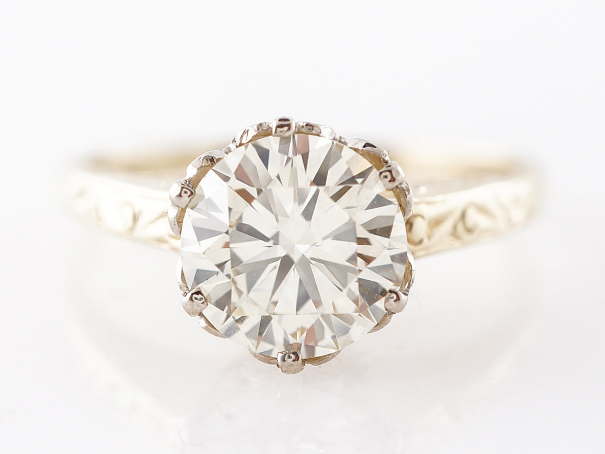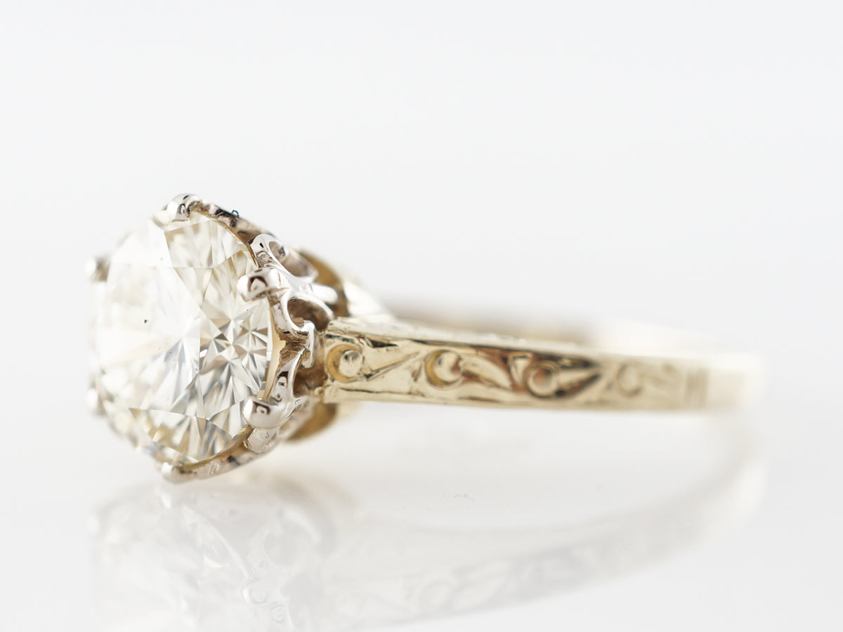1.5 Carat Solitaire Diamond Art Deco Engagement Ring. This stunning two-toned Art Deco solitaire diamond engagement ring features a fabulous 1.5 carat Round Brilliant Cut diamond in the antique setting. The squared off shoulders feature wonderful engraving on the shoulders which lead up to the very open basket that lets plenty of light into the gorgeous center stone. The basket of this ring is done in 14 karat white gold which enhances the whiteness of the center stone while allowing the ring to enjoy the beautiful warm yellow color of the band.