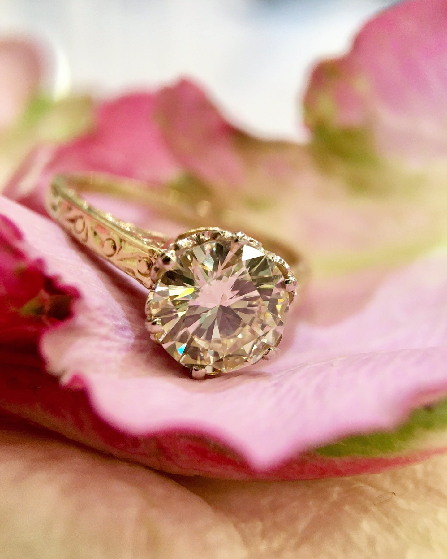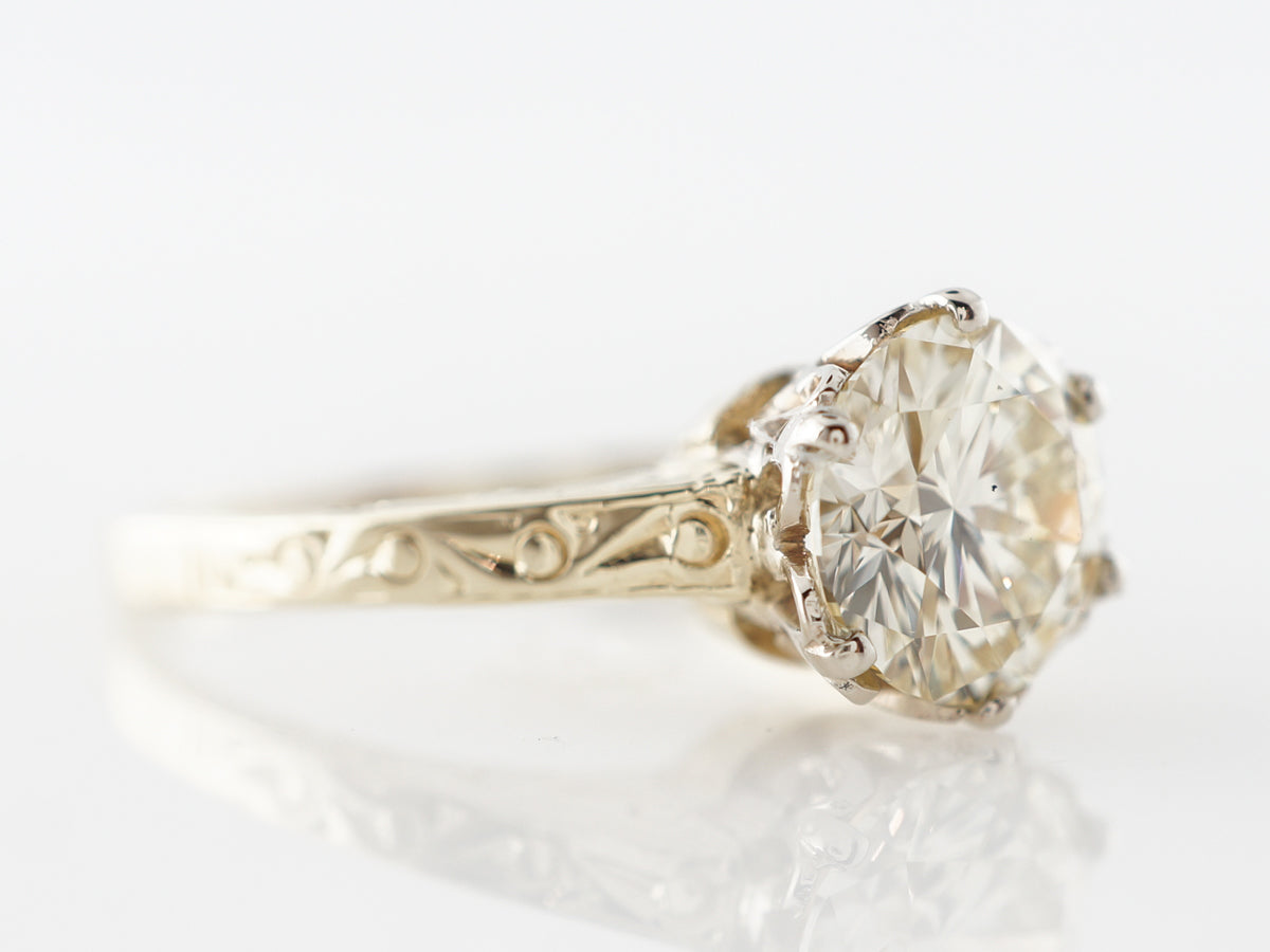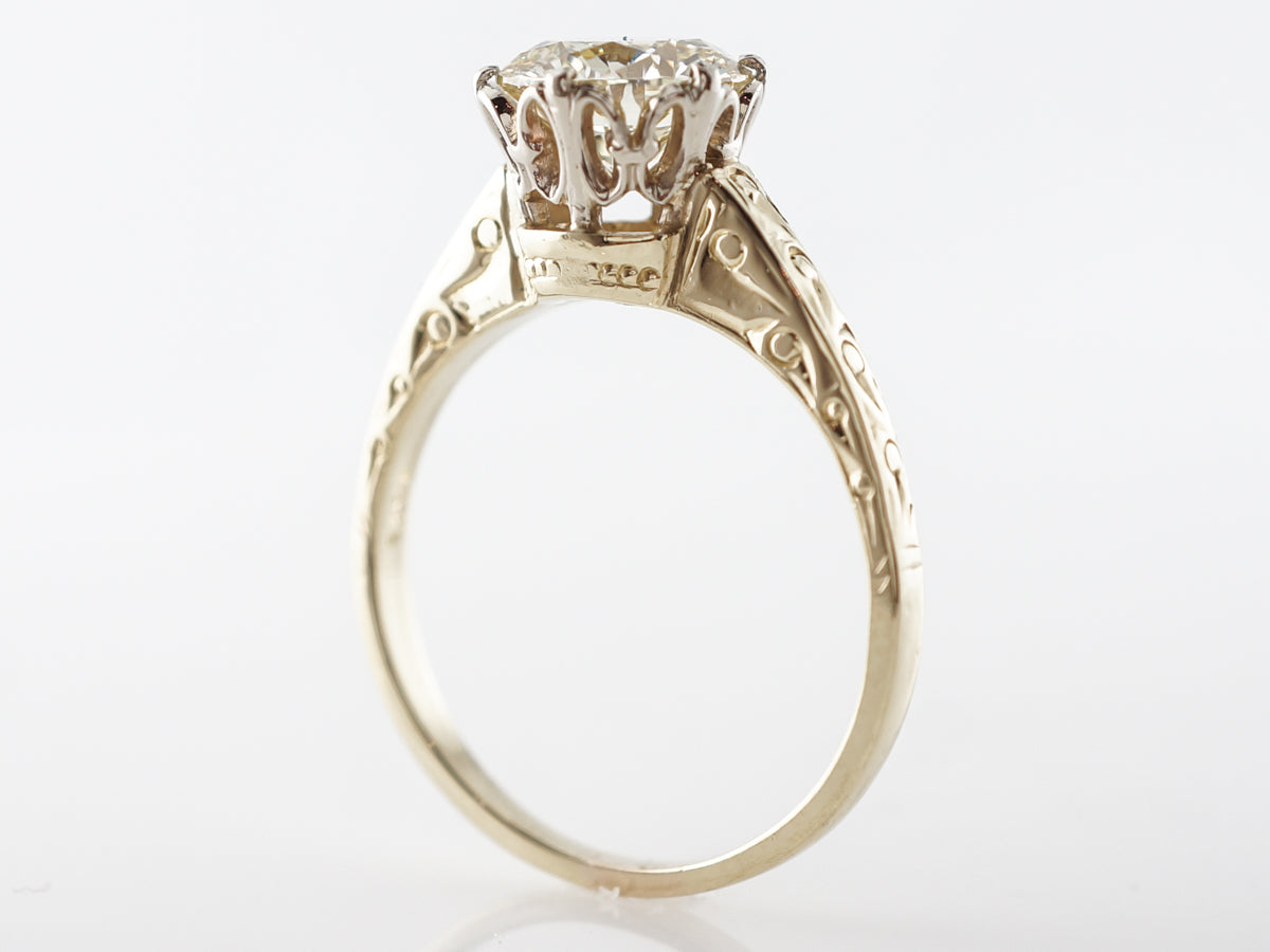 1.5 Carat Solitaire Diamond Art Deco Engagement Ring. This stunning two-toned Art Deco solitaire diamond engagement ring features a fabulous 1.5 carat Round Brilliant Cut diamond in the antique setting. The squared off shoulders feature wonderful engraving on the shoulders which lead up to the very open basket that lets plenty of light into the gorgeous center stone. The basket of this ring is done in 14 karat white gold which enhances the whiteness of the center stone while allowing the ring to enjoy the beautiful warm yellow color of the band.