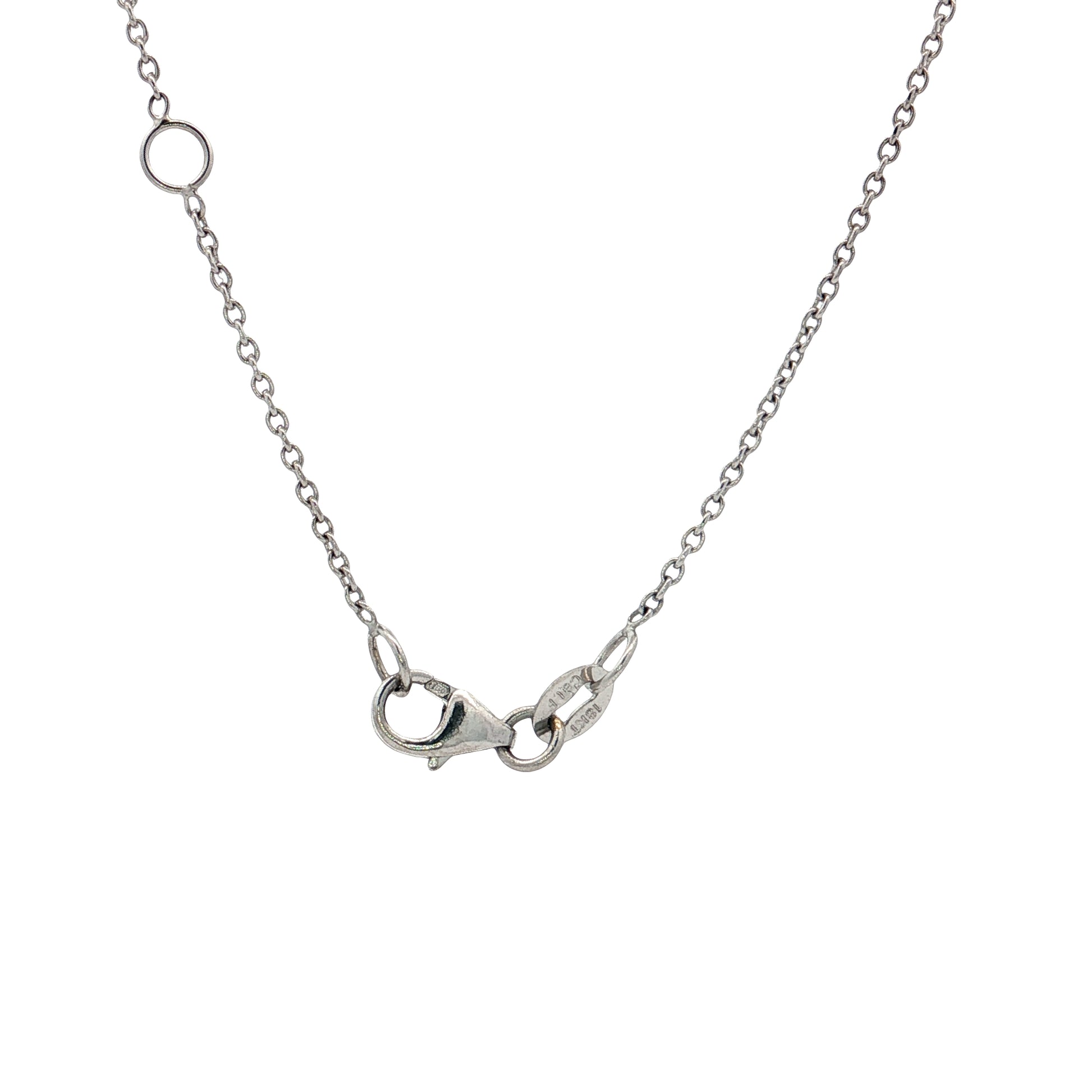 The diamonds are channel set around the horseshoe form. The pendant comes on a 16-inch chain that sits at the base of the neck. The white gold has a bright silver appearance that matches the white diamonds.