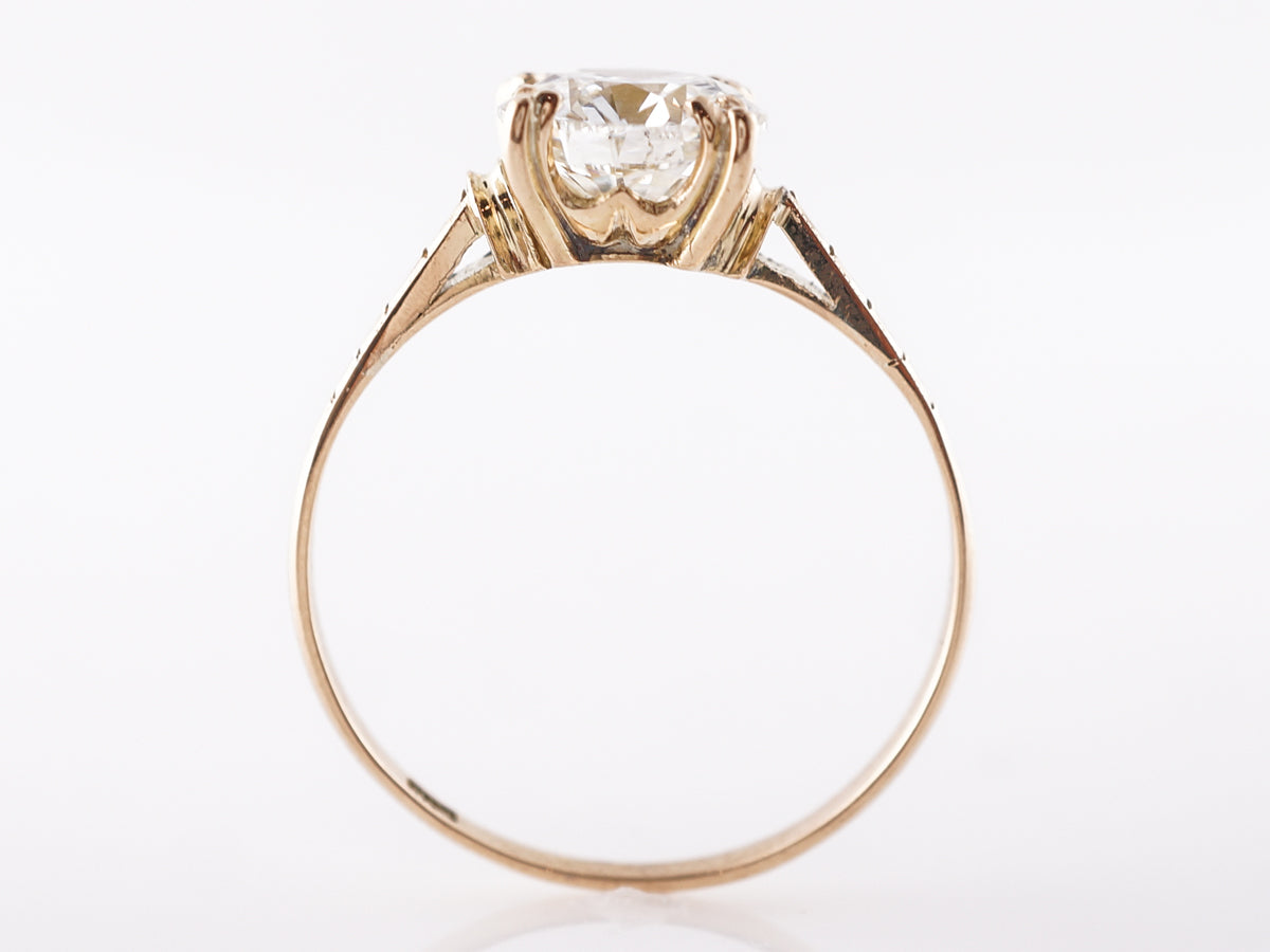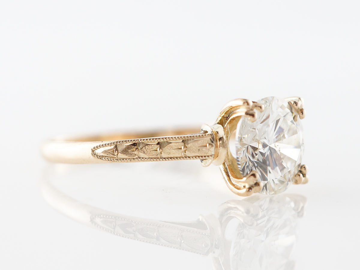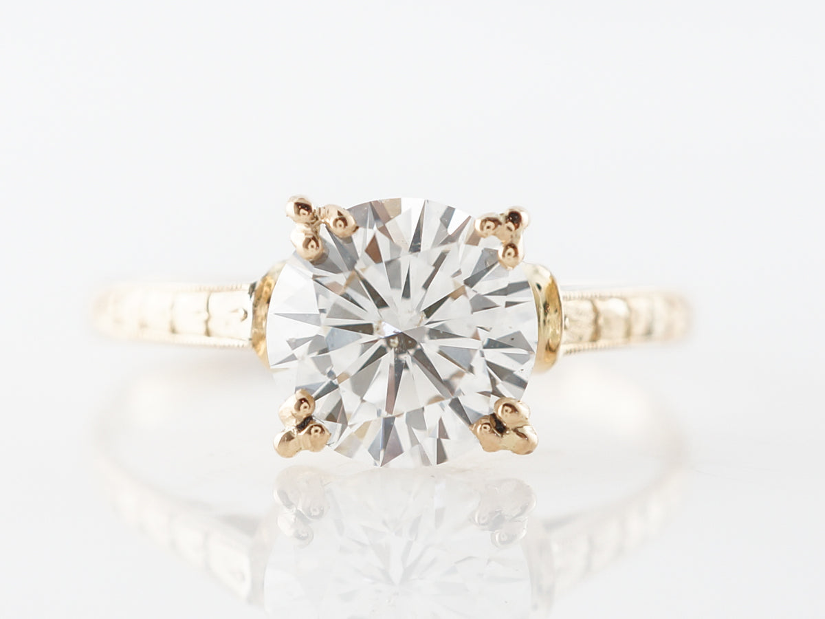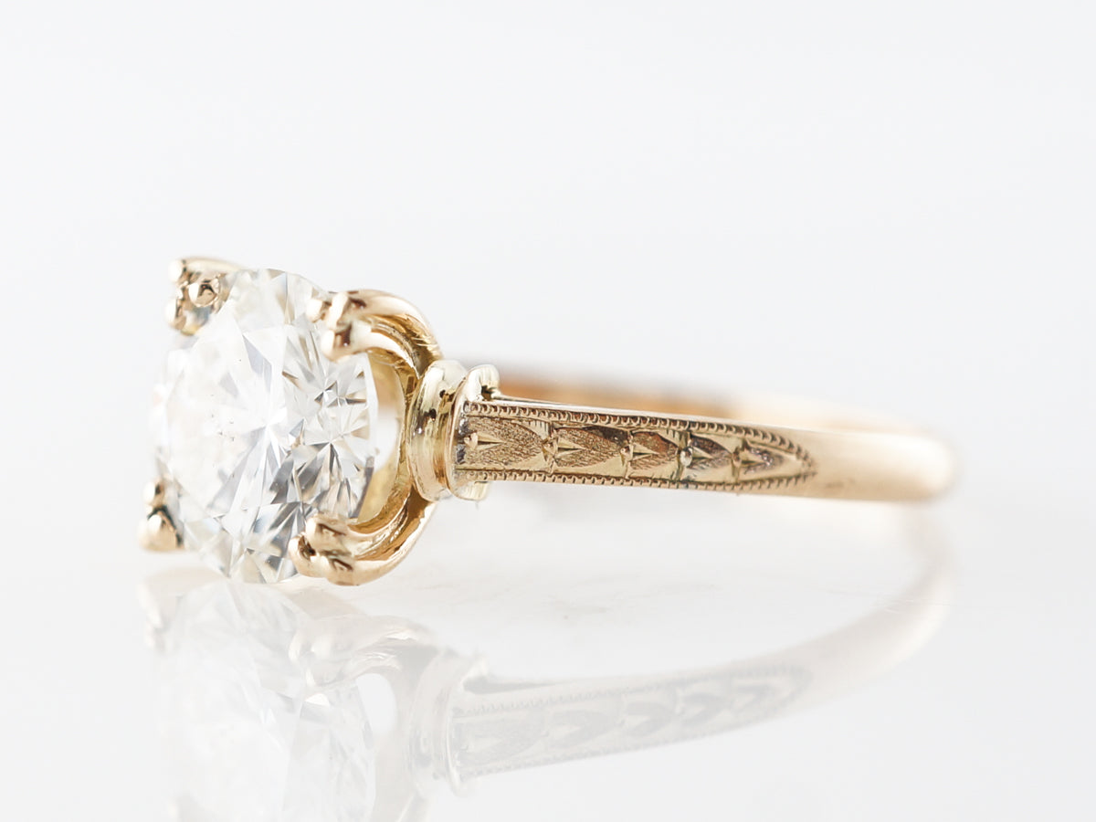 Antique Style Diamond Solitaire Engagement Ring 1.50 Carats. This solitaire diamond engagement ring features a 1.50 carat round brilliant cut diamond and is finished in 18 karat yellow gold. The diamond is secured with four (4) fishtail prongs and the shoulders contain a lovely chevron pattern bordered by milgrain detail. A modern ring done in a classic and timeless style.