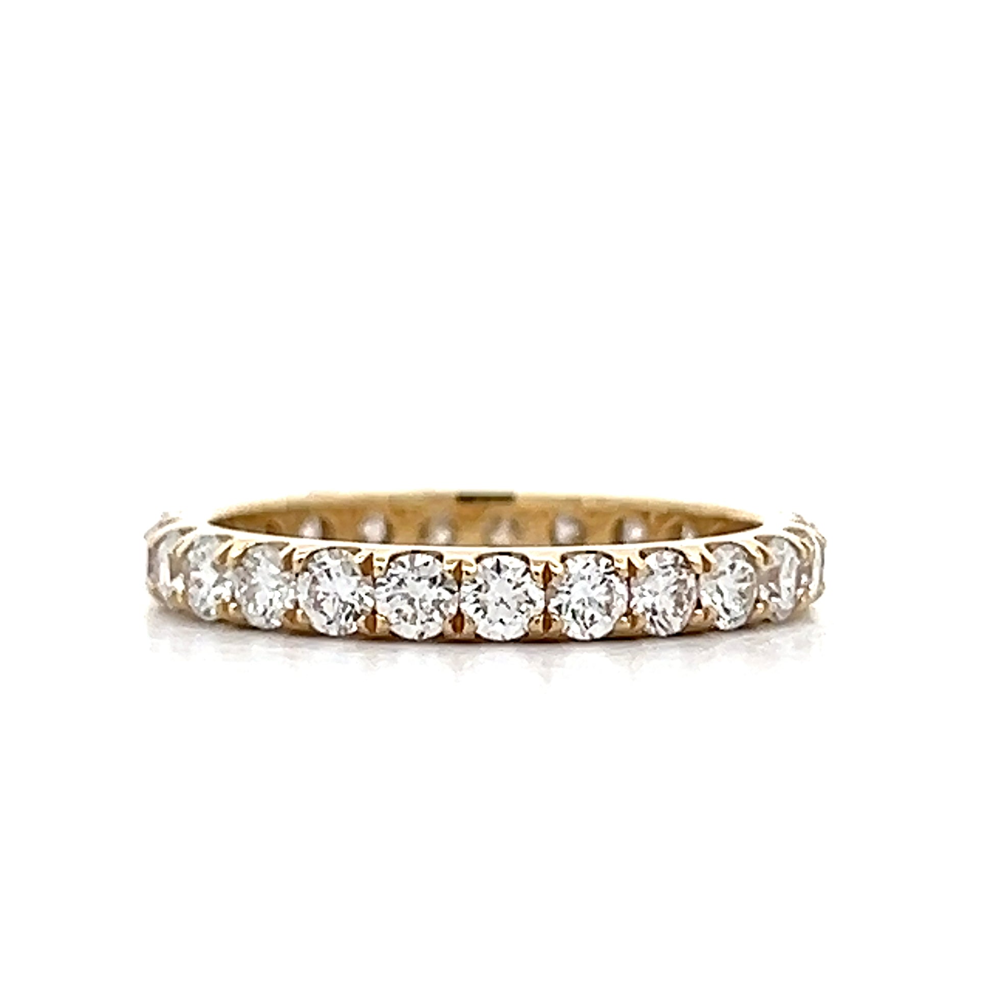 This 14 karat yellow gold eternity wedding band features round brilliant cut diamonds with G color and SI1 clarity totaling 1.50 carats. The shared prong setting allows each diamond to receive maximum light exposure while wrapping completely around the band. This modern design works well for stacking with engagement rings or wearing alone as a statement piece.