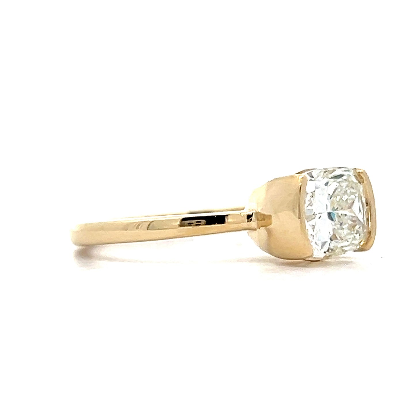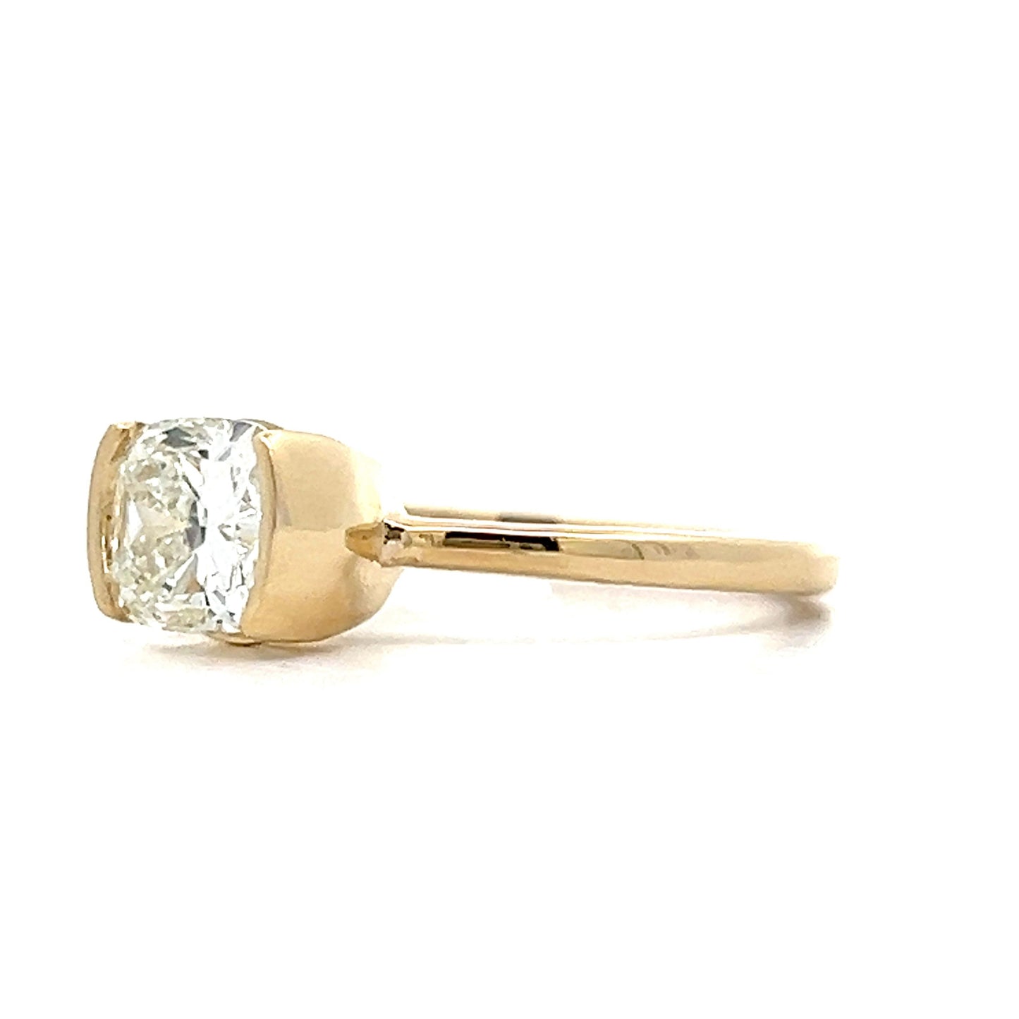 This modern engagement ring features a cushion cut natural diamond. This unique piece is crafted in 14 karat yellow gold, with a high polish finish in a half bezel. The half bezel design allows for more light to move through the stone than a full bezel, allowing the gorgeous stone to sparkle. The center stone is a GIA certified 1.50 carat cushion cut diamond that is set in East/West style. The band measures 1.75mm and makes the ring comfortable and easy to wear.