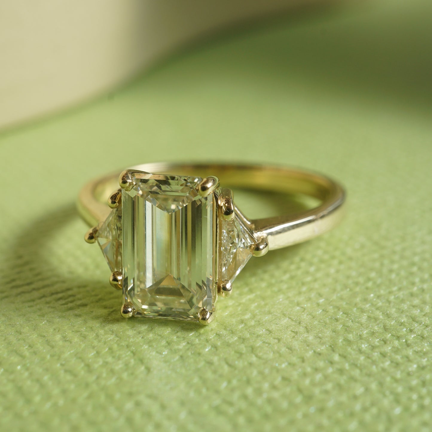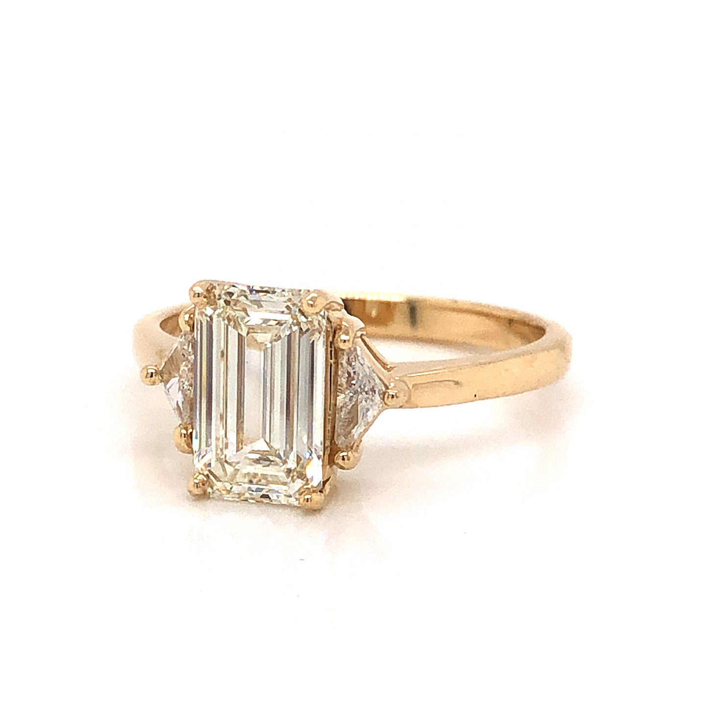 This custom By Filigree engagement ring features a GIA-certified 1.50 carat emerald cut diamond and diamond accents in polished 14 karat yellow gold. The rectangular center diamond has a very faint, champagne hue. Eye clean and prong set, the center diamond is flanked by two (2) .12 carat accent diamonds. From the profile, a classic basket mounting secures the collection of diamonds on a polished 14K yellow gold band.