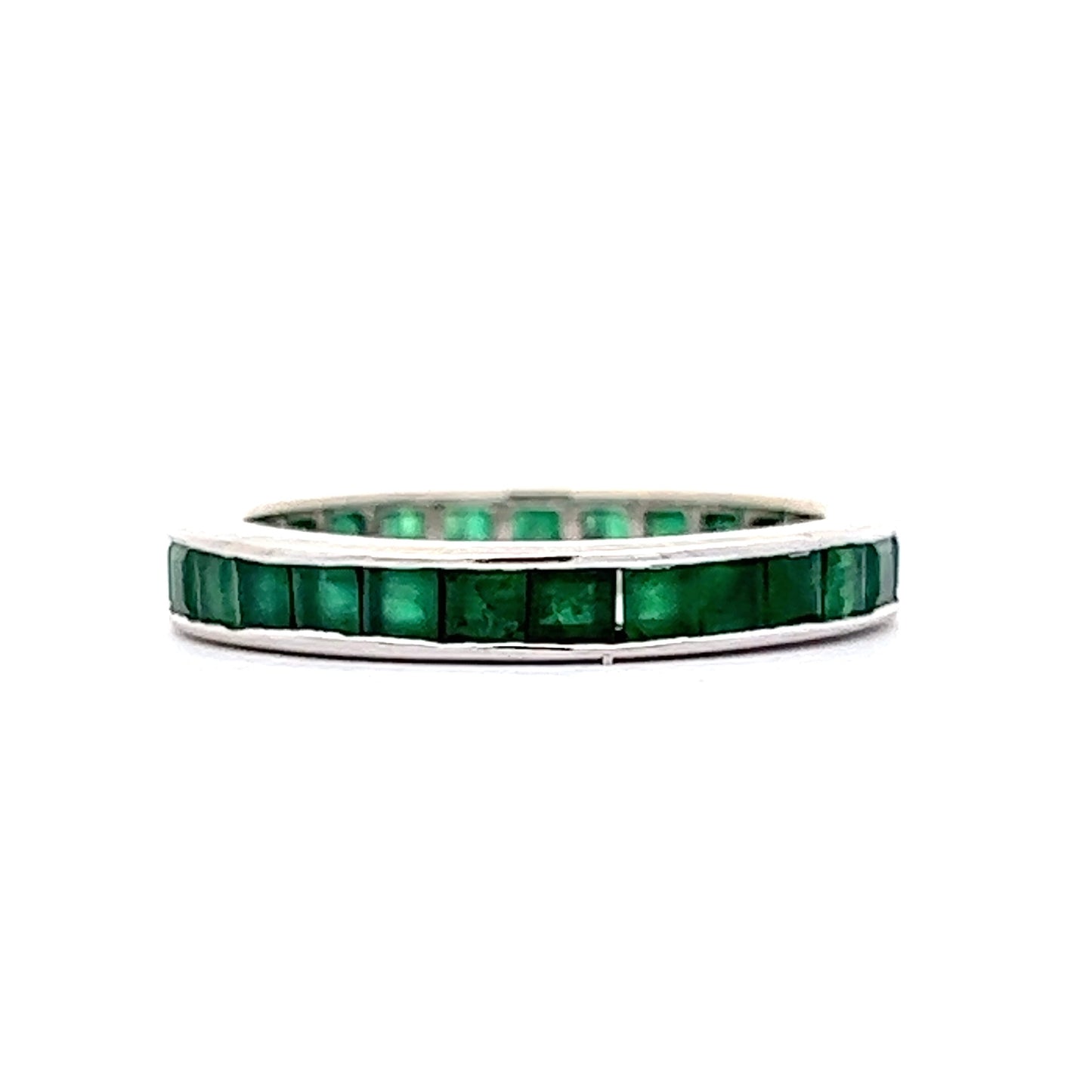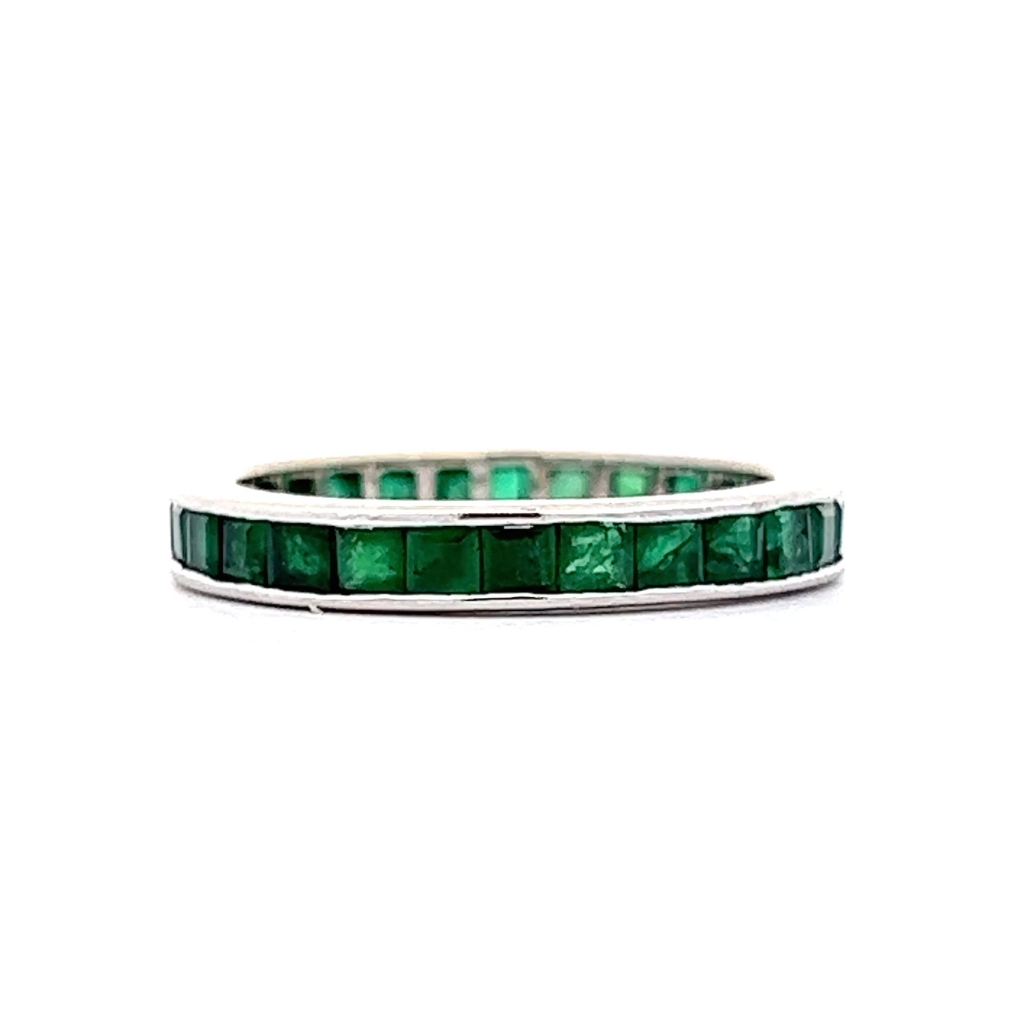 This modern eternity band is crafted from 18 karat white gold for a stunning look. Featuring a contemporary channel set design, this ring includes ten (10) square cut emeralds wrapping around the entire ring. The emeralds, weighing 1.50 carats total, are of high quality and set off the brilliant white gold. This stackable ring is perfect for any occasion and will be a timeless piece in your jewelry collection.