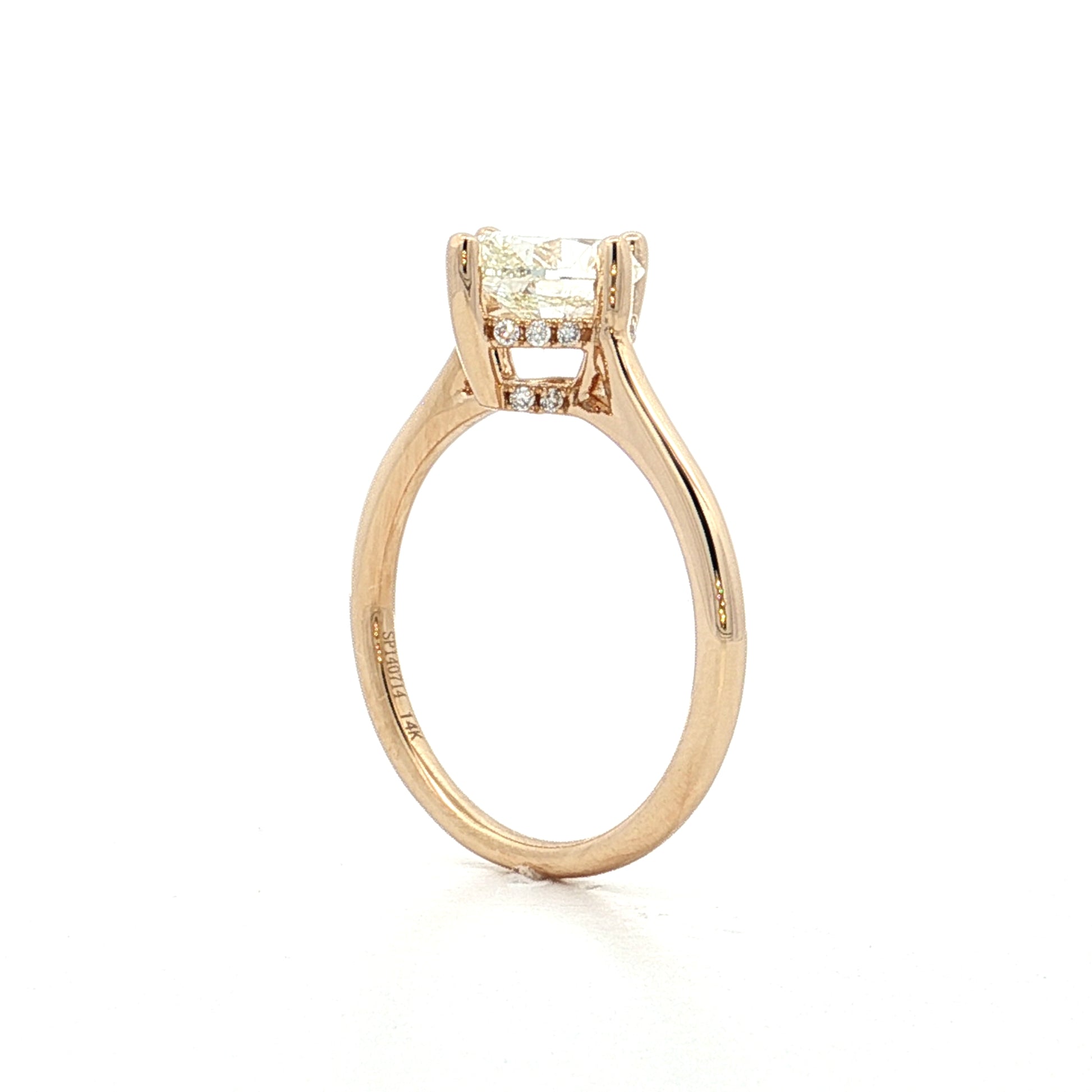 This solitaire engagement ring features a 1.50 carat oval cut diamond with VS2 clarity and K color in 14 karat yellow gold. Twenty round brilliant cut diamonds, each measuring 1.0mm and weighing .005 carats, form a double hidden halo beneath the center stone for an additional .10 carats. The total diamond weight reaches 1.60 carats in this modern design. The hidden halo placement adds sparkle that reflects upward through the main diamond while remaining concealed from the top view.