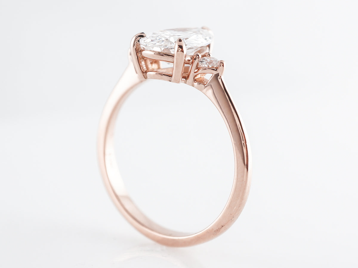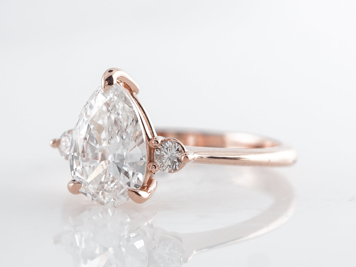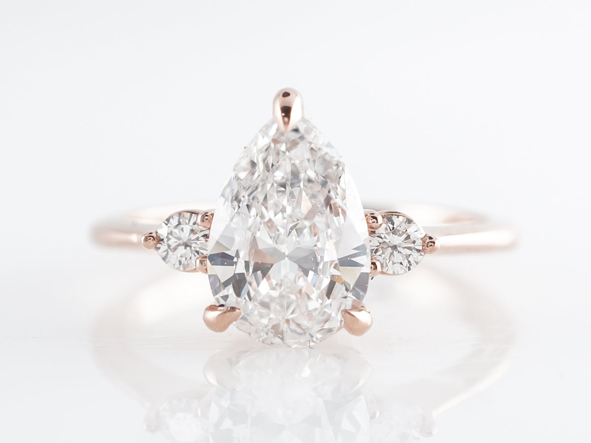 1.50 Pear Cut Diamond Engagement Ring 14k Rose Gold. This beautiful engagement ring features a GIA certified 1.51 carat pear cut diamond set in 14 karat rose gold. The pear cut is flanked by two (2) .04 carat round brilliant cut diamonds for a little bit of symmetry and extra sparkle. The E color center stone contrasts so well with the warm rose gold to create a clean and elegant look.