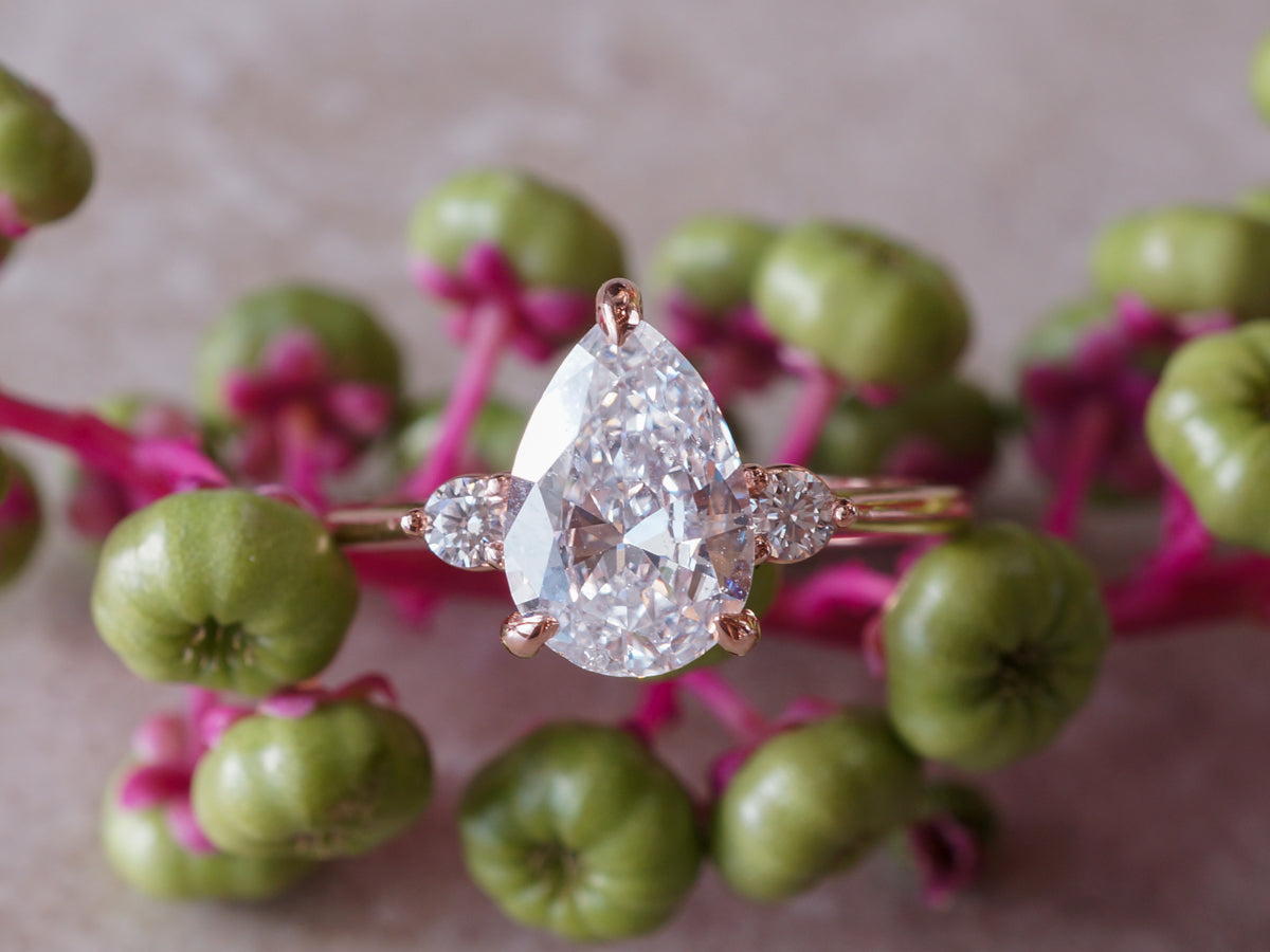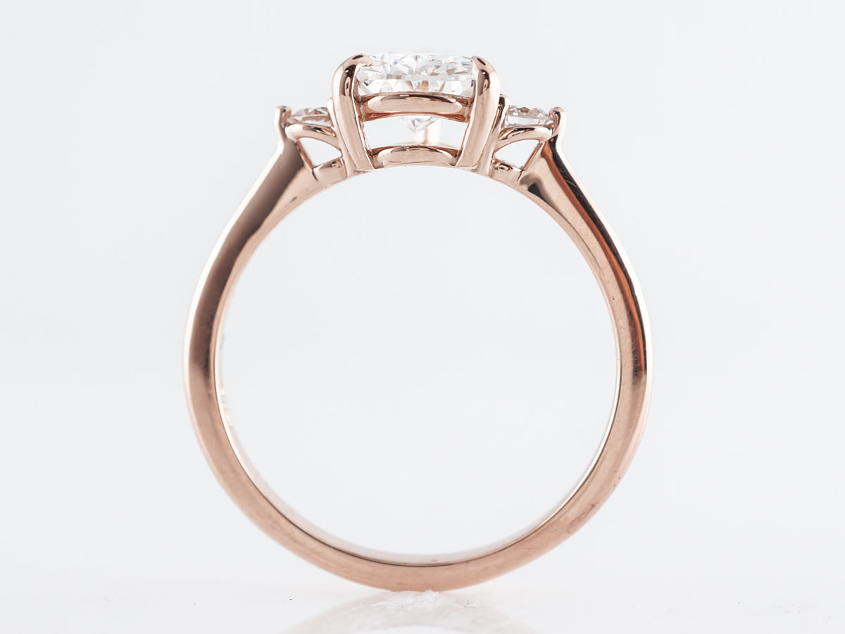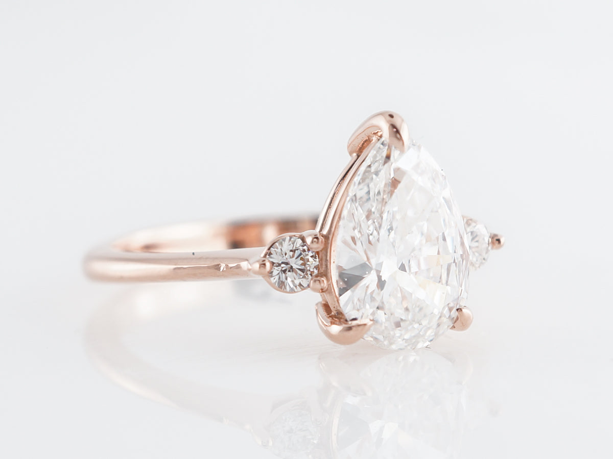 1.50 Pear Cut Diamond Engagement Ring 14k Rose Gold. This beautiful engagement ring features a GIA certified 1.51 carat pear cut diamond set in 14 karat rose gold. The pear cut is flanked by two (2) .04 carat round brilliant cut diamonds for a little bit of symmetry and extra sparkle. The E color center stone contrasts so well with the warm rose gold to create a clean and elegant look.