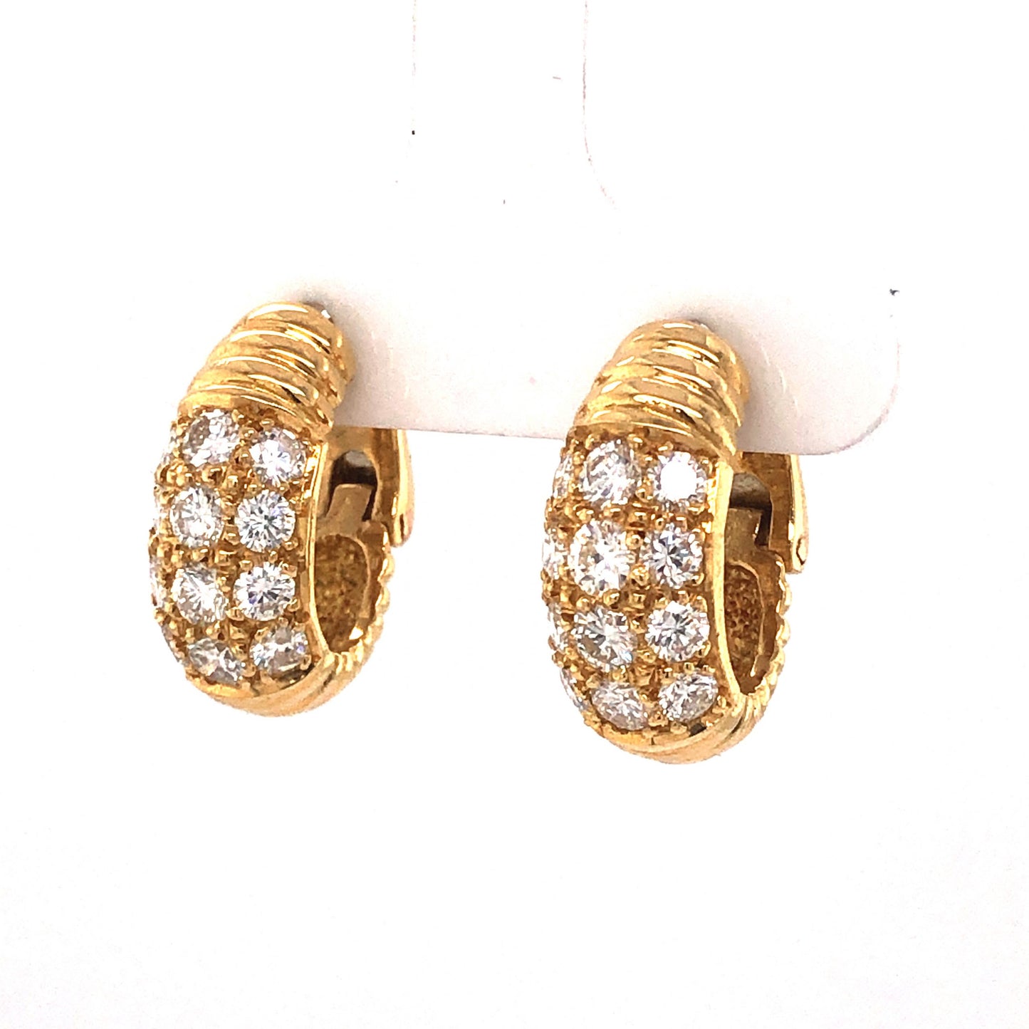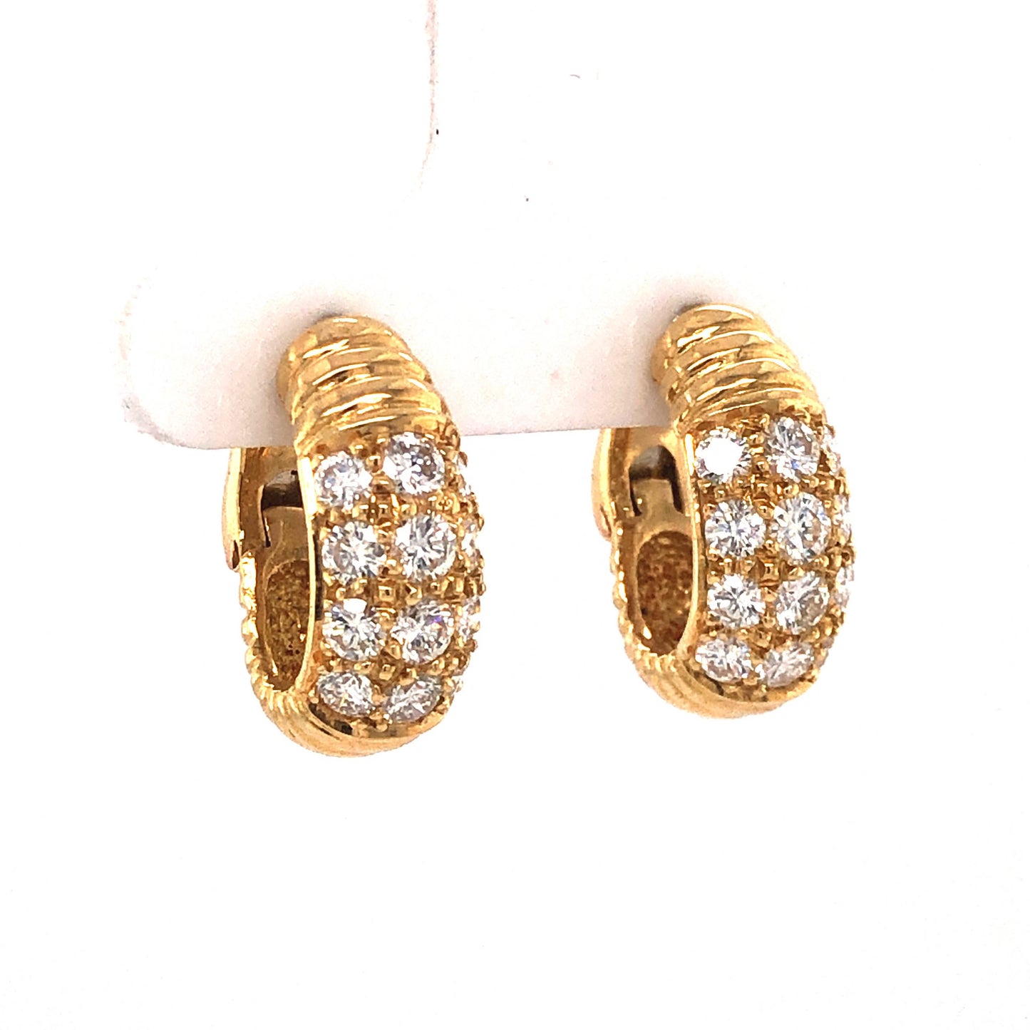 Chic sparkling! These bold and textured hoop earrings feature 1.50 carats of Round Brilliant cut diamonds in polished 18 karat yellow gold. Twenty-four (24) colorless diamonds sparkle against the golden setting. Complete with linear engravings and an English lock backing. Chunky elevated. These diamond hoops are an essential pair of earrings fit for every style of wardrobe. Modern expertly designed.