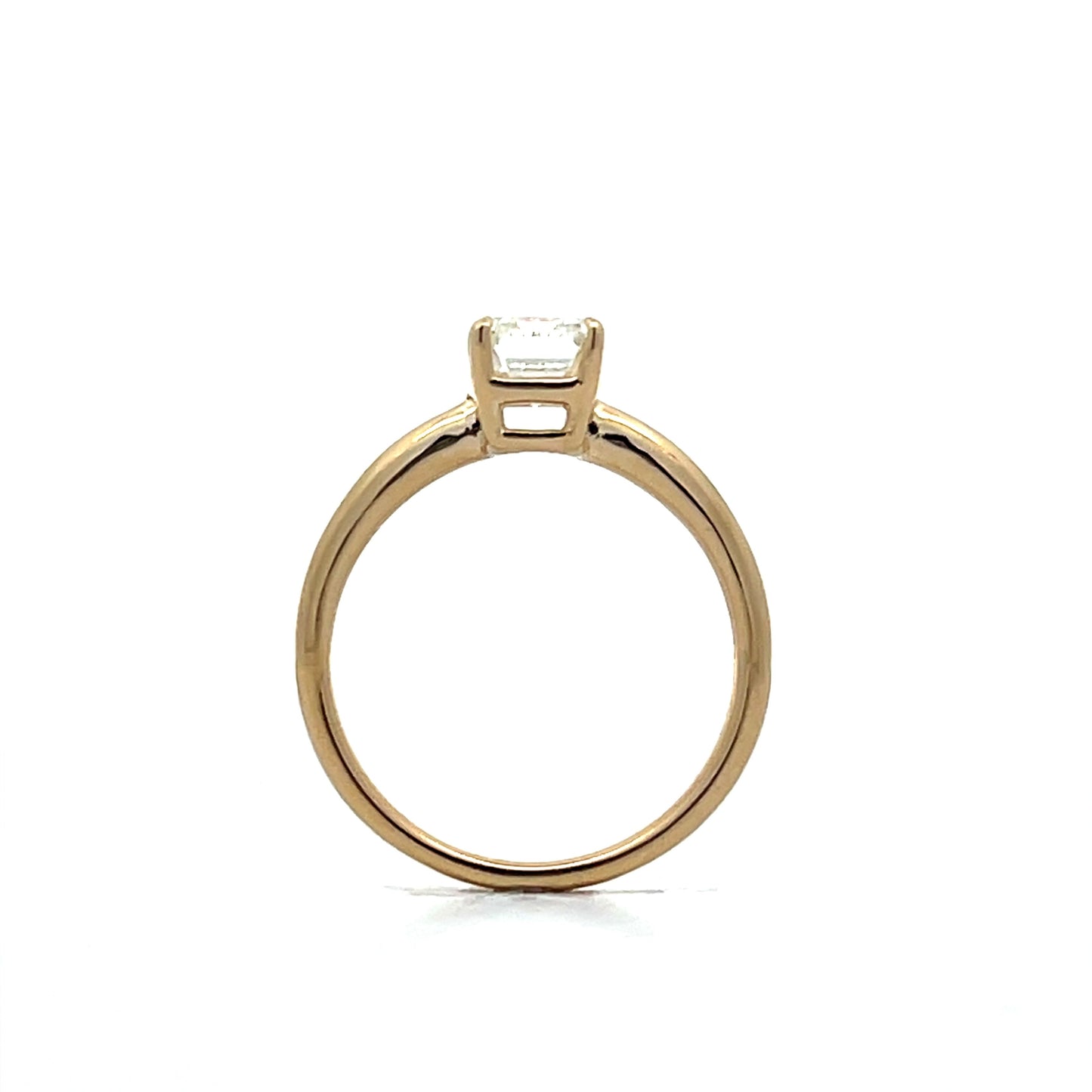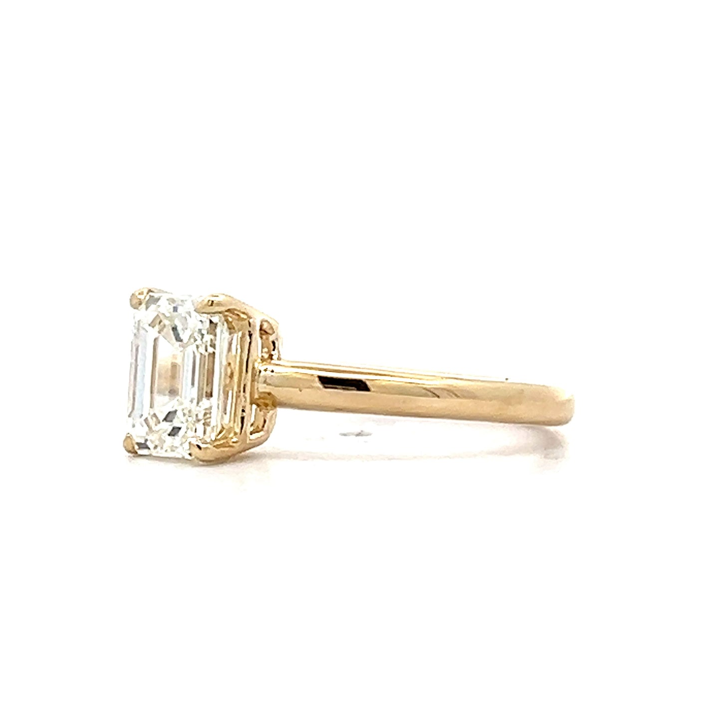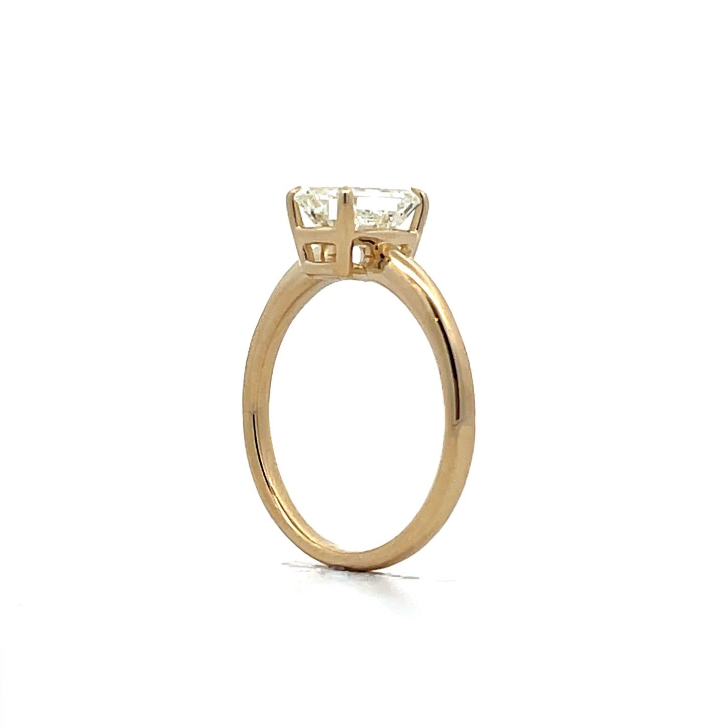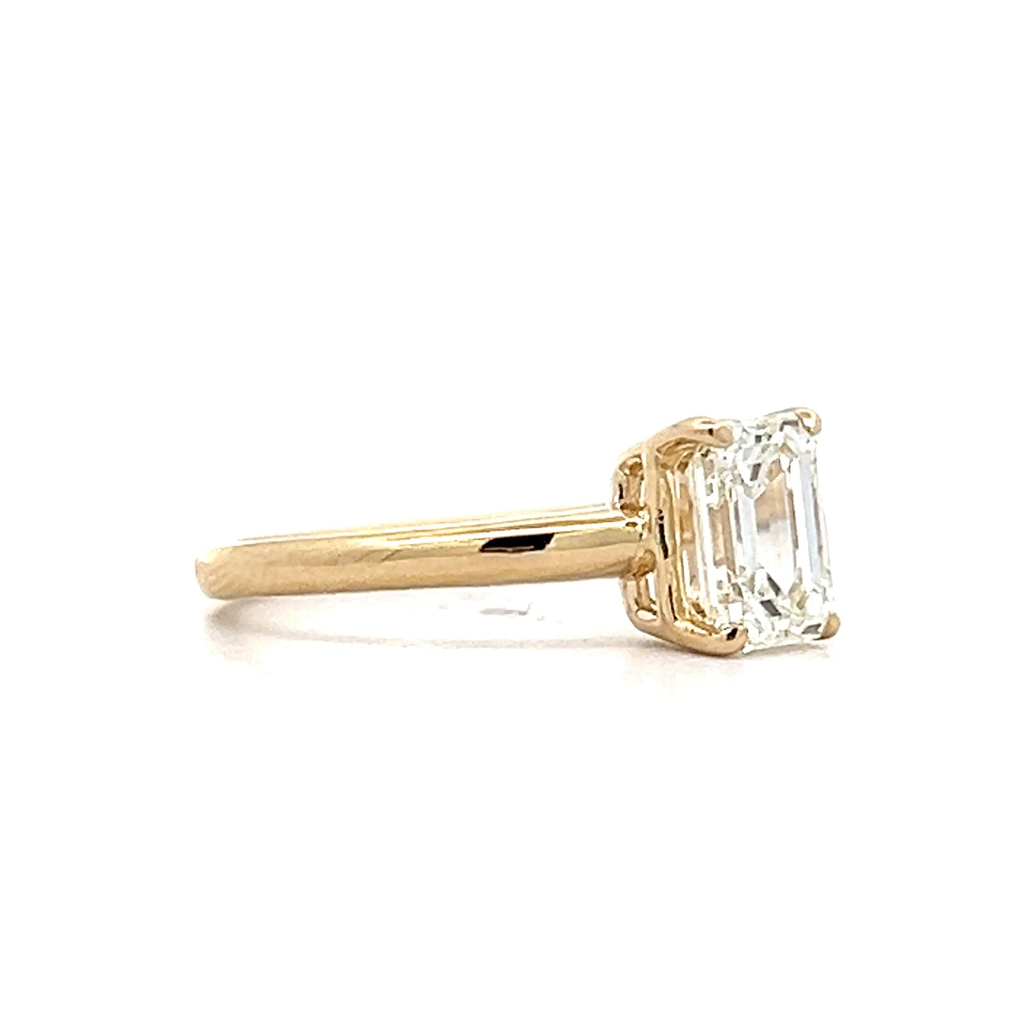 This 14 karat yellow gold solitaire engagement ring features a 1.51 carat emerald-cut diamond with VS2 clarity and a J color grade. The diamond is set in a four-prong basket for security and visibility, allowing its angular shape to stand out. The smooth yellow gold band complements the diamond, adding warmth to the overall design. This piece combines simplicity and precision, making it a solid choice for those seeking a refined design.