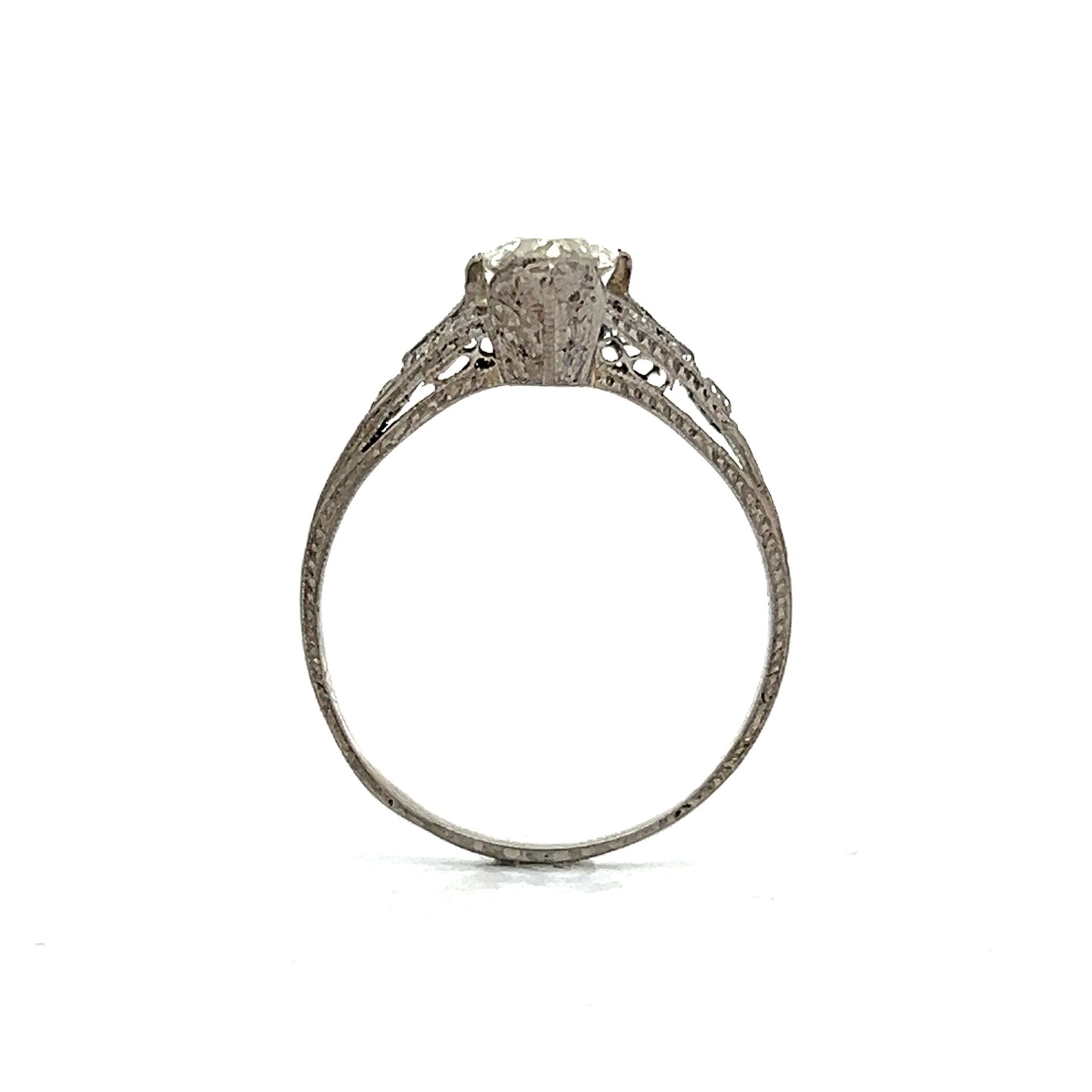 This vintage Art Deco engagement ring features a 1.51 marquise cut diamond. The center diamond is held by two prongs, one on each end and is detailed by milgrain. The outward facing side of the prongs have gorgeous engravings, from chevron to decorative. On the topside of the ring, the center stone is accented by old European cut diamonds with negative space adding depth. Finished in platinum, this stunning piece is a wonderful example of 1920's workmanship.