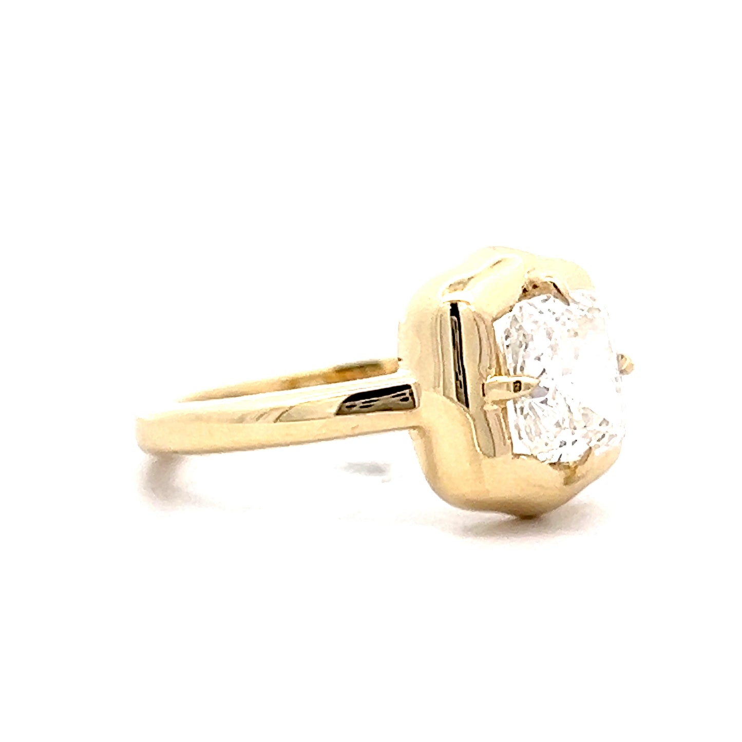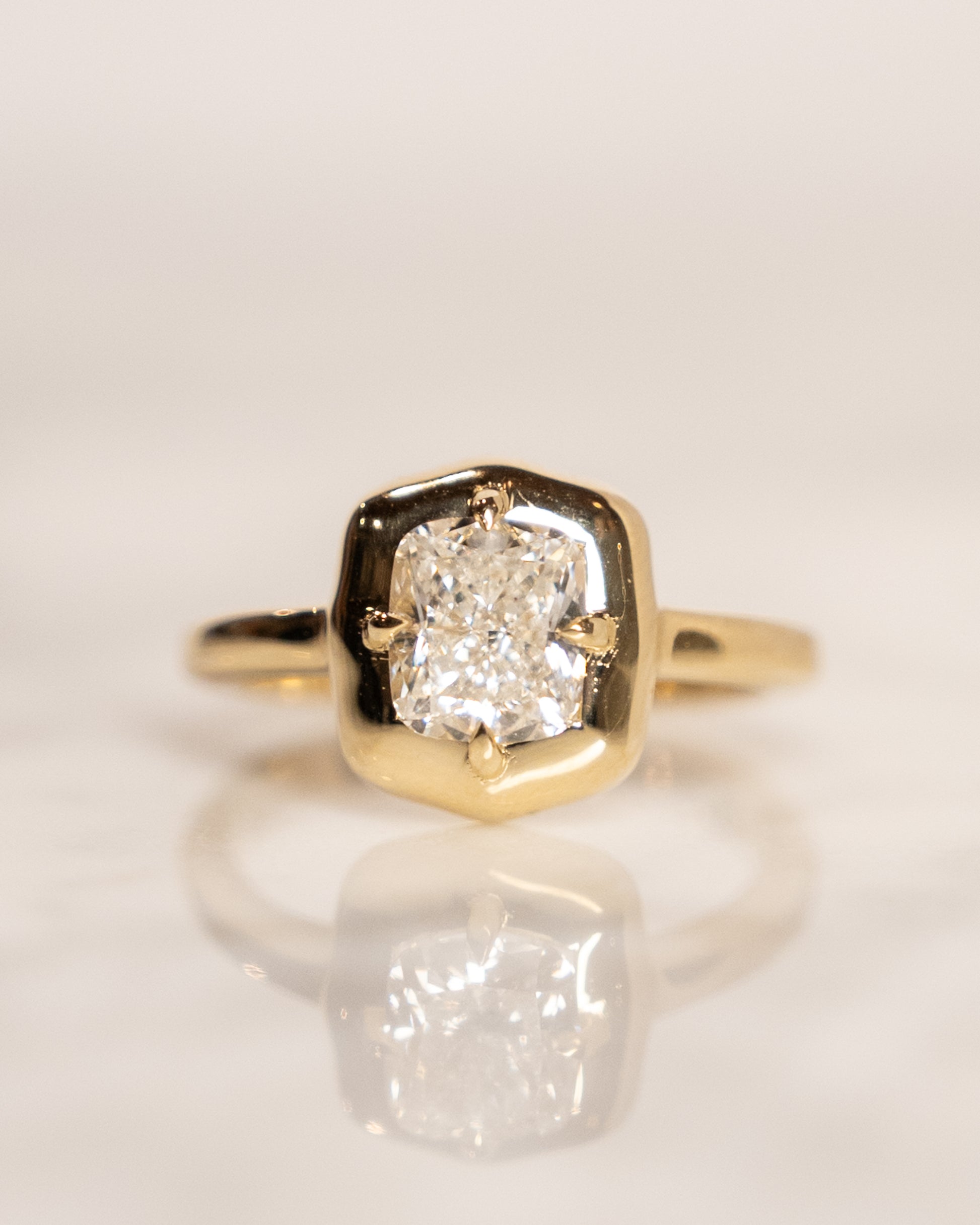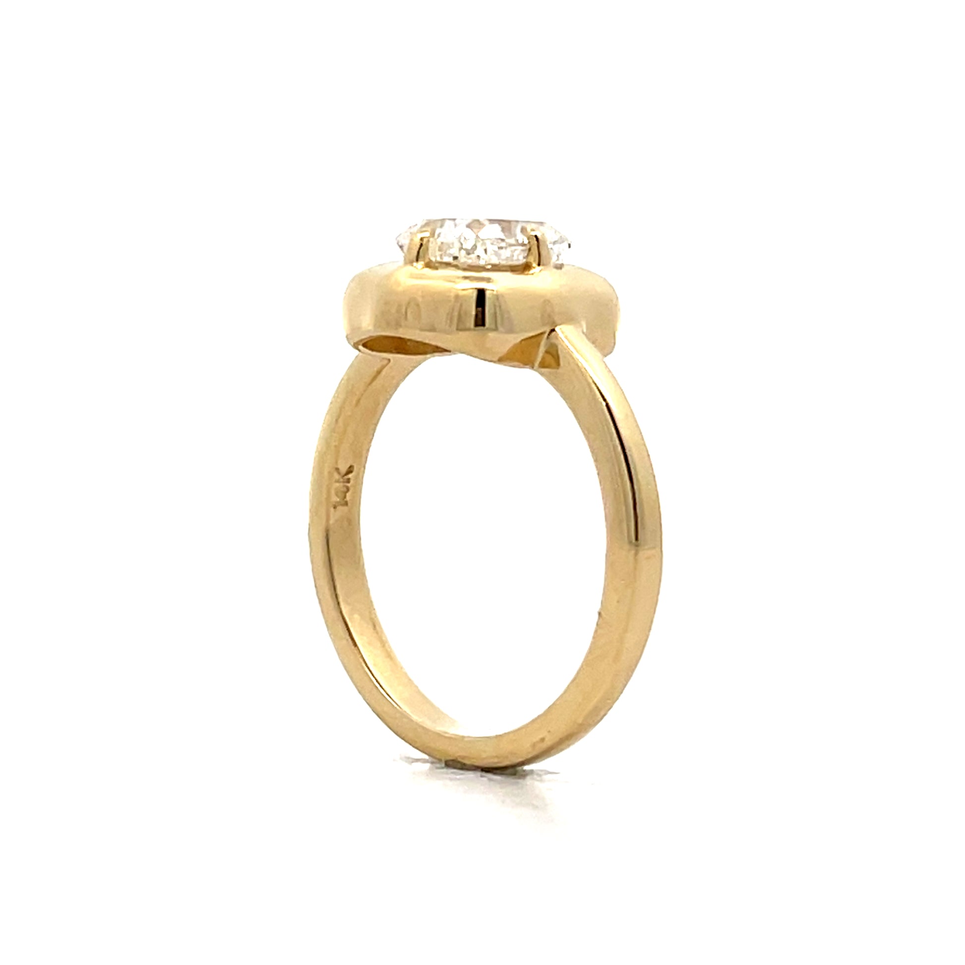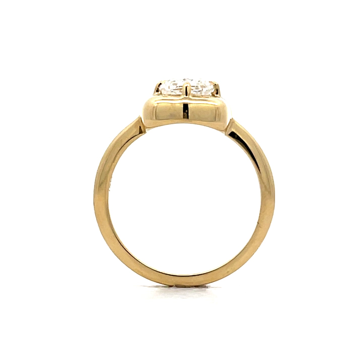 This modern solitaire engagement ring centers a GIA certified 1.53 carat cushion cut diamond with H color and SI1 clarity. The natural diamond is held by four prongs that allow light to enter from multiple angles, maximizing its brilliance. A wide gold border surrounds the stone, creating a strong visual frame that draws attention to the diamond. The ring is made from 14 karat yellow gold with a 2.3 mm shank that provides good balance between durability and comfort. The cushion cut shape offers a different look from the more common round diamonds, with faceting that creates a distinct sparkle pattern.