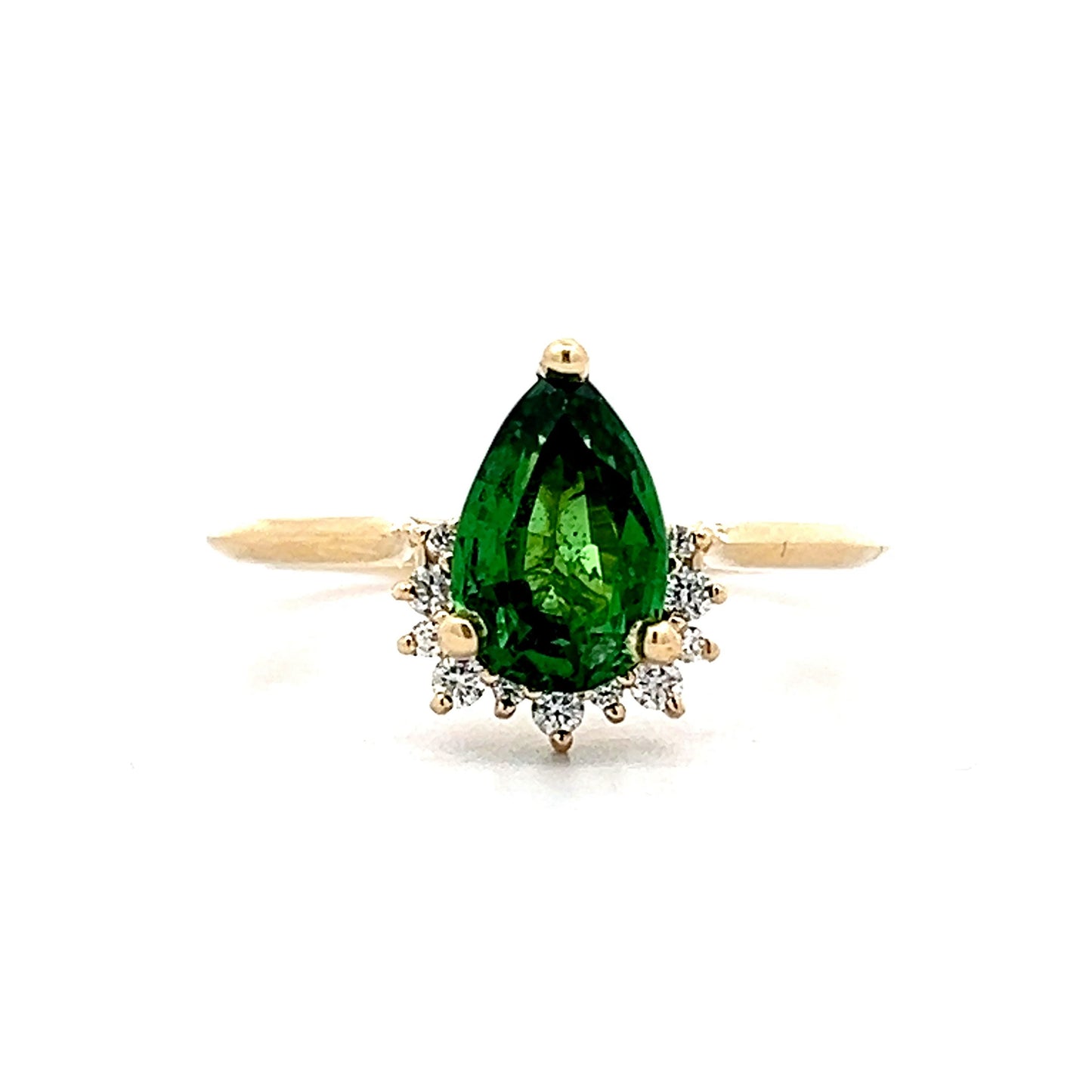 This gorgeous engagement ring features a 1.53 carat pear cut Tsavorite garnet with a half halo of diamonds. The center gemstone has a highly saturated golden-green hue, and is held by three prongs. Five (5) 1.5mm round brilliant cut diamonds of H in color and VS2-SI1 in clarity form the halo and provide a lovely hint of sparkle.  Finished in 14k yellow gold, this modern ring is a wonderful alternative gemstone engagement ring.