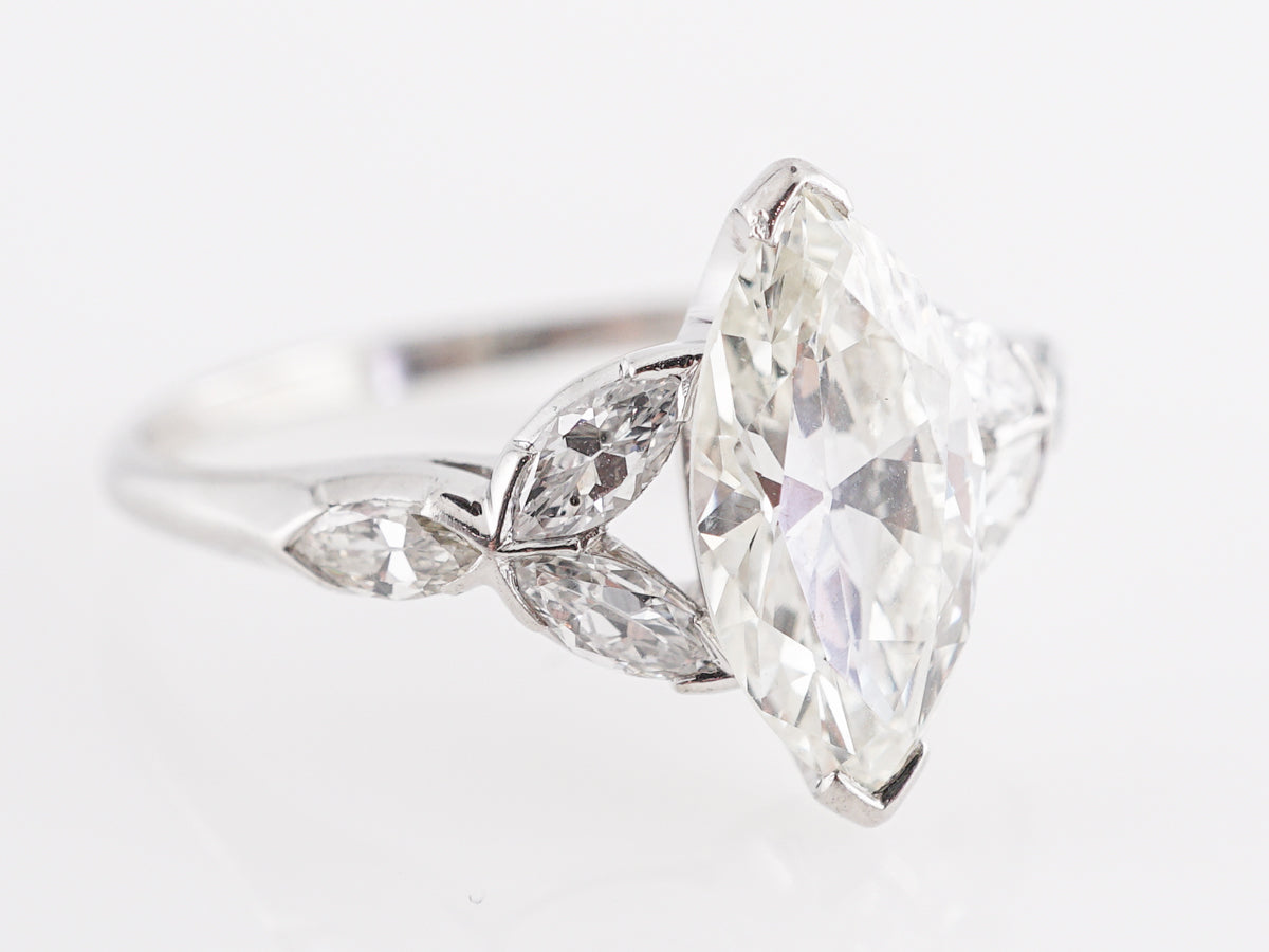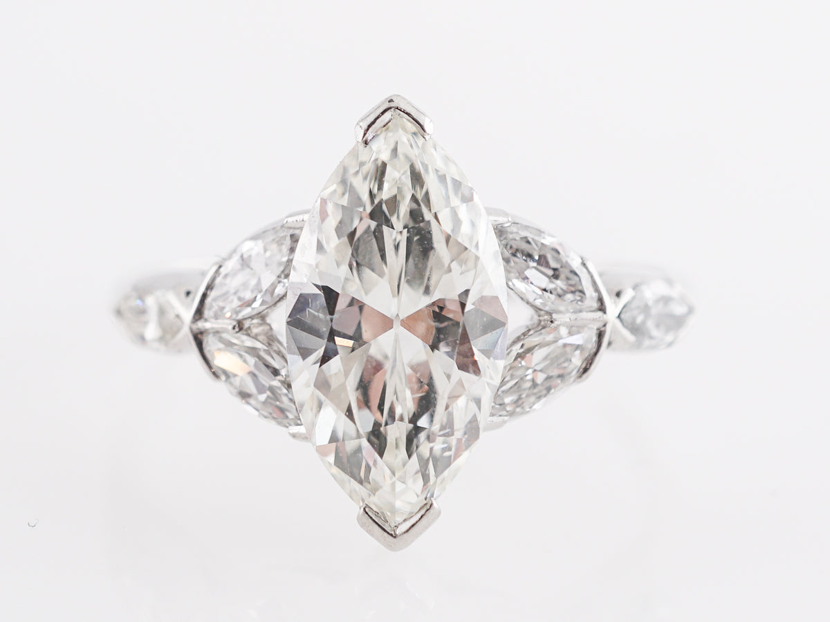 1.54 Art Deco Marquise Diamond Engagement Ring in Platinum. The primary stone has a very faint, creamy yellow tone that adds a bit of elegant contrast to the colorless accent diamonds. Four .10 carat accent marquise diamonds are angled at either side of the primary gemstone, creating an elegant junction from center stone to the platinum band. Two .09 carat secondary accent diamonds rest on the shoulders of the band. This Art Deco ring is angular and brilliant, introducing a new shape and style to classic engagement rings!
