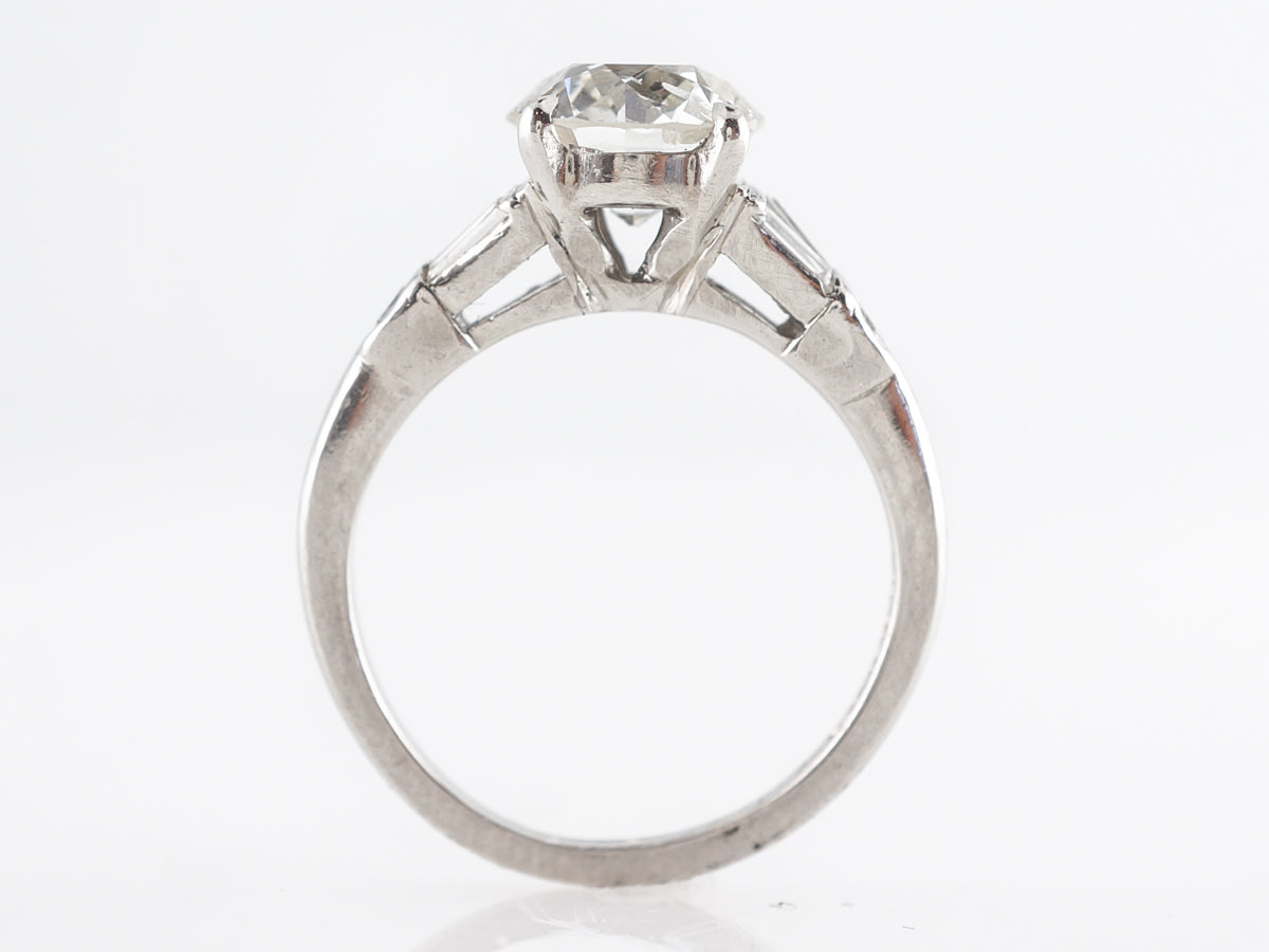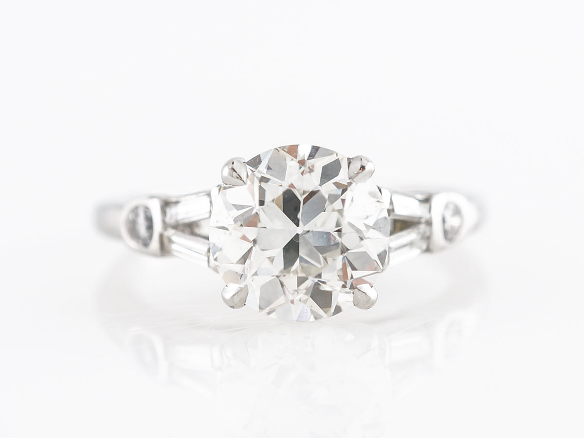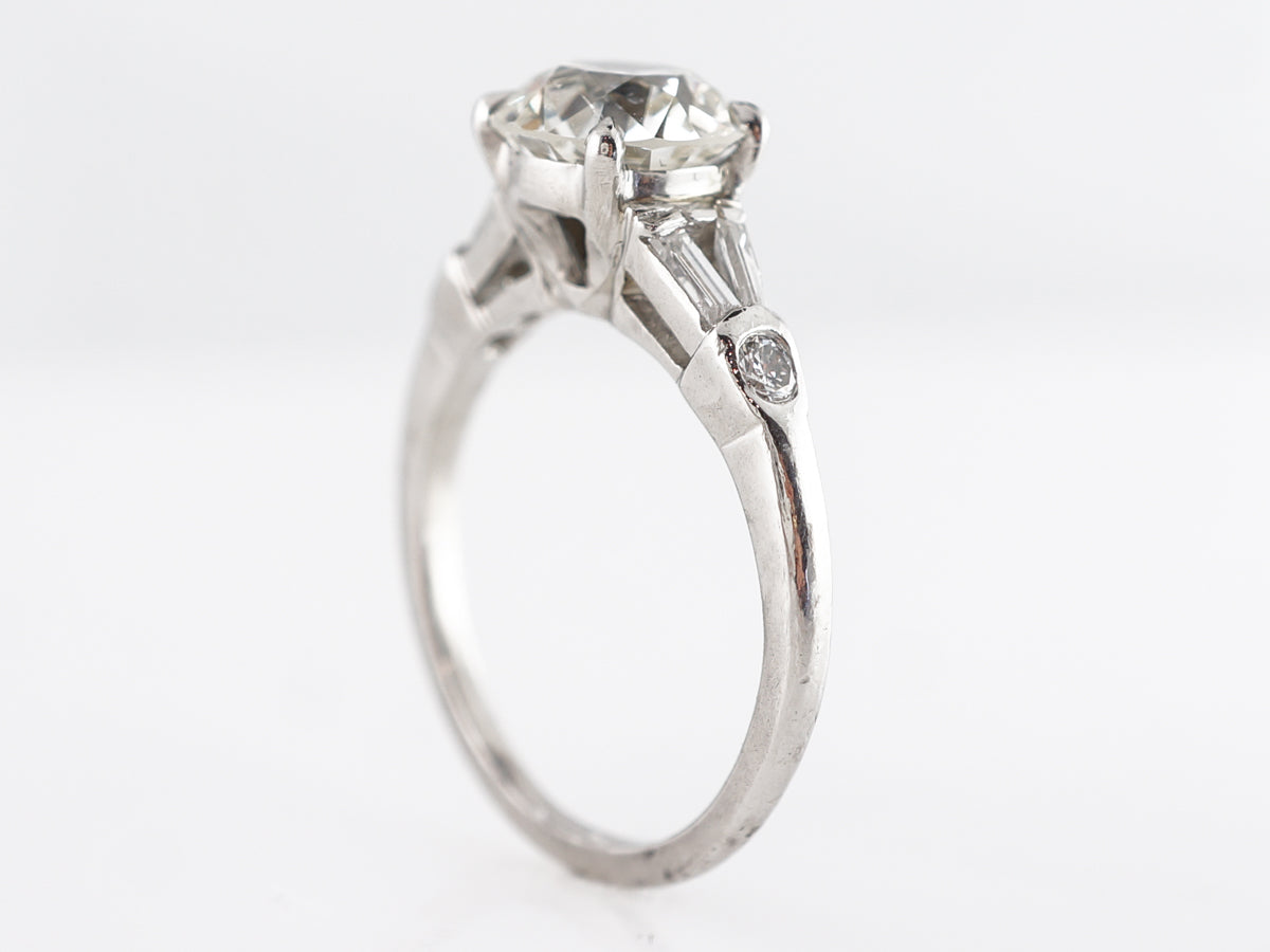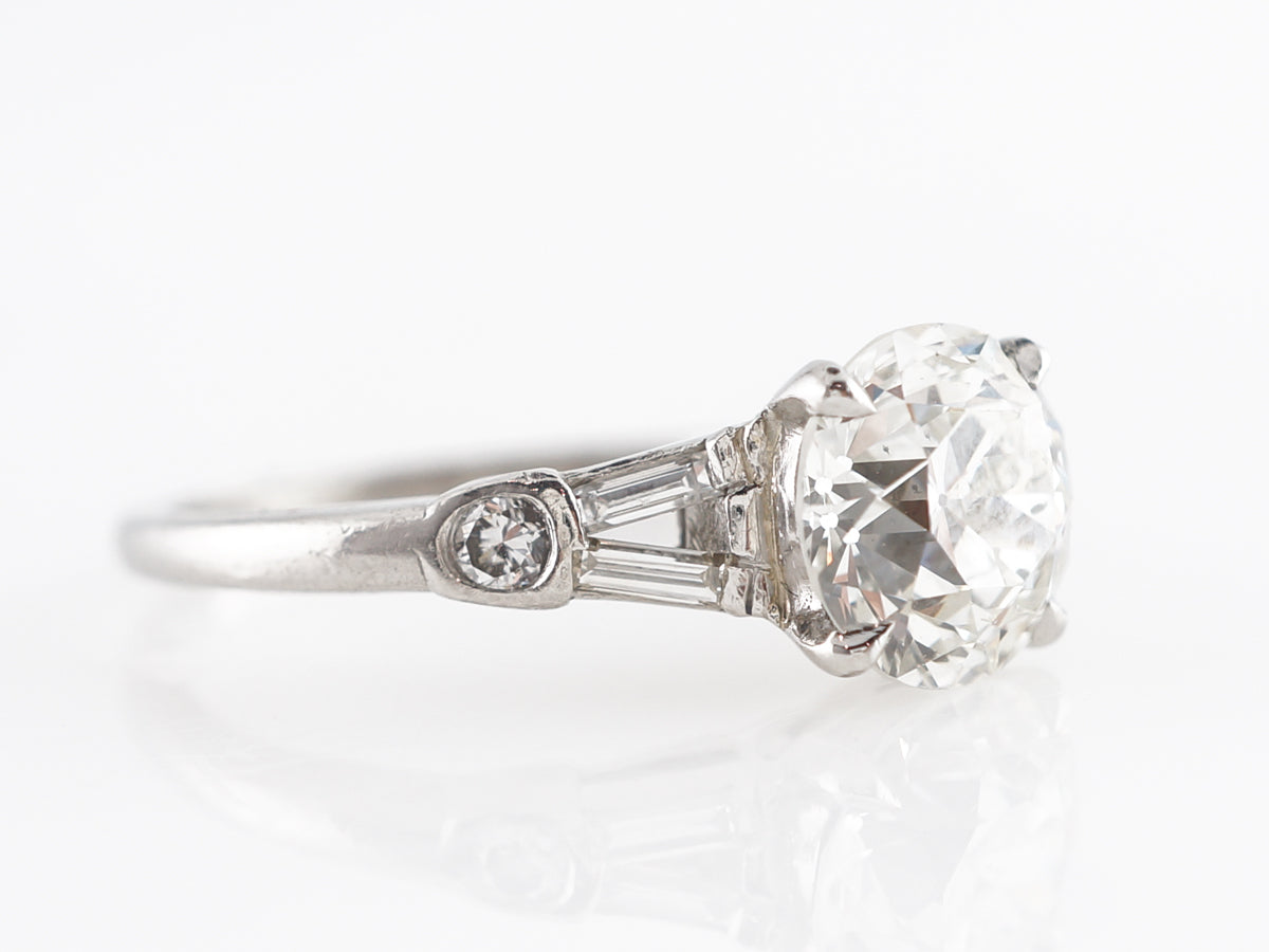 1.54 Old European Diamond Engagement Ring in Platinum. This beautiful Art Deco engagement ring features a 1.54 carat Old European cut diamond set in platinum. The center stone is GIA certified and is prong set with a lovely split shank, accented by baguette diamonds and smaller round diamonds. An excellent vintage engagement ring to stand out from the crowd while still retaining classic design cues.