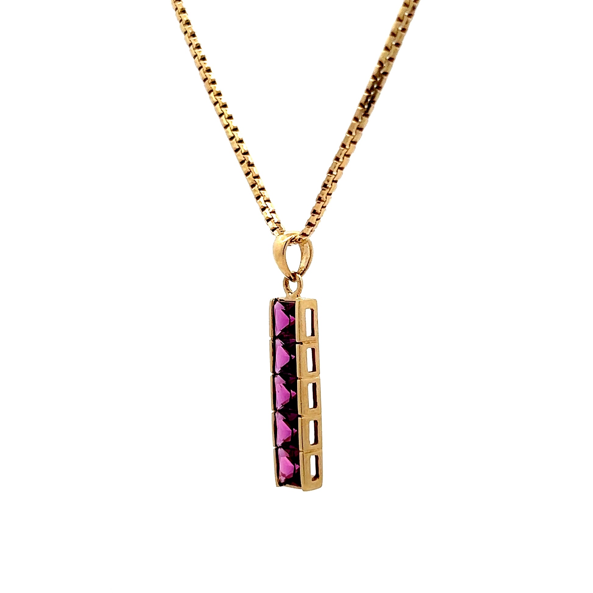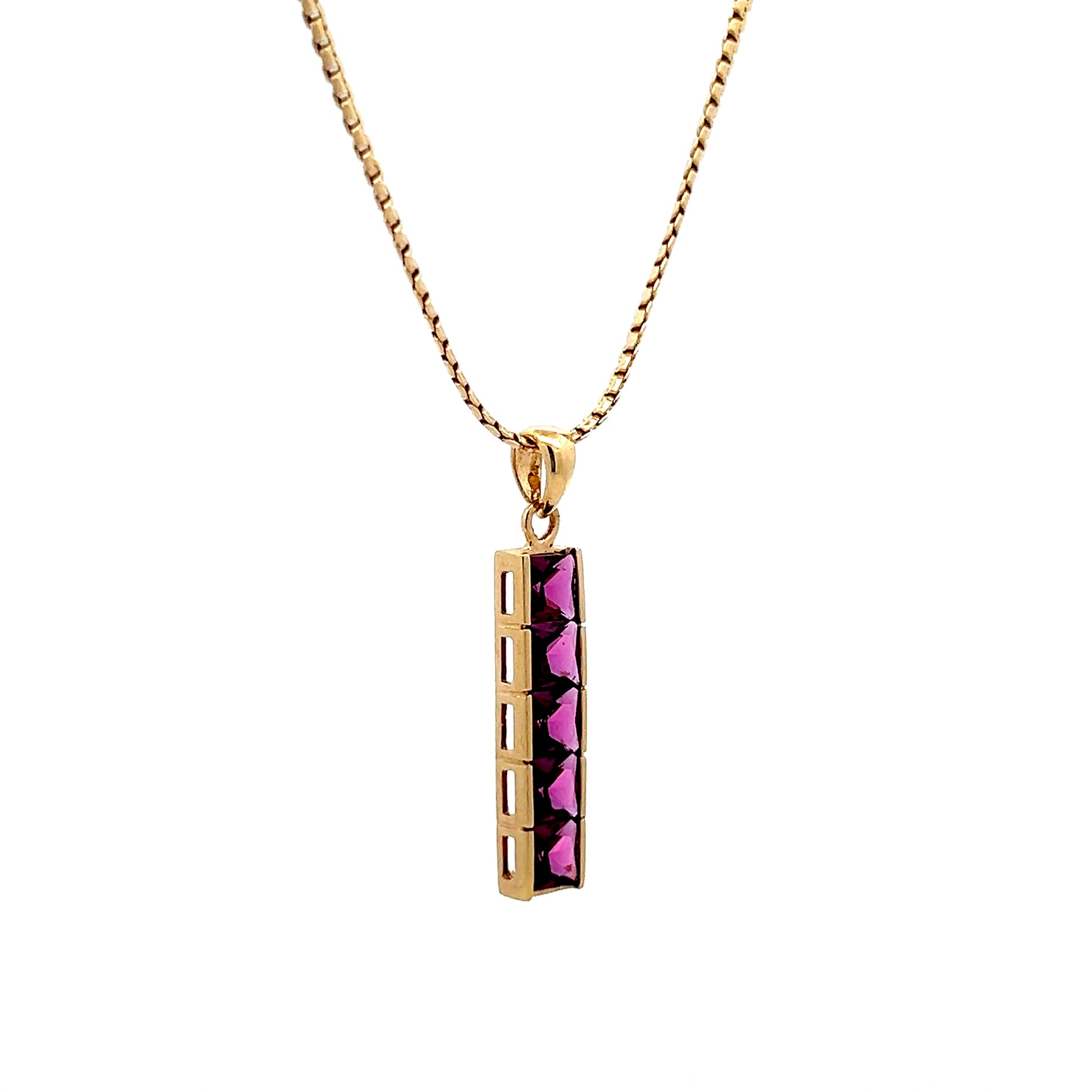This 14 karat yellow gold bar pendant features five channel-set square cut rhodolite garnets totaling 1.55 carats on a 19-inch chain. The raspberry-red to purplish-red garnets sit protected within the channel while their square cuts catch light from multiple angles. The deep red of the rhodolite garnets plays beautifully against the yellow gold setting, making this pendant striking whether worn alone or layered.