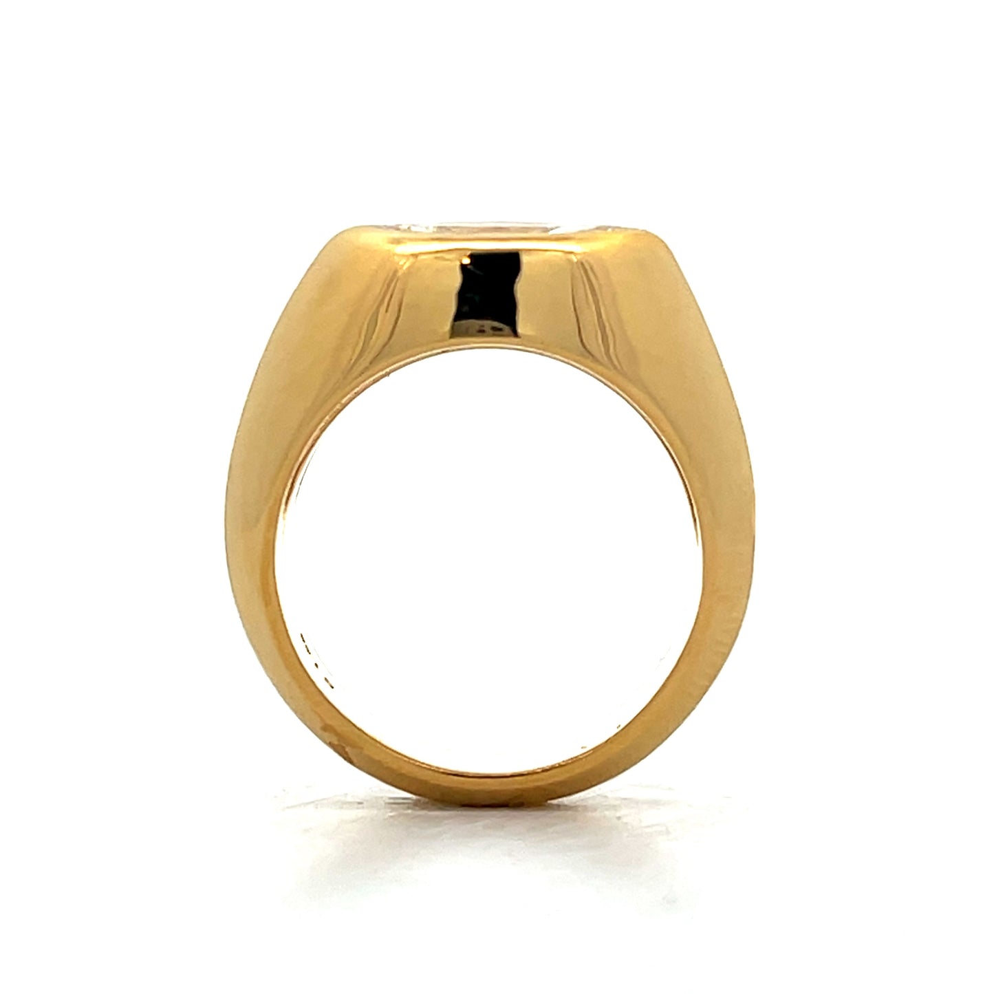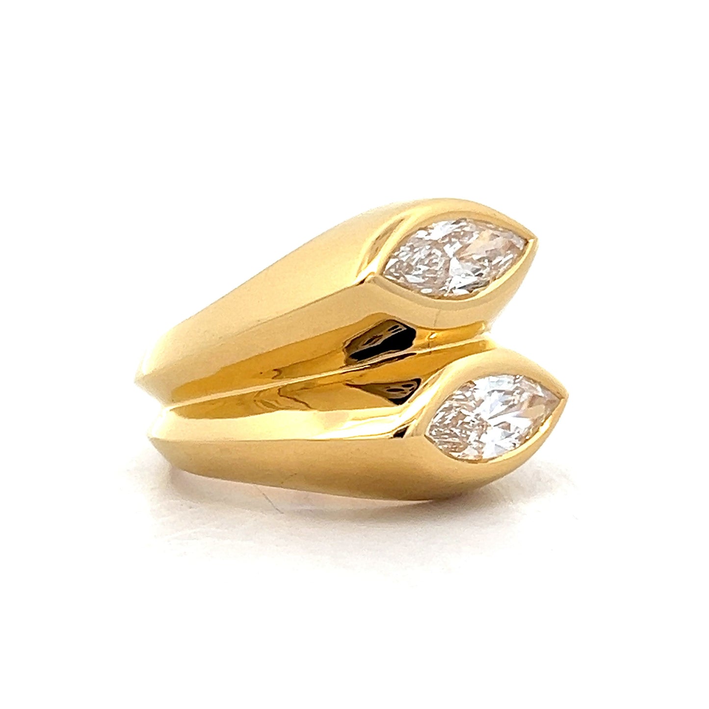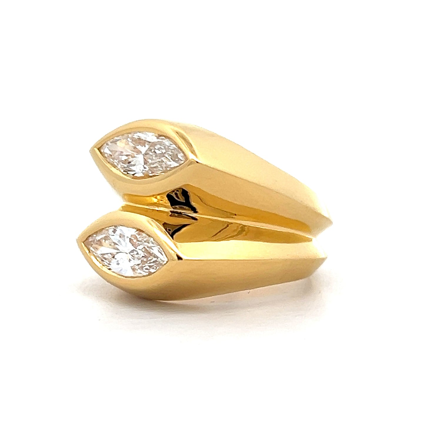 This chic cocktail ring features two marquise cut diamonds that are beautifully bezel-set for a sleek, modern design. The main diamond weighs .85 carats, while the accent diamond adds another .73 carats, both with SI1 clarity and a vibrant G color. Set in an 18k yellow gold band, the ring balances warmth and elegance with a minimalist approach. The stacked design gives the ring a contemporary feel, making it perfect for both everyday wear.