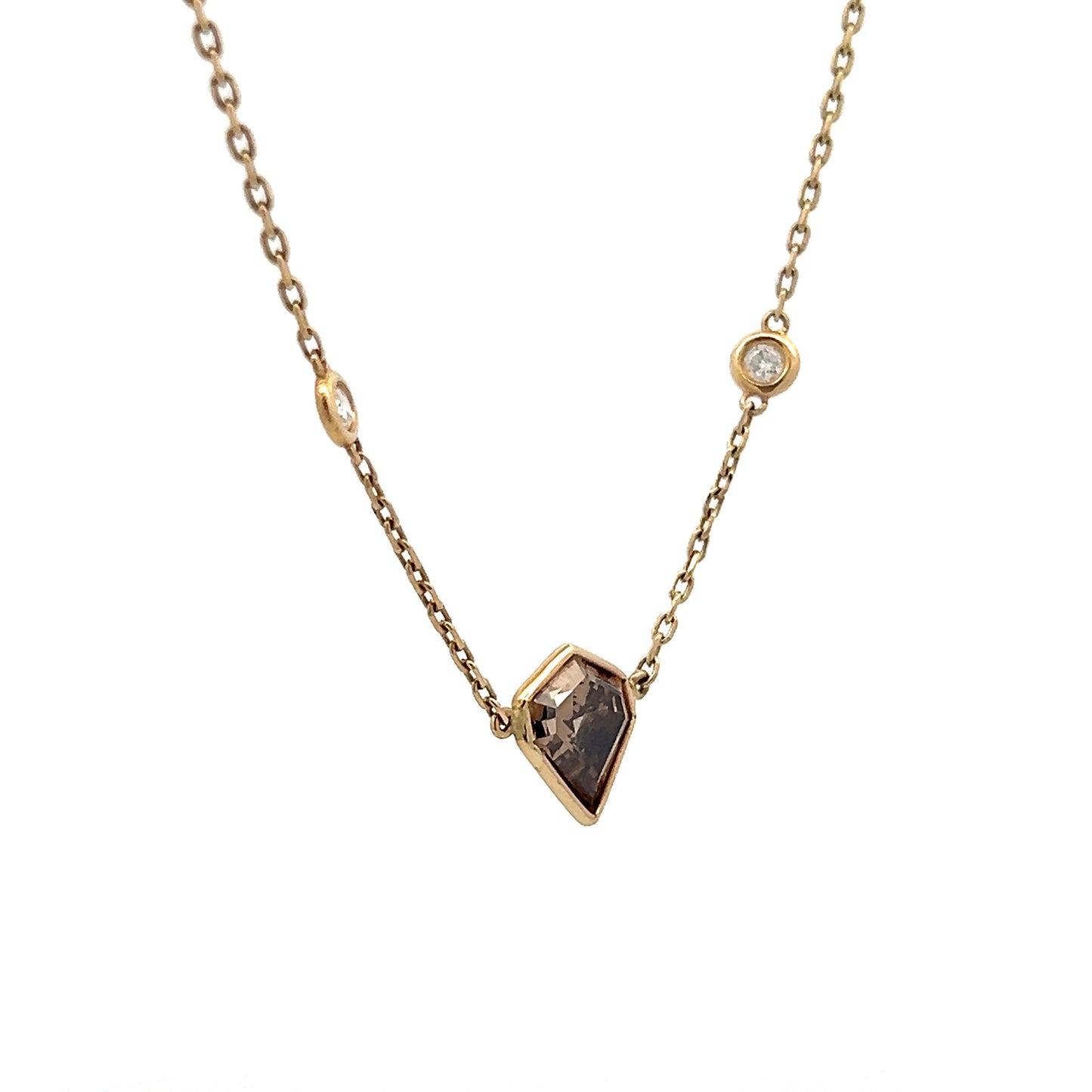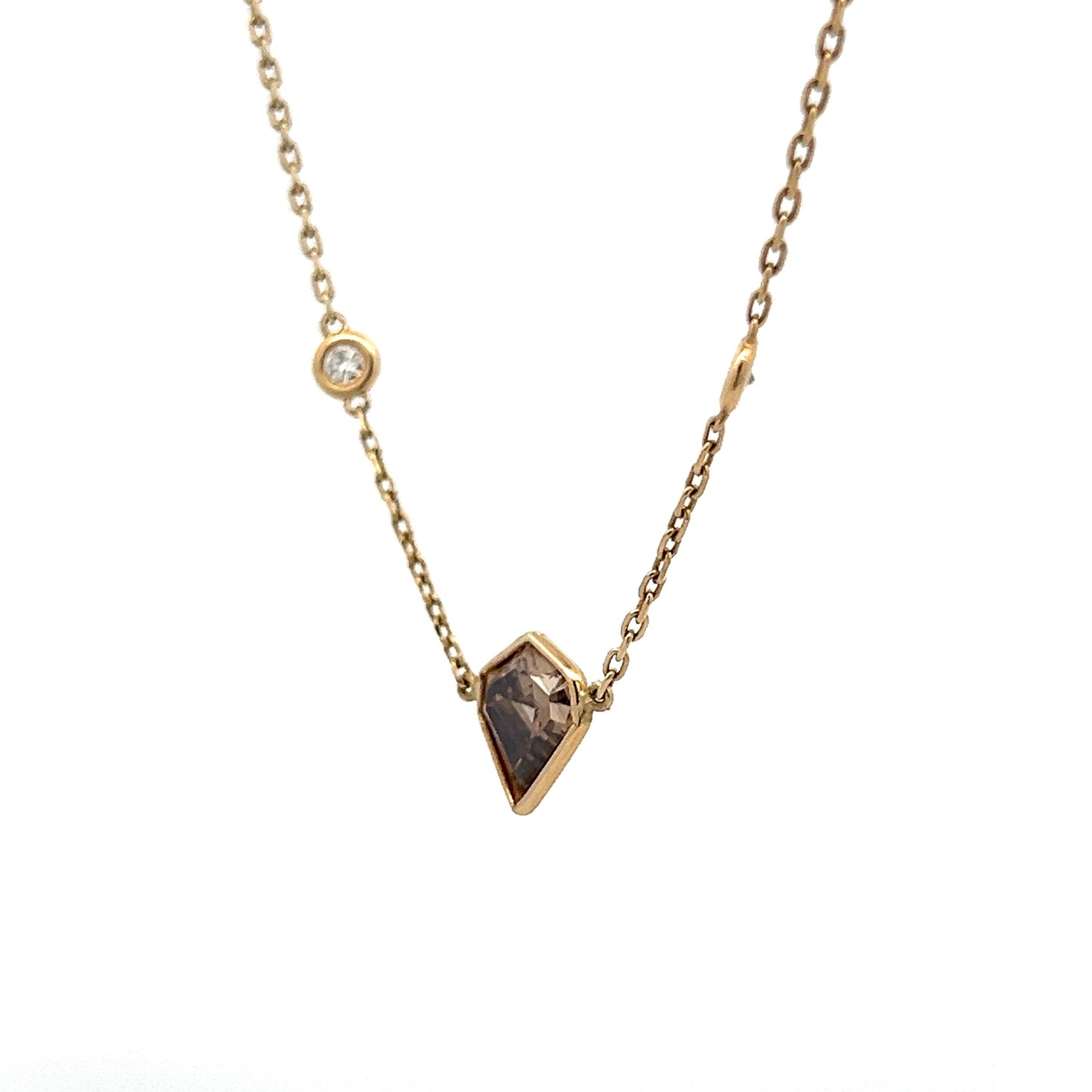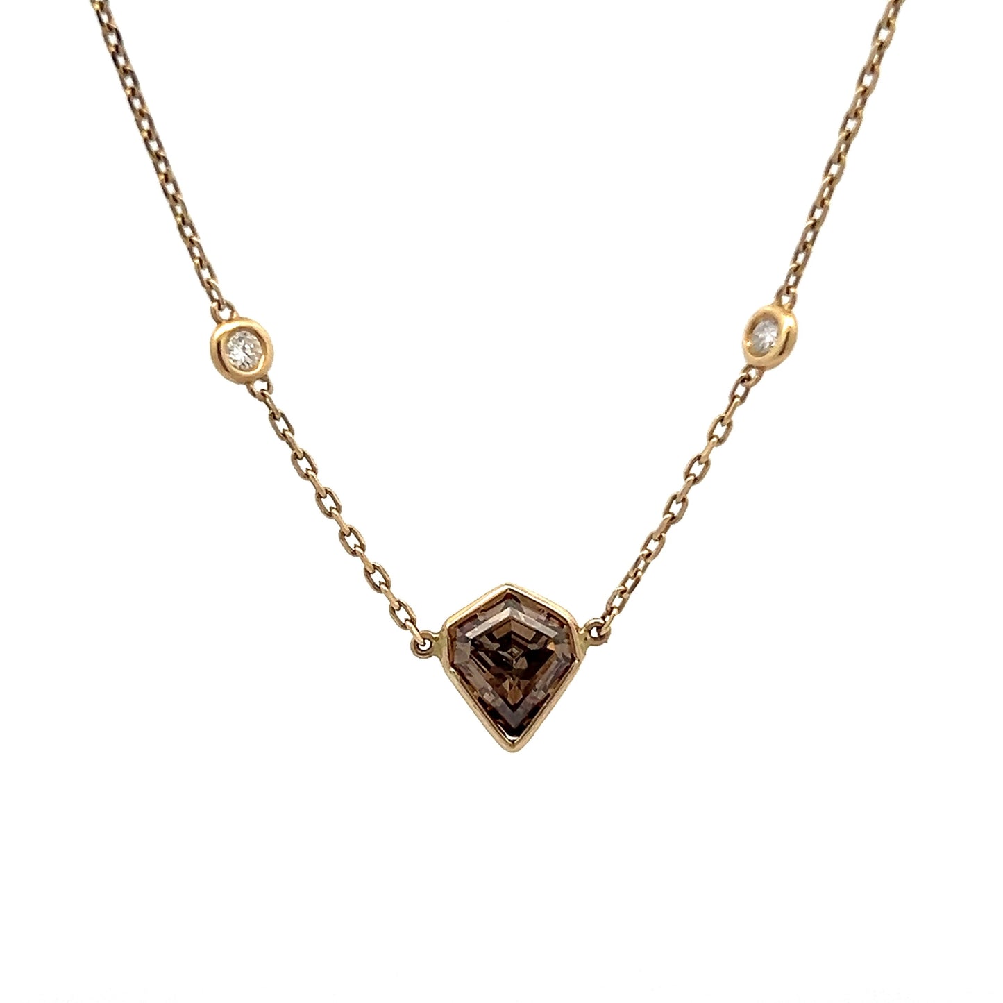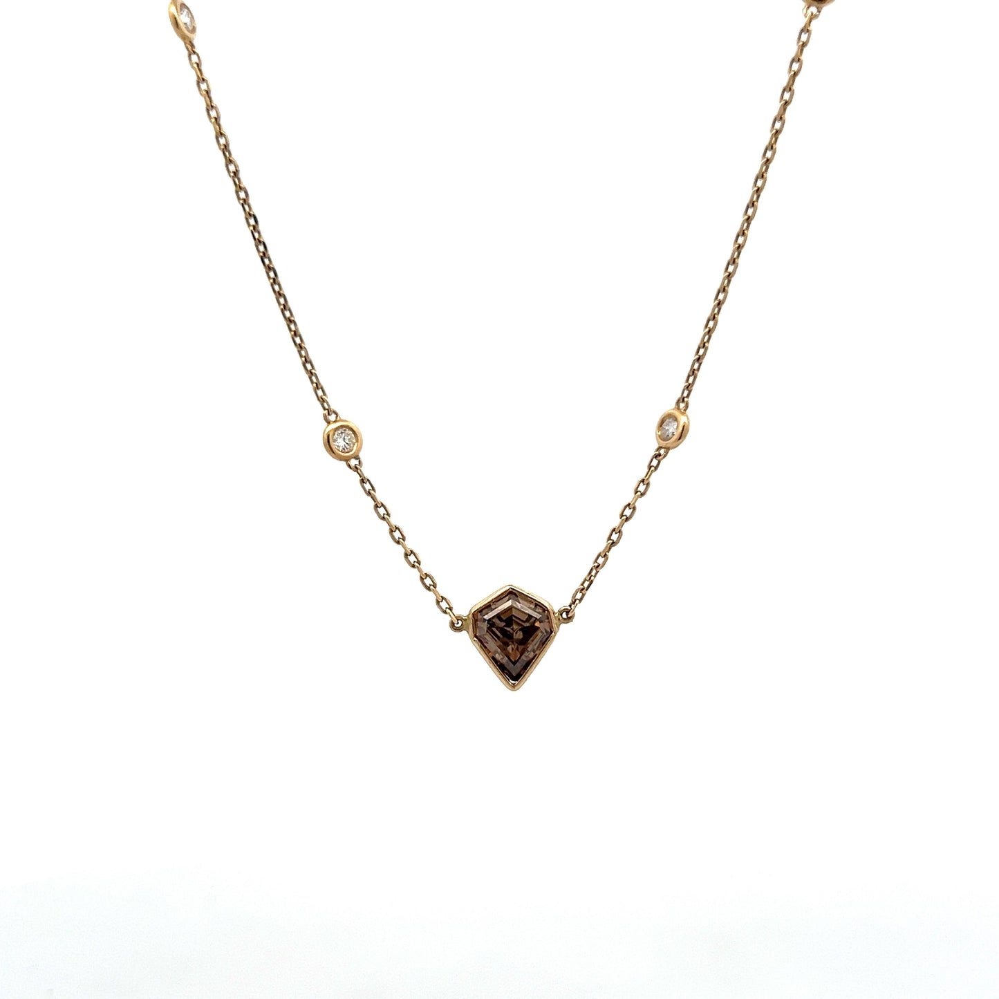 This pendant necklace showcases a captivating kite-shaped diamond at its center. Weighing 1.59 carats, the Fancy Dark Brown diamond features VS2 clarity and dimensions of 8.50 x 7.57 x 4.35 mm. Accenting the central diamond are ten round brilliant cut diamonds, each measuring 2.25 mm and collectively weighing .40 carats. These accent diamonds are elegantly bezel set along the 14k yellow gold chain, enhancing the necklace's radiant appearance.