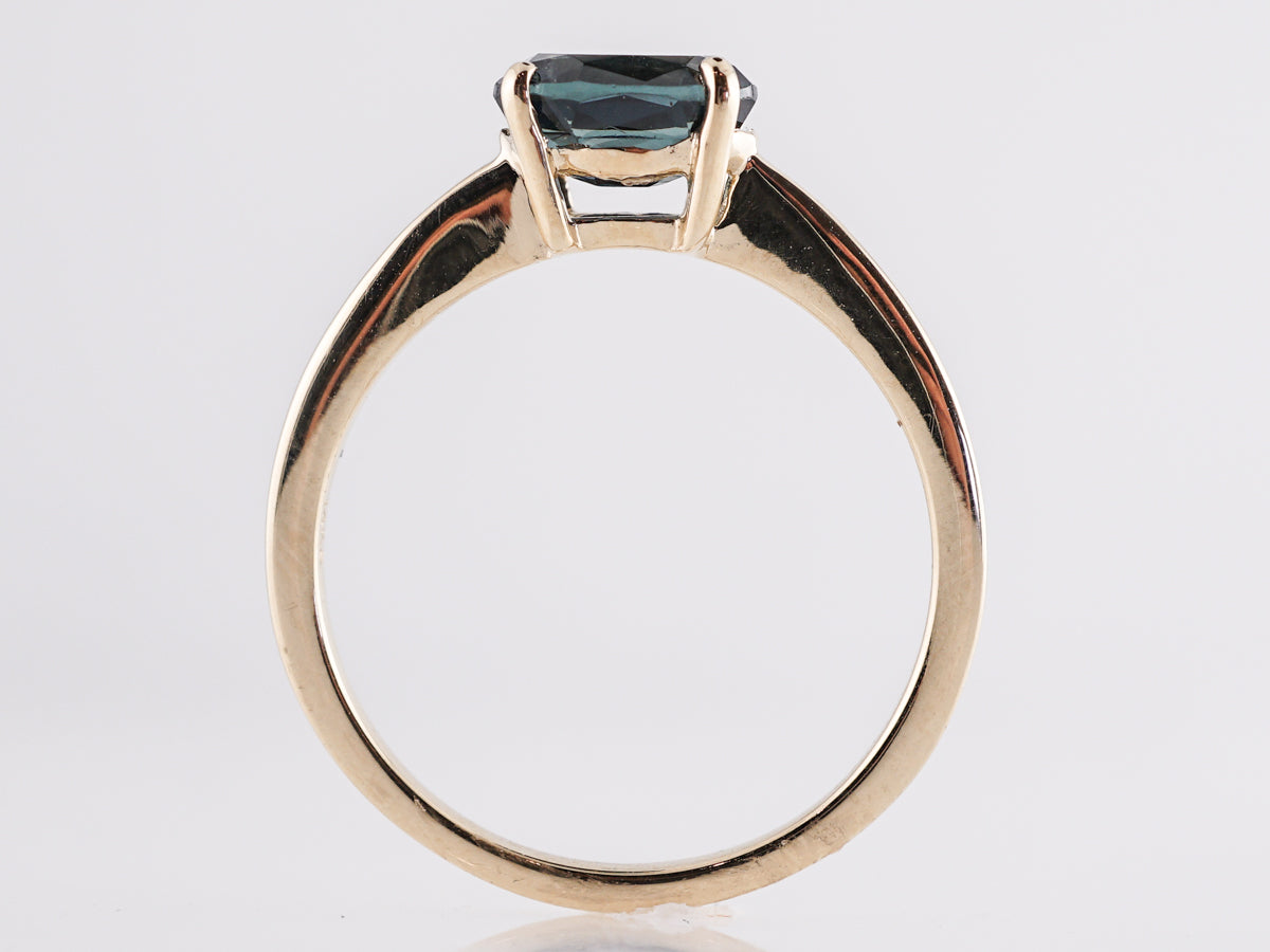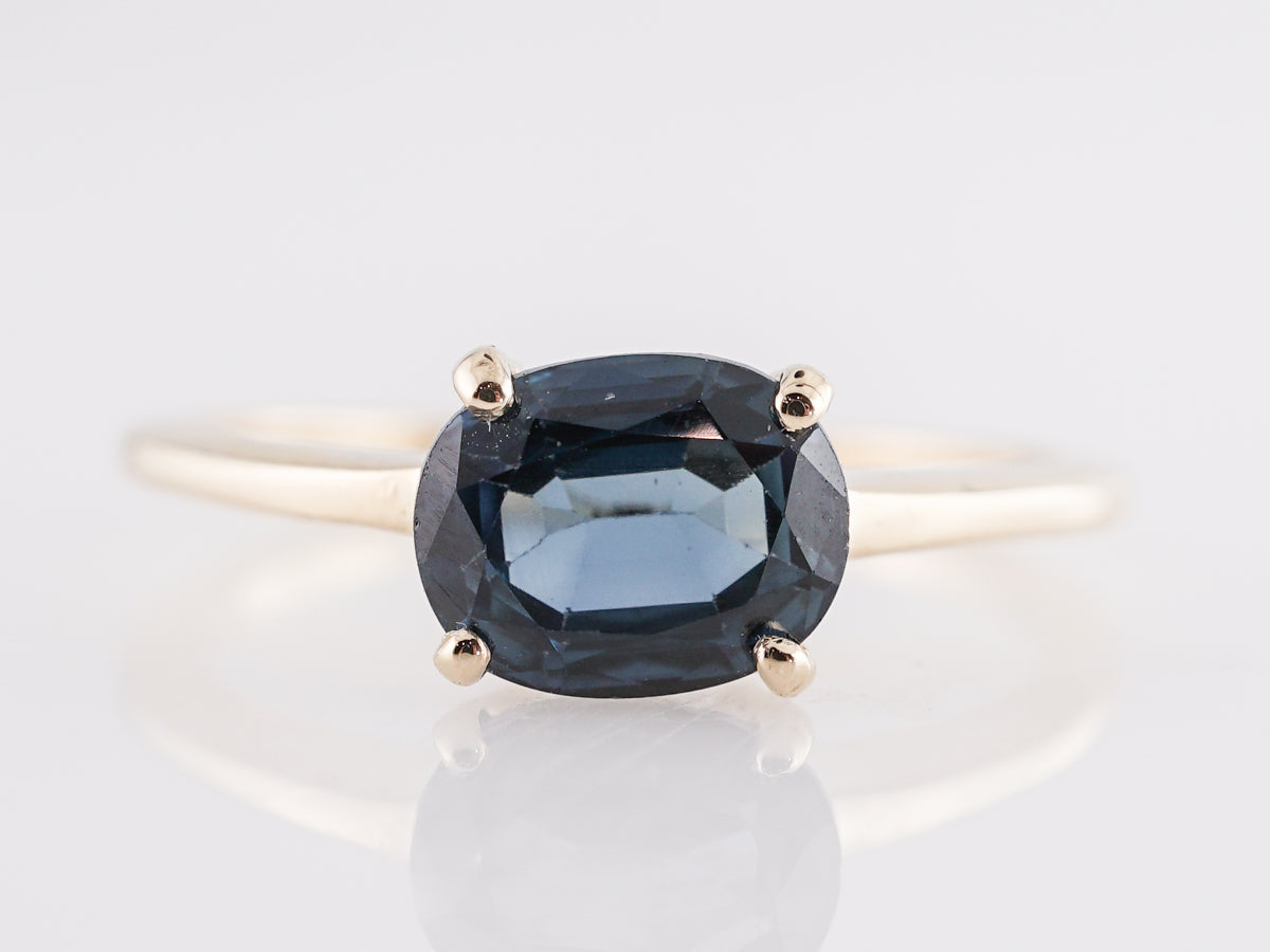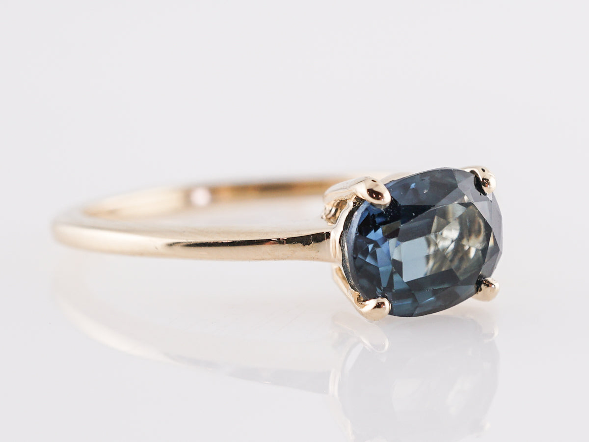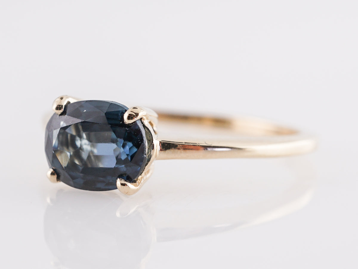 1.61 Carat Oval Sapphire Engagement Ring in 14K Yellow Gold. This soulful 1.61 carat oval cut sapphire engagement ring is prong set on a shining, 14k yellow gold band. The natural blue sapphire reflects darker hues of blue suede. The oval cut of this precious gemstone offers plenty of brilliance and complements the size of the gorgeous blue gemstone. From the profile, the gallery view has a small window underneath the elevated sapphire. This ring measures 5.46mm above the finger.