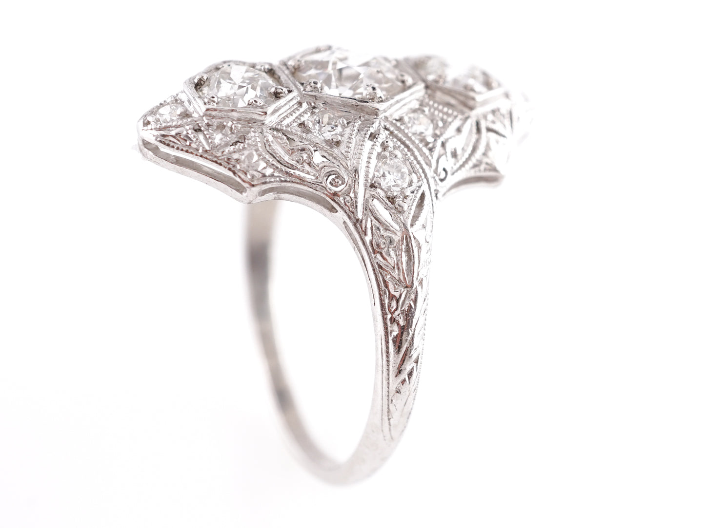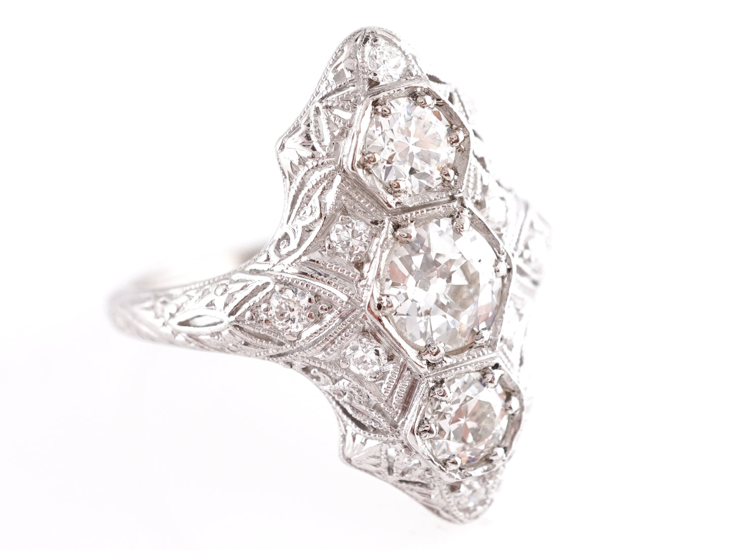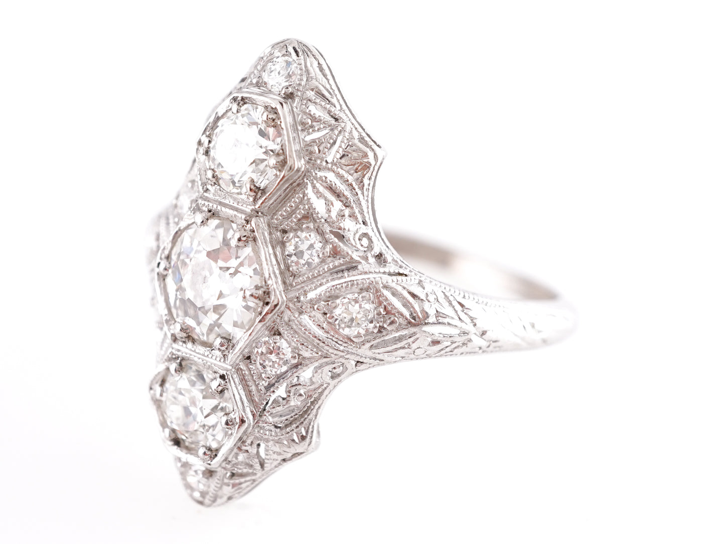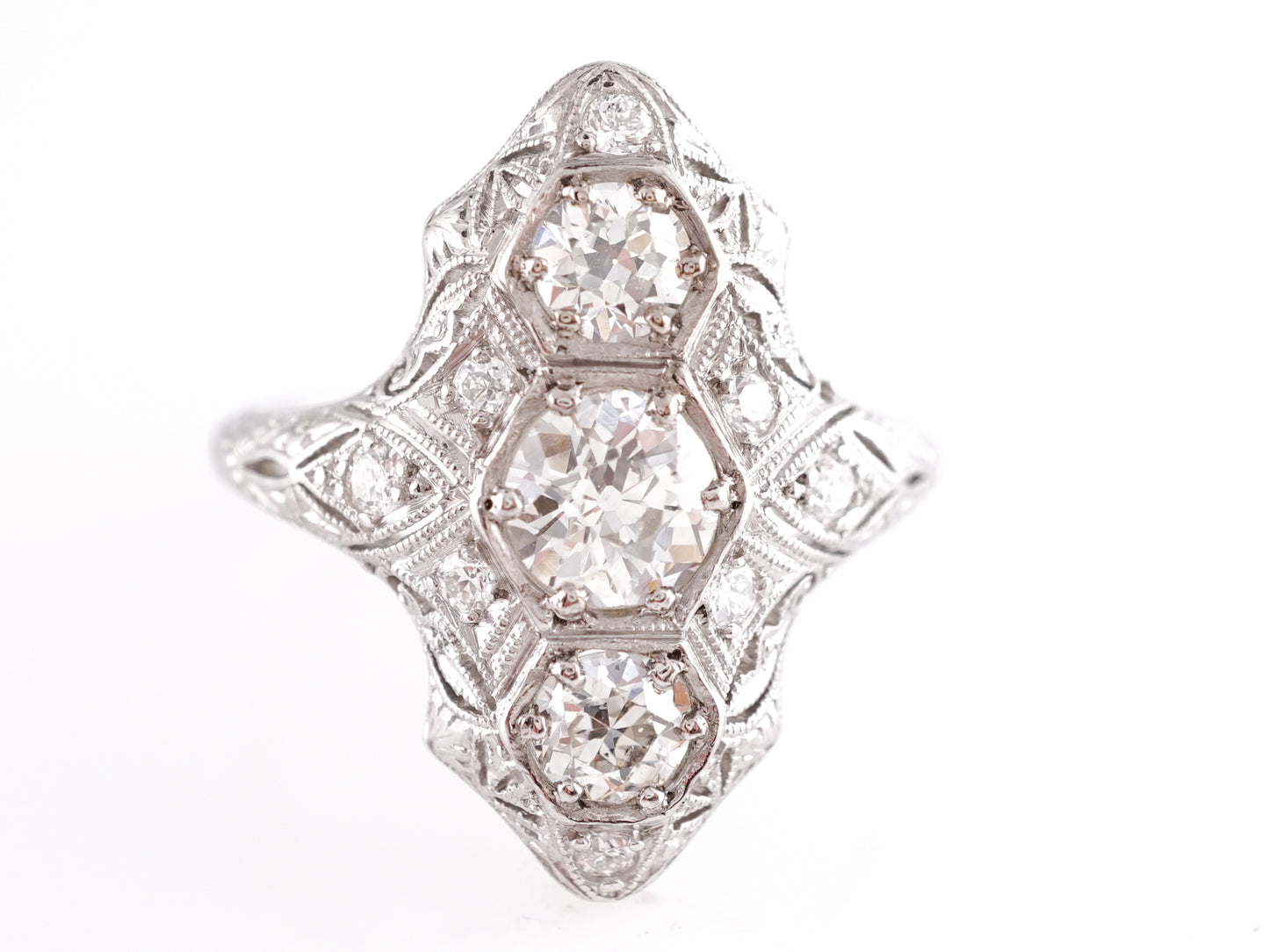 1.62 Vintage Three Stone Ring in Platinum. This Art Deco right hand ring features 1.62 carats of natural diamonds in platinum. The center stone is a .59 carat Old European cut gem. The Old European cut, with its unique facets and vintage charm, is a style of diamond that is highly sought after. Near-colorless, the primary diamond is prong set and is accented by two .46 carat diamonds that have a slightly warmer hue on the top and bottom of the head of the ring. Woven milgrain details and a collection of seven .015 carat Round Brilliant cut diamonds are sprinkled around the centerpiece. Detailed engravings adorn the shoulders of the shimmering platinum band.