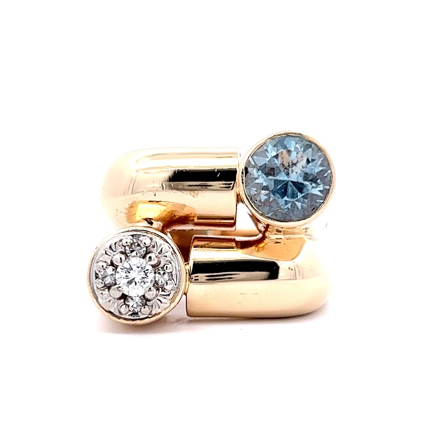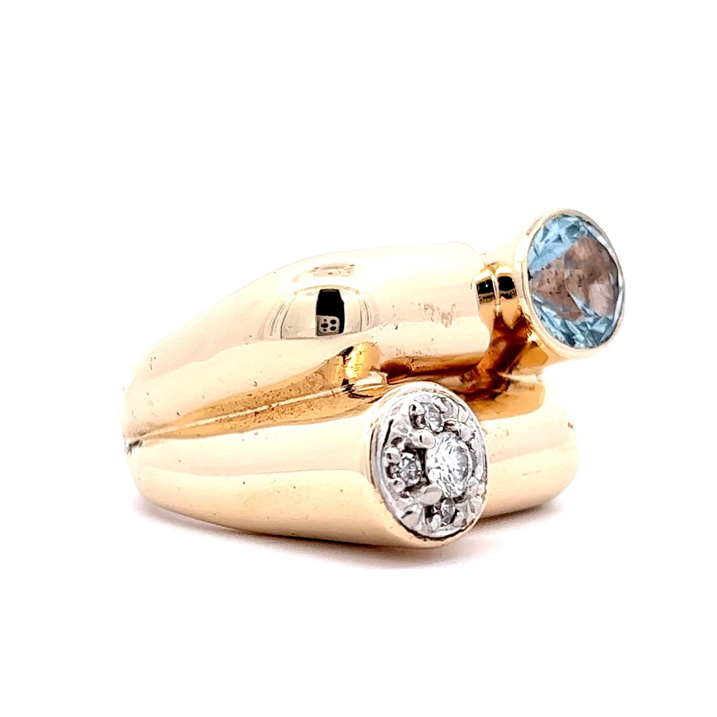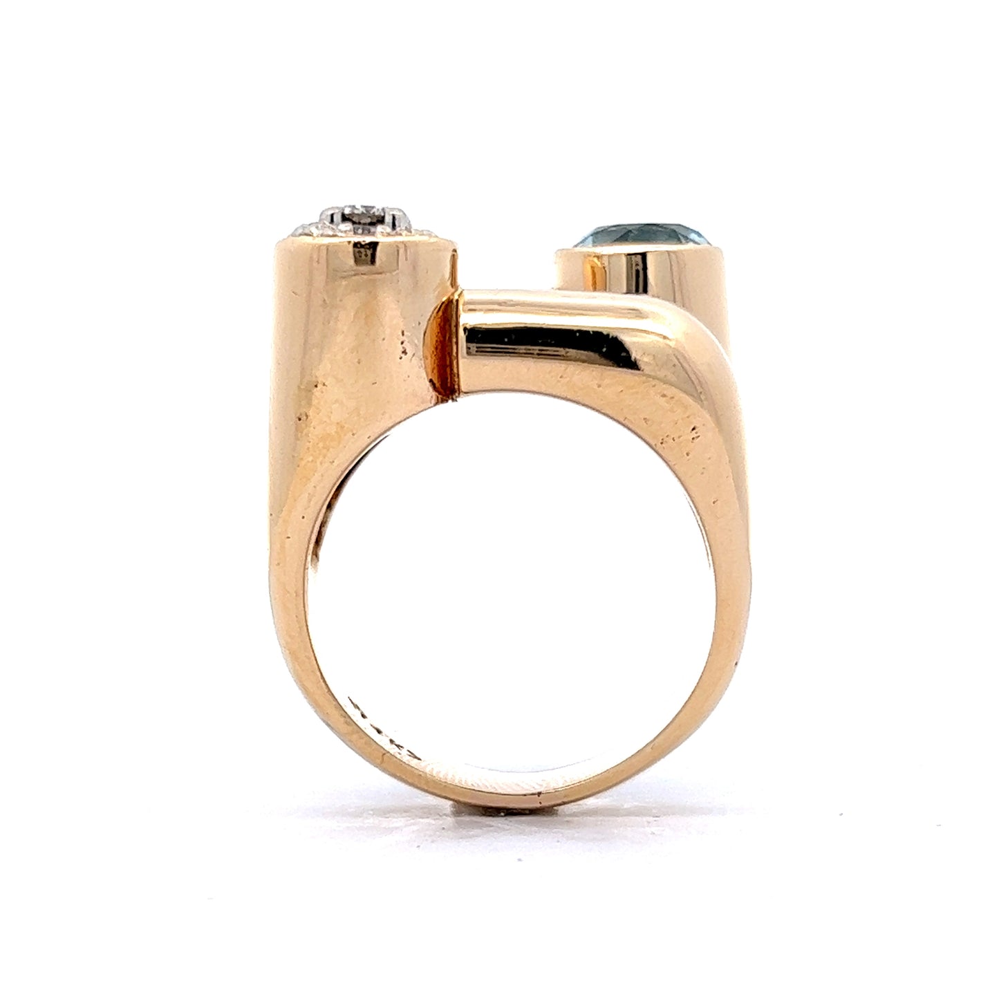 This one of a kind modern cocktail ring is a beauty! Crafted in 14K yellow gold, the ring is set with an impressive 1.64 carat round cut aquamarine. The stone reflects a lightly saturated sky blue hue and is accentuated with diamonds. This aquamarine and diamond Toi Et Moi ring is an eye-catching statement piece perfect for somebody looking for something different!