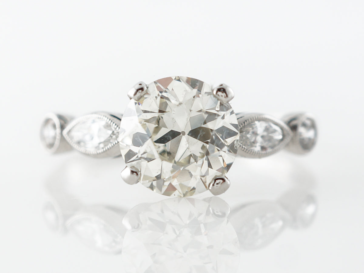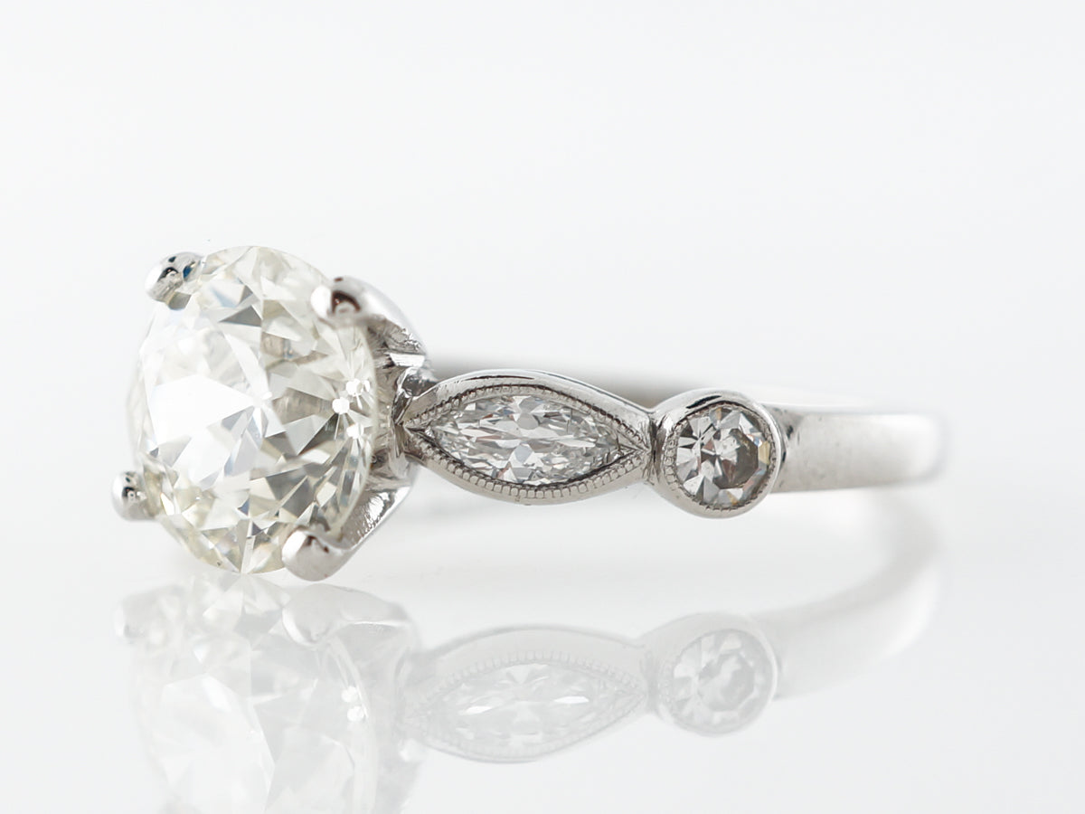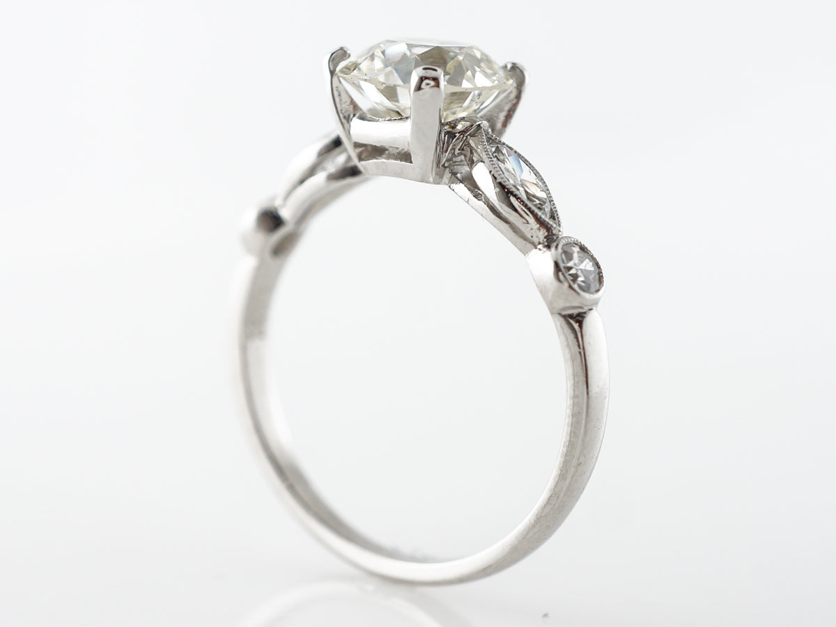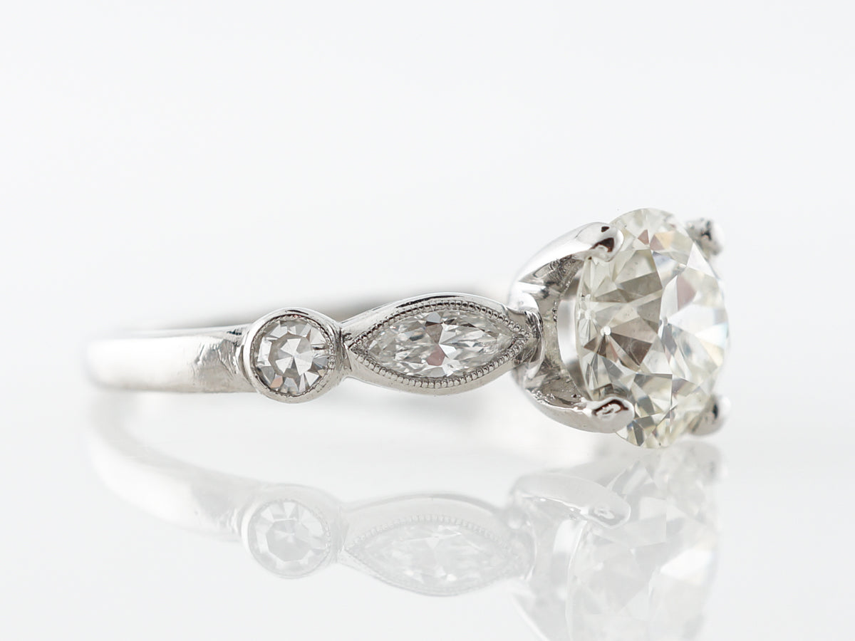 1.65 Old European Diamond Engagement Ring in Platinum. This stunning Art Deco engagement ring features a 1.65 carat old European cut diamond and is set in platinum. Complete with a thin band that has gorgeous marquise and round diamonds accenting the shoulders that are bezel set with milgrain detail, this ring is a great example of Art Deco style.