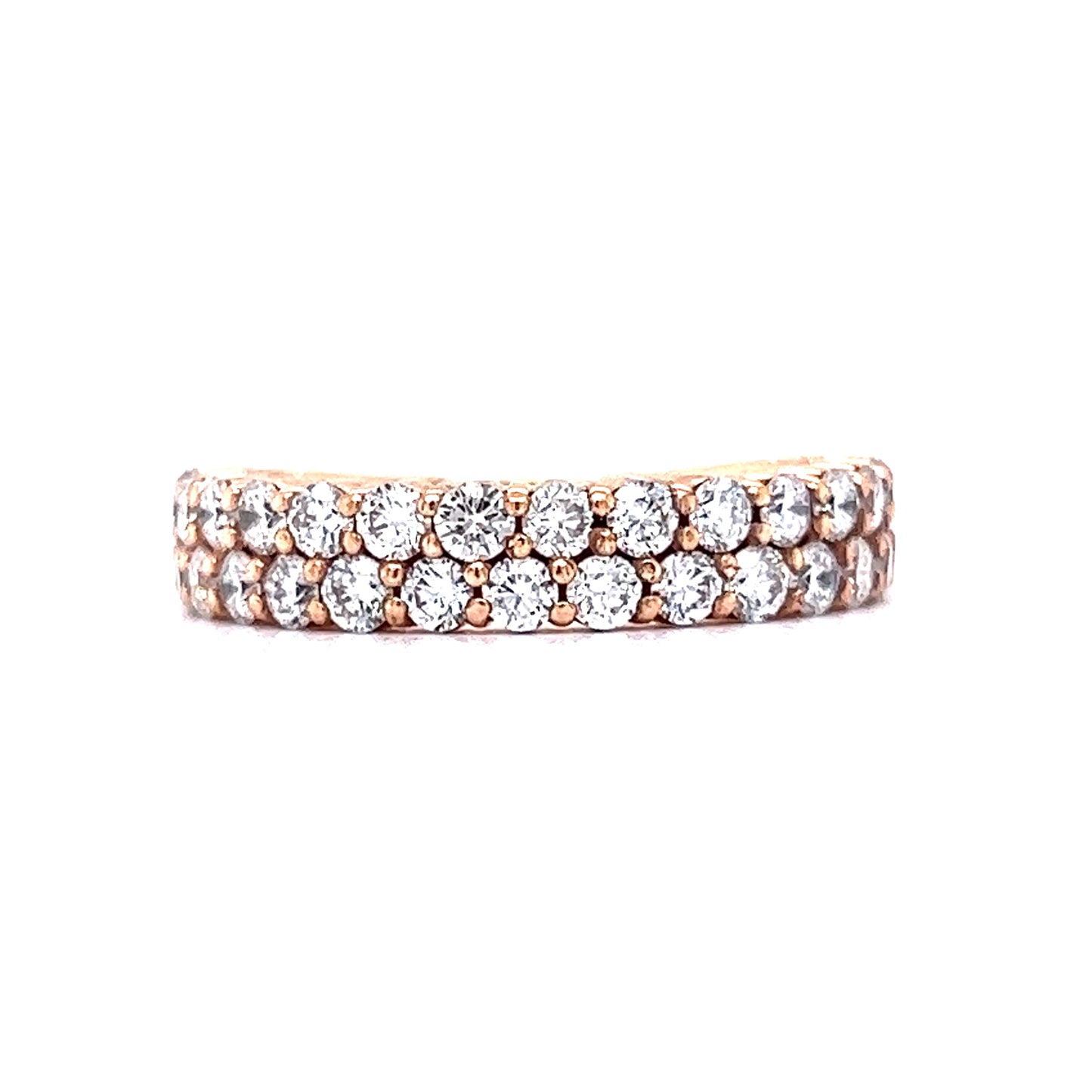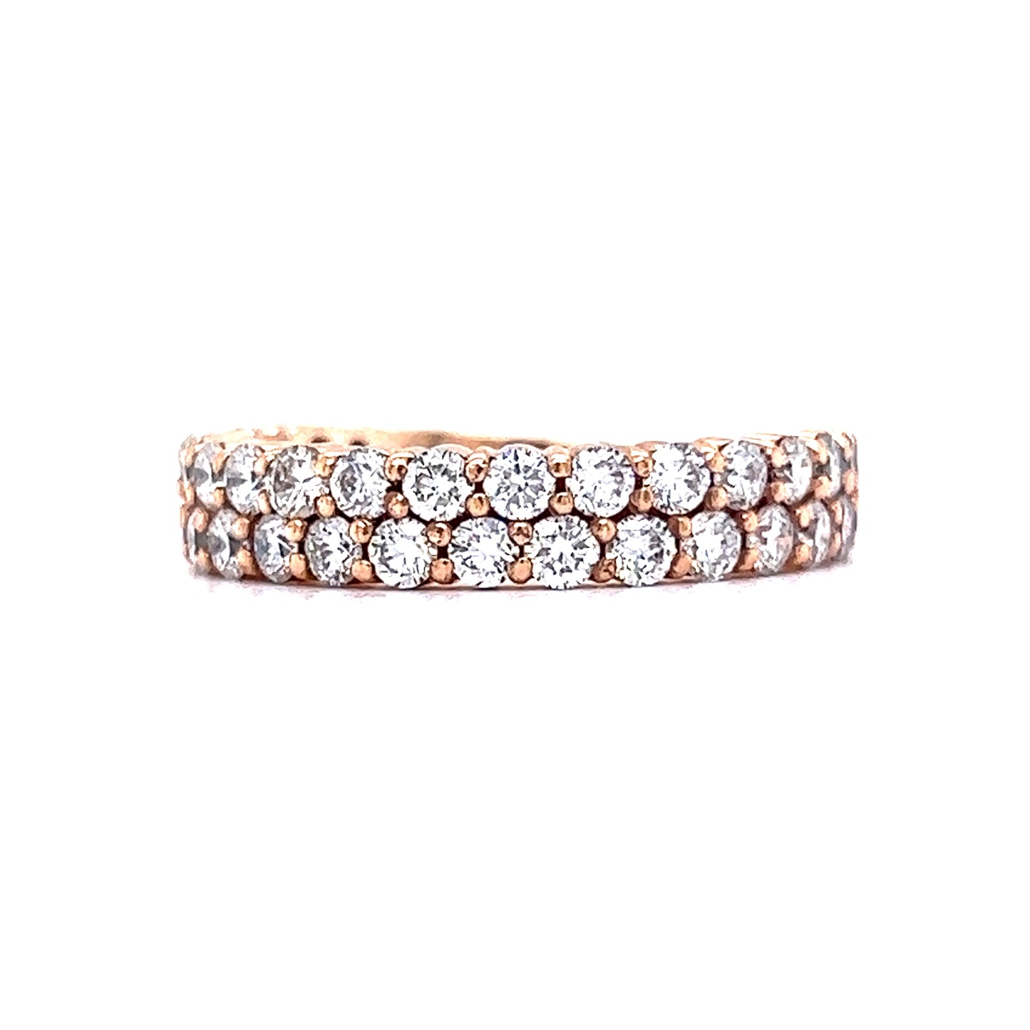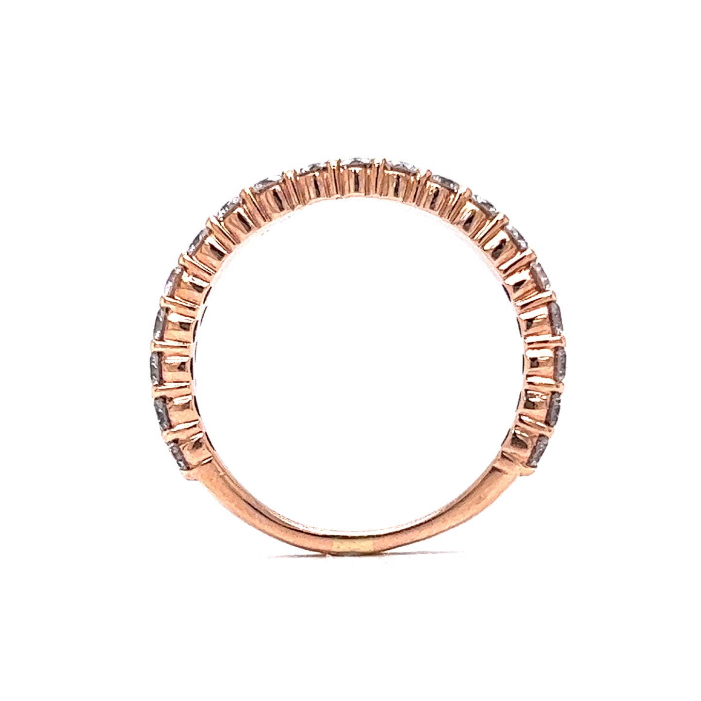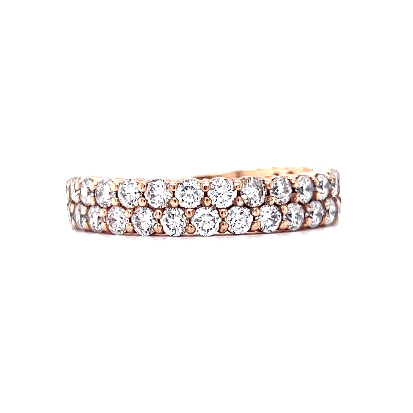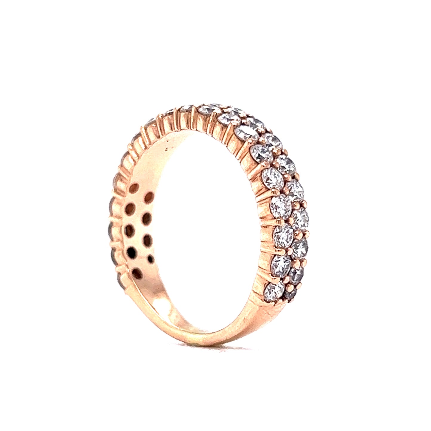 1.65 Pave Diamond Wedding Band in 14k Rose Gold. This romantic half-eternity band features 1.65 total carats of diamonds in 14 karat rose gold. Thirty-nine (39) colorless diamonds are pave set on the front half of the ring. The collection of diamonds are eye clean and collectively brilliant. This modern diamond band will look beautiful next to a rose gold engagement ring or can be worn as an everyday right hand stacking band.