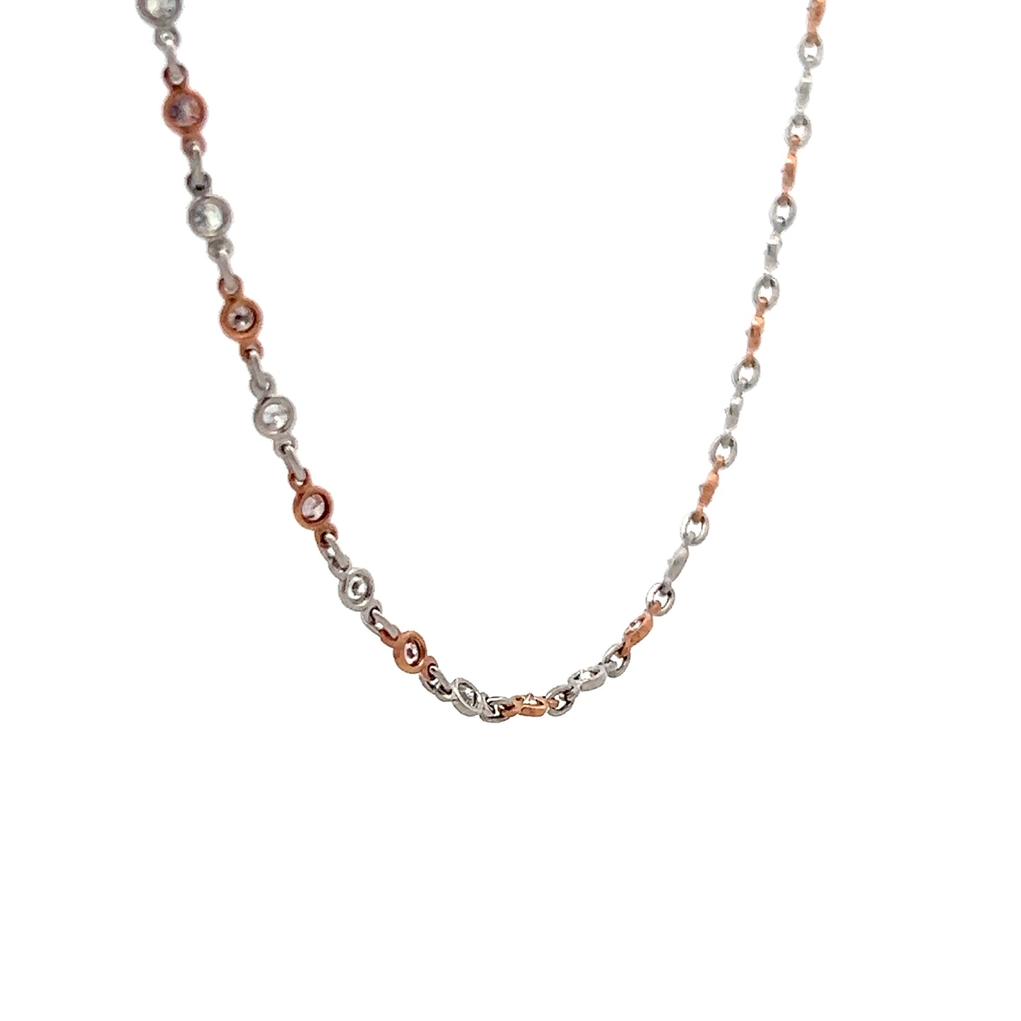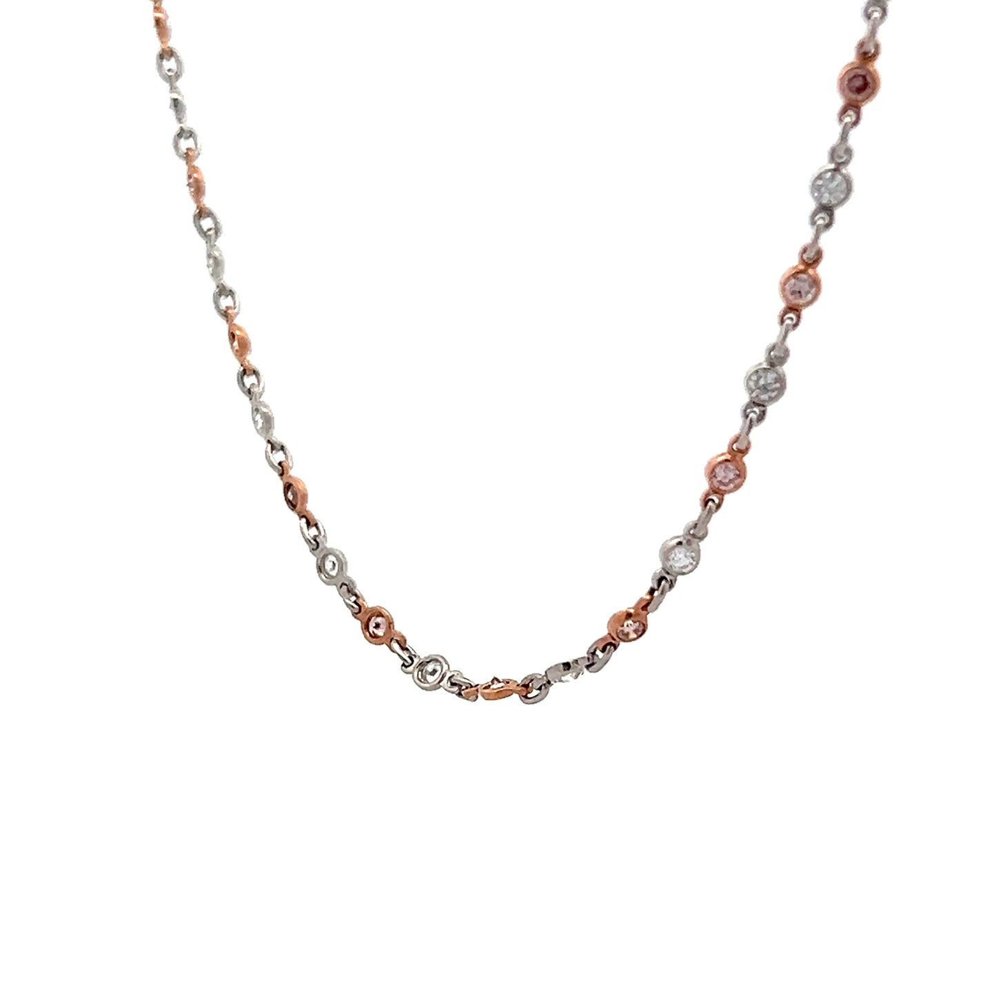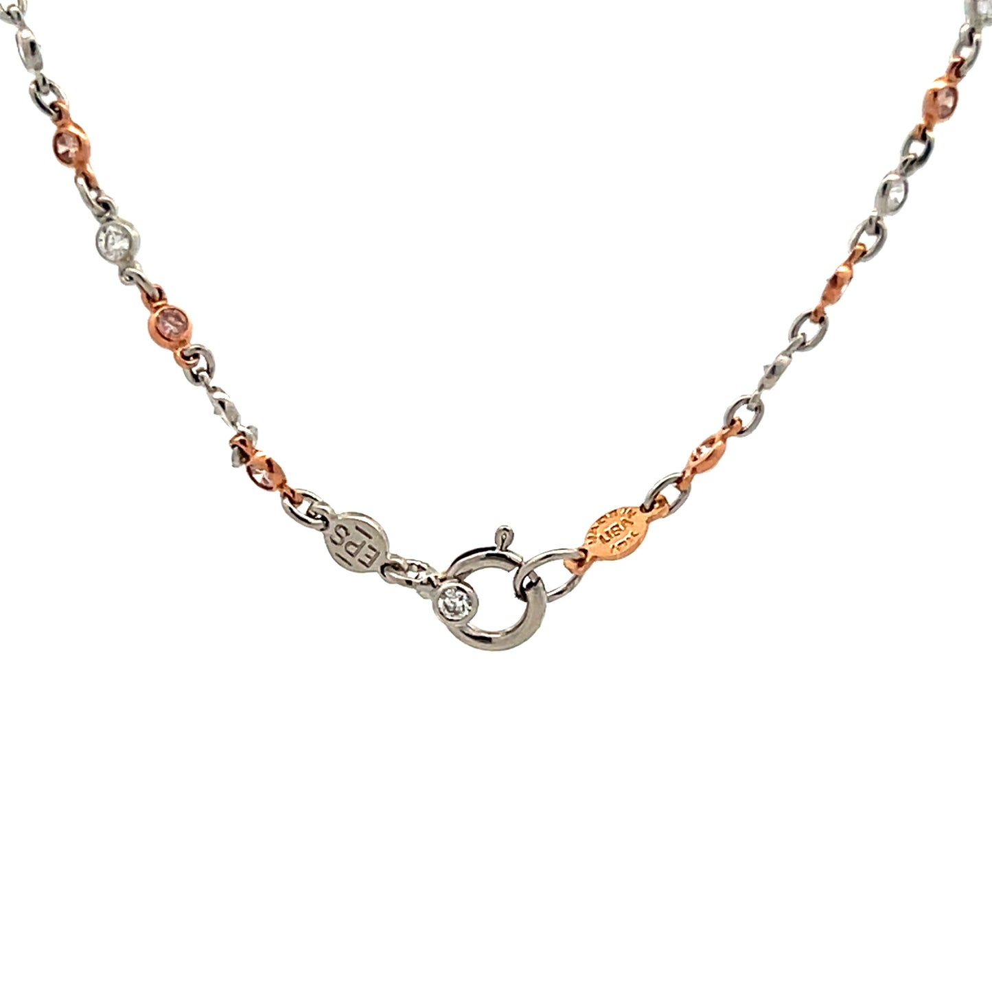 This chain necklace combines platinum and 18 karat rose gold in a two-tone design that measures 20 inches long. The necklace features white round brilliant cut diamonds (.83 carats, SI1 clarity, G color) and pink round brilliant cut diamonds (.0167 carats each, totaling .84 carats).