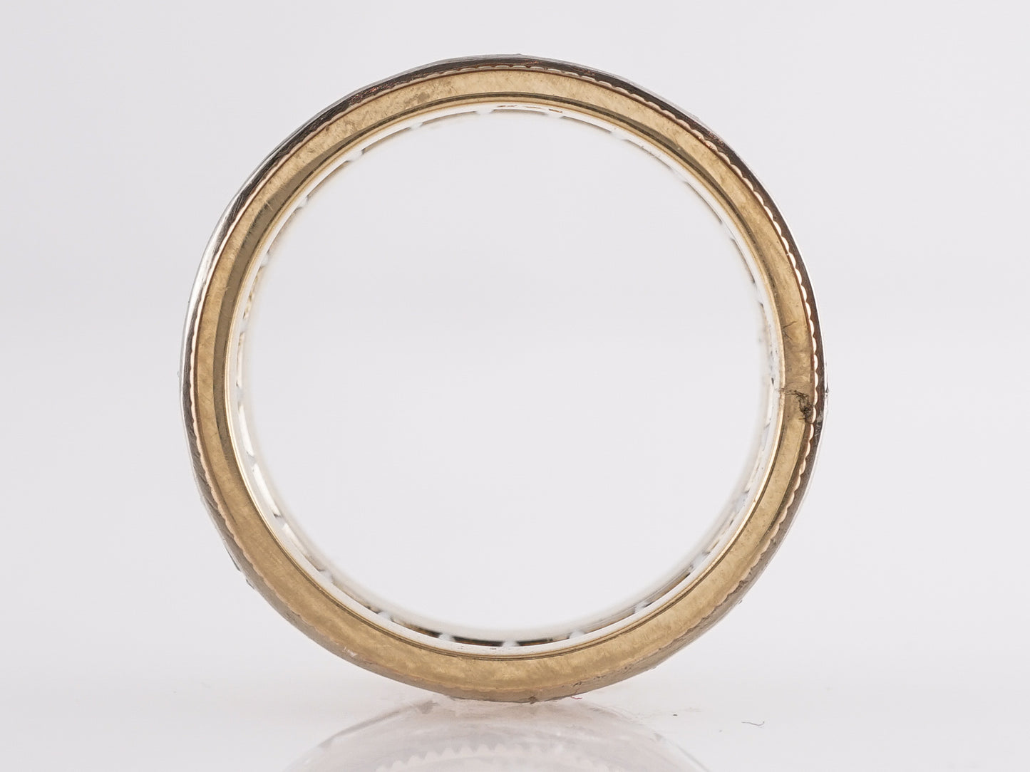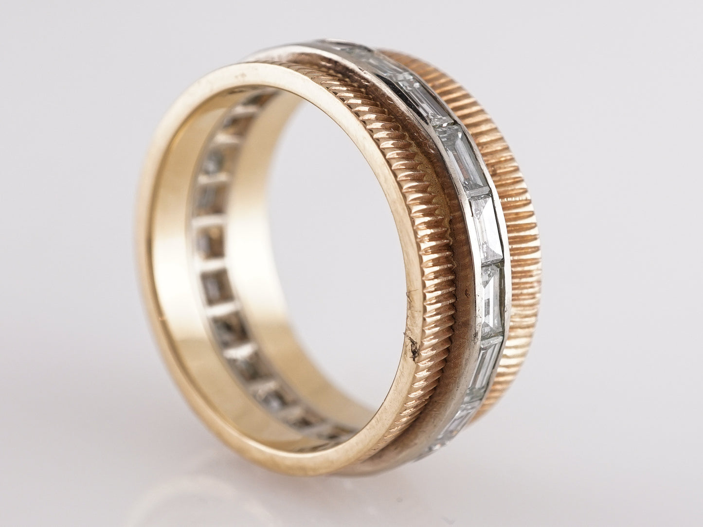 1.68 Retro Two-Toned Baguette Cut Diamond Wedding Band in 14k. This bold and beautiful Retro wedding band features 1.68 carats of baguette cut diamonds in 14k yellow gold. The diamonds create an eternity ring pattern in the center of the thick, embellished 14k yellow gold ring. The diamonds are dazzling in white and expertly mounted in the golden band, creating a unique, two-toned color scheme. If you are looking for a vintage wedding ring that makes a statement, this band is the one to have!