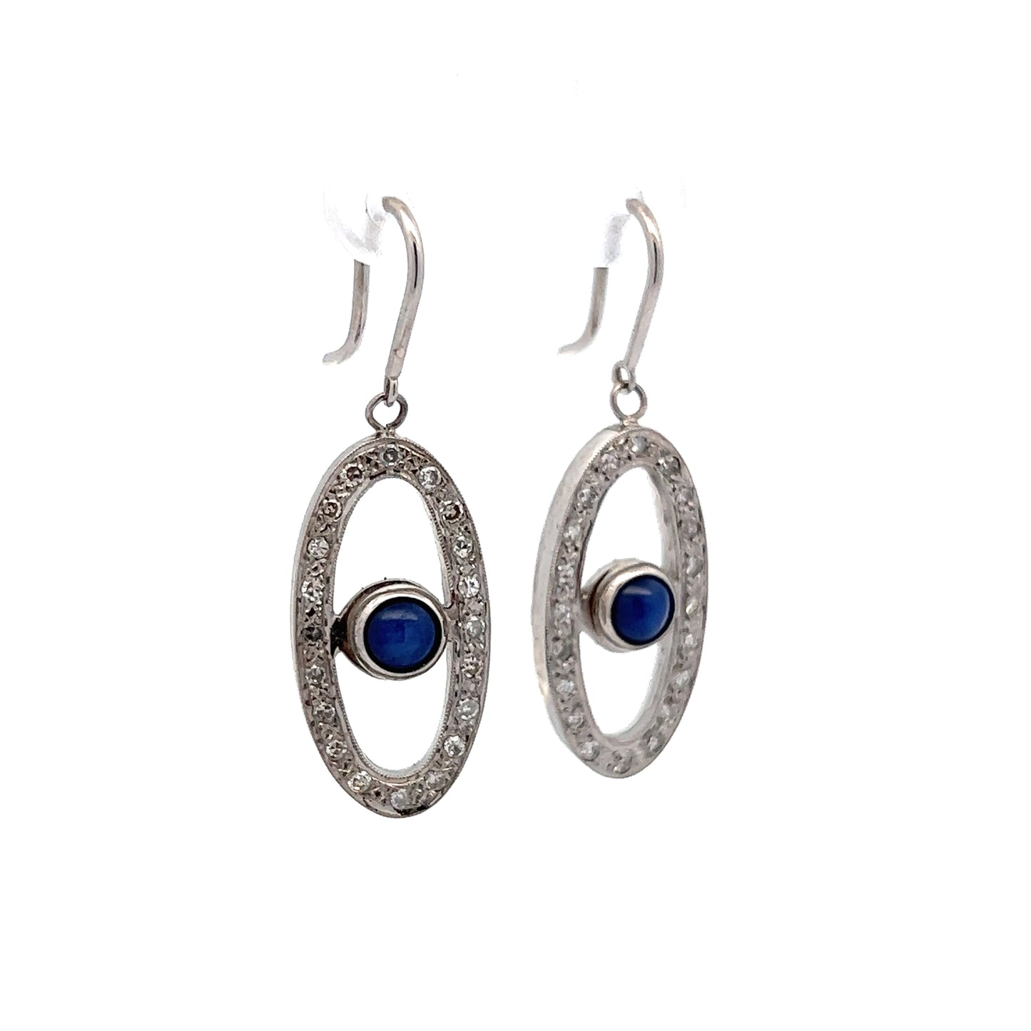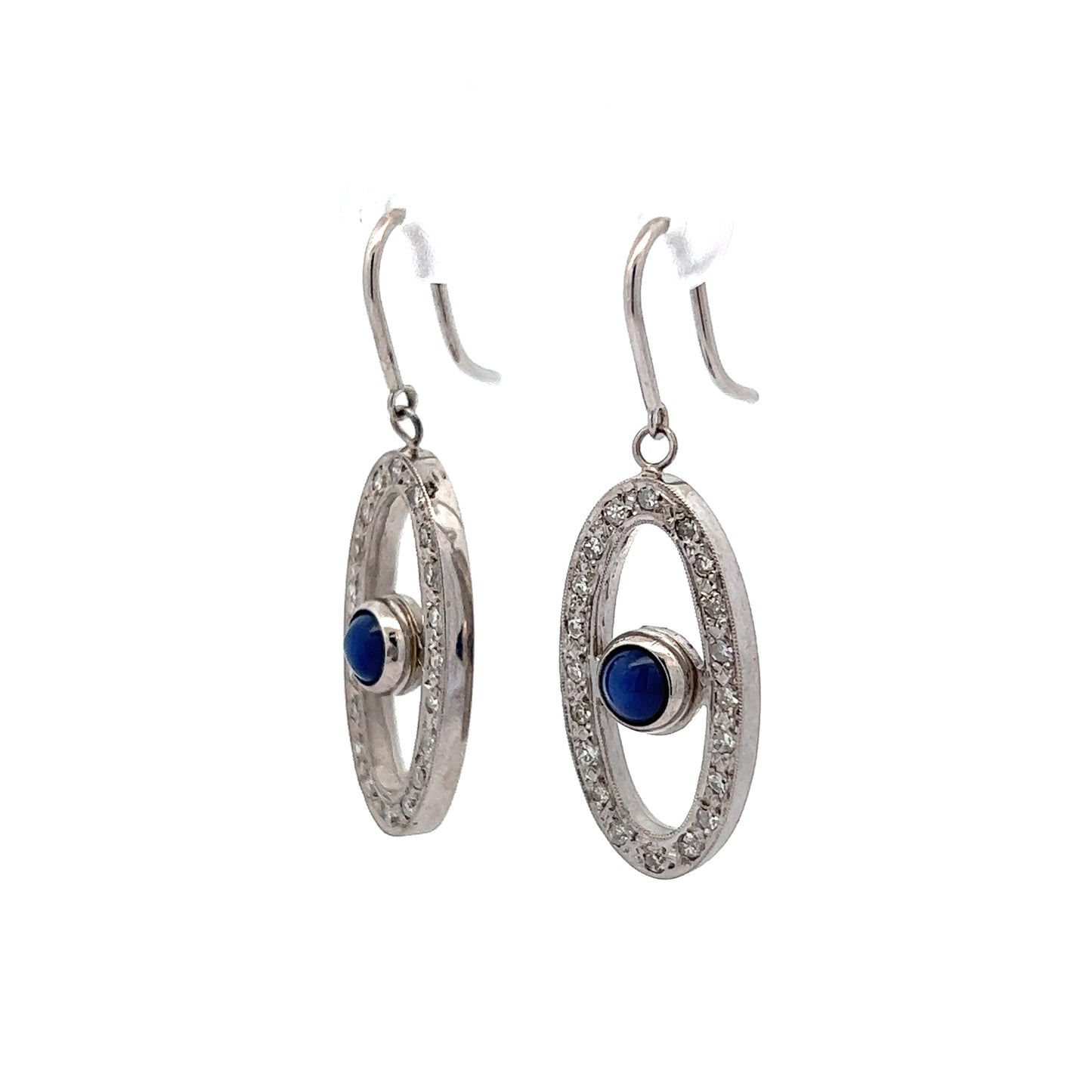 Rare and luxurious, these Custom Diamond & Star Sapphire Drop Earrings in 14K White Gold are sure to make a bold statement! The fine antique earrings are from the 1920s (Art Deco era). The earrings are made custom by our expert jewelers so you know they are truly one of a kind! Converted from vintage cufflinks, the earrings feature a unique design in a polished 14 karat white gold setting. Two star sapphires are set in the middle of the oval hoop drops. Each earring is accented diamonds, weighing a total of 1.68 carats. The diamonds add a sparkle to the star sapphire, creating a glamorous, night sky look. These antique earrings are perfect for any special occasion or every day wear.