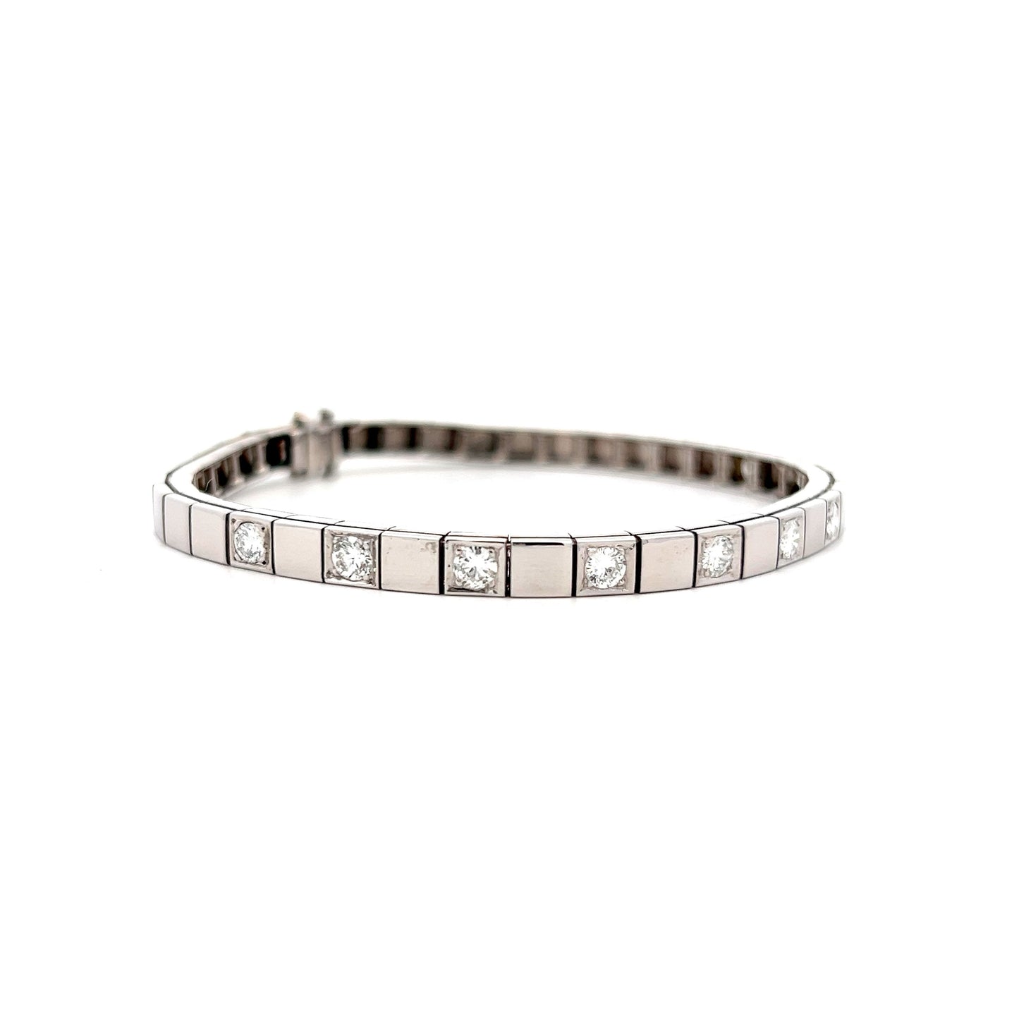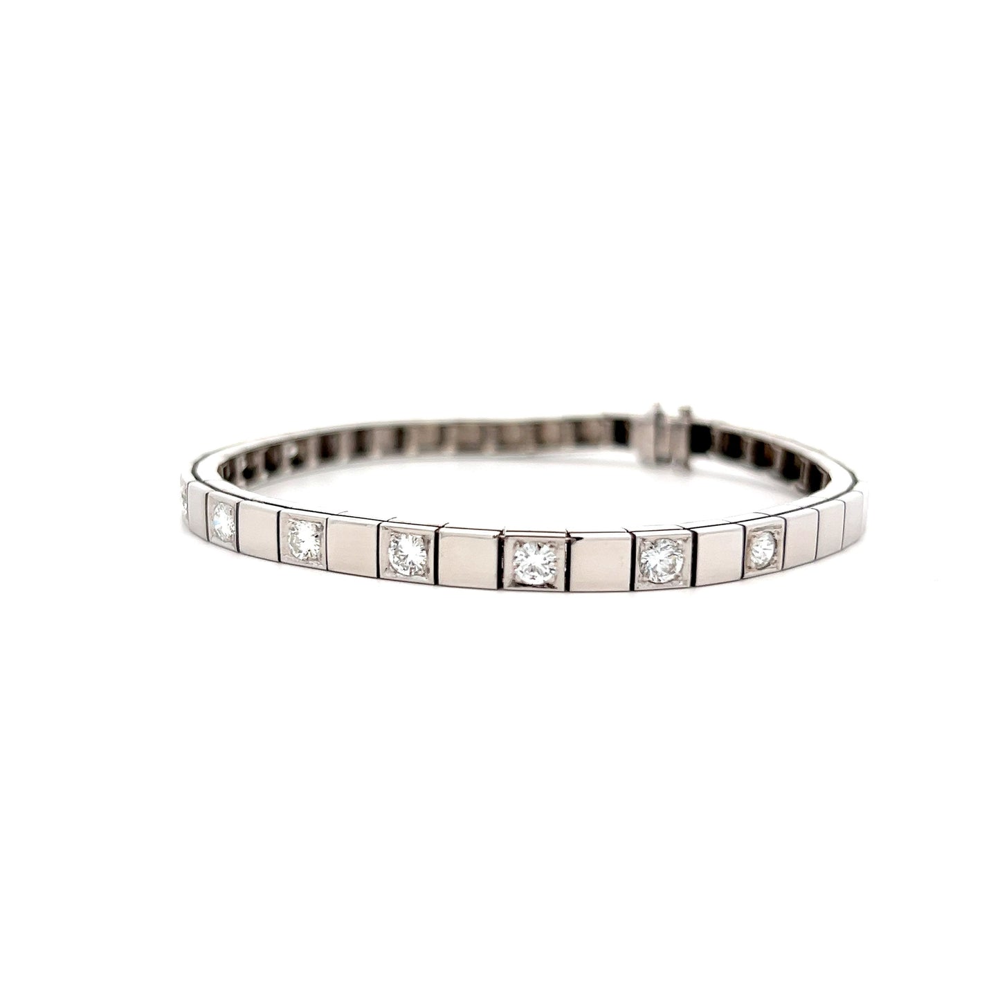 This 14 karat white gold "Add a Diamond" bracelet features a series of square links set with round brilliant cut diamonds. The diamonds, totaling 1.70 carats radiate brilliance, while the white gold setting enhances their color. Perfect for stacking or wearing solo, this bracelet is versatile and sophisticated.