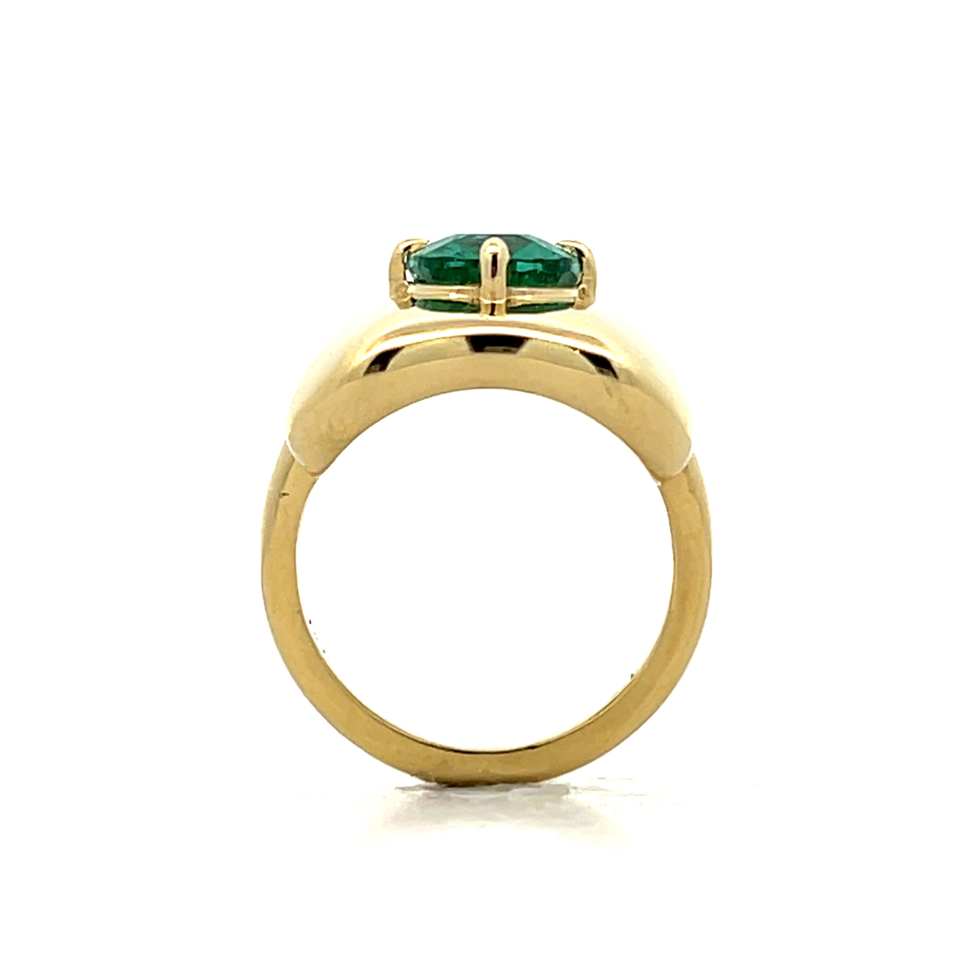 This emerald cocktail ring features a 1.70 carat cushion cut emerald in a four-prong setting on an 18 karat yellow gold thin band. An organically shaped bubble mounting holds the green stone above the band. The piece was created 'by Filigree' and the rich geen color from the emerald contrasts with the yellow gold gorgeously throughout the design.