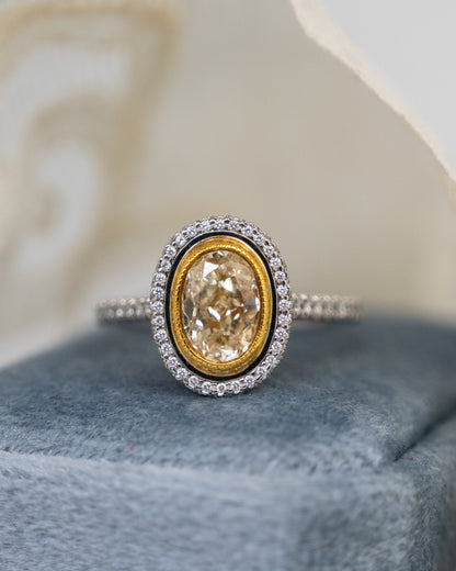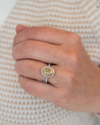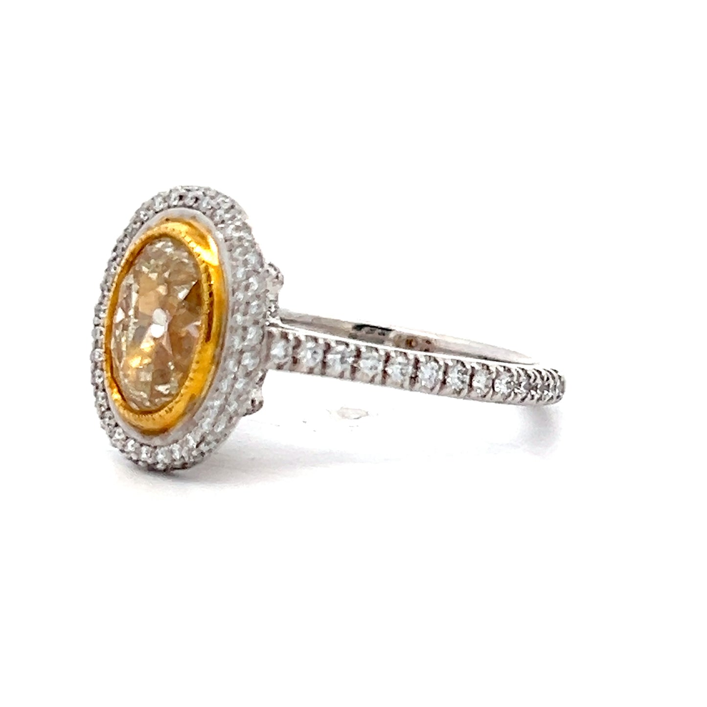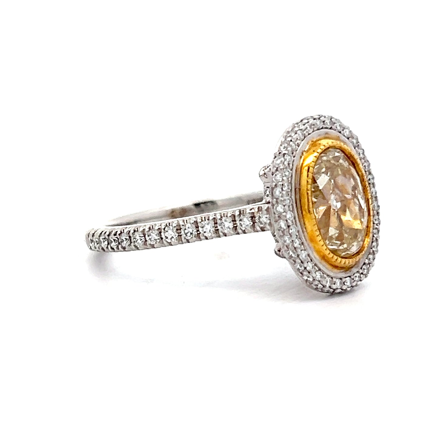 This engagement ring is finished in 18 karat white and yellow gold in a style halo design. The ring has a 1.70 carat oval cut X/Y/Z diamond in the center, which sits in a yellow gold bezel. Around this main diamond are 111 small natural diamonds that total .38 carats and create a circle of sparkle around the yellow center stone. The contrast of colors makes this ring stand out with its eye catching sparkle.