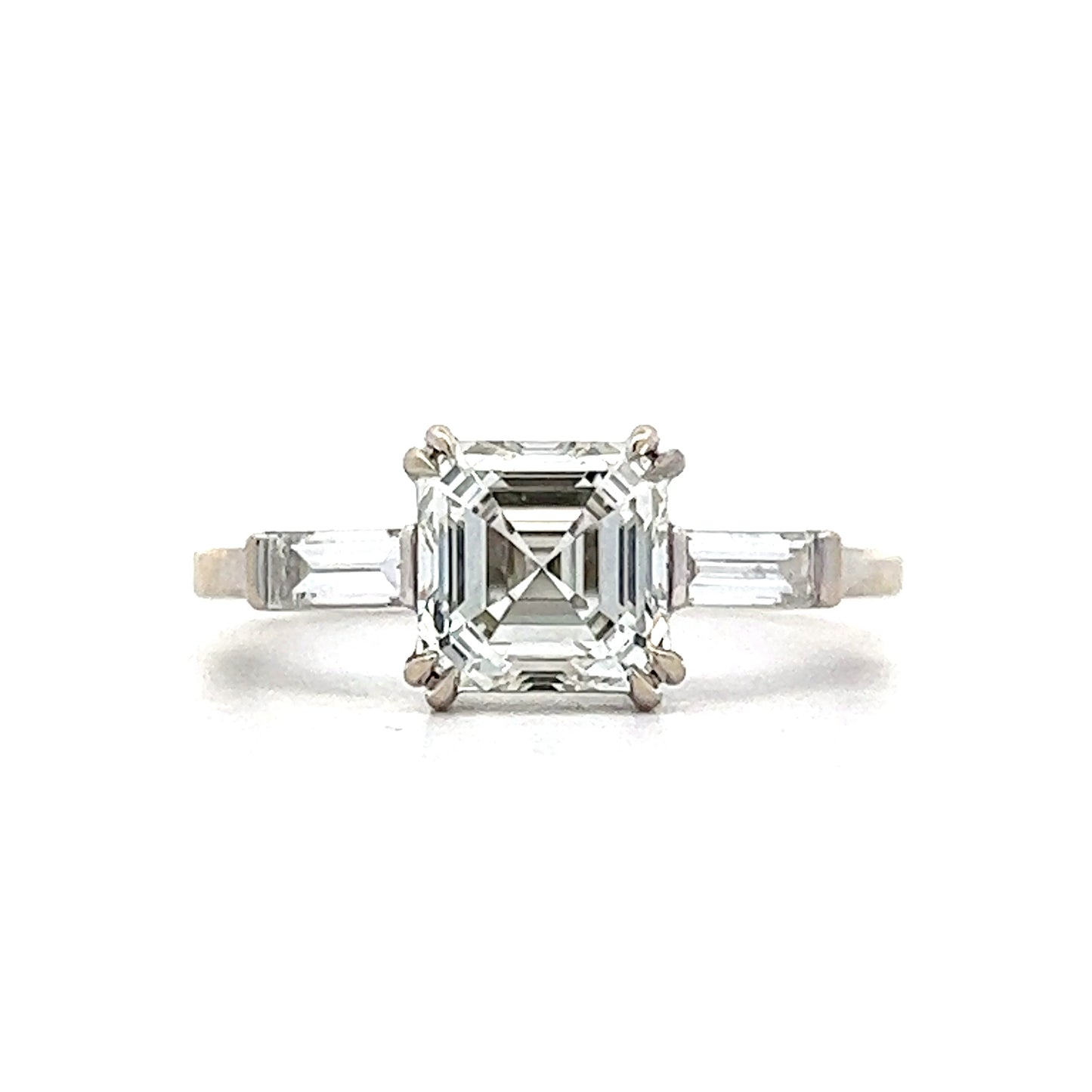 This modern engagement ring features a GIA-certified 1.71 carat Asscher cut diamond set in 18 karat white gold. The diamond has an impressive VVS2 clarity giving it lots of life. It is flanked by two (2) .19 carat baguette cut diamonds which are also near colorless. The diamonds are prong set, allowing light to pass through all angles and enhancing the sparkle. This stunning ring is sure to take her breath away!