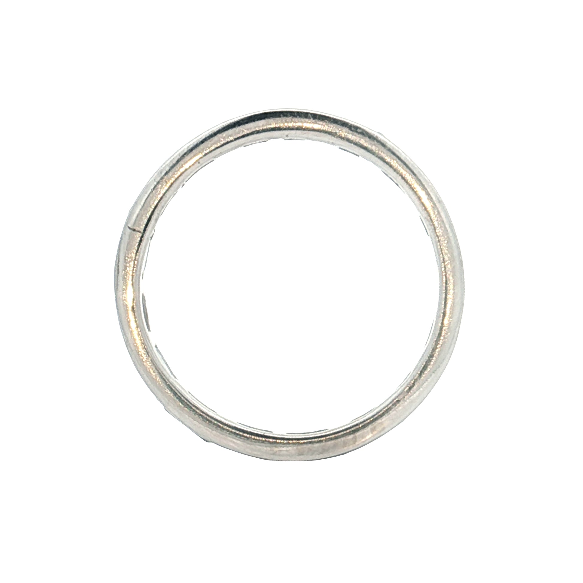 Baguette cuts are rectangular with step-cut facets that create clean lines and flashes of light rather than the intense sparkle of brilliant cuts. The east-west setting positions the baguettes horizontally across the band instead of vertically, creating a streamlined look. The channel setting recesses the diamonds into the band for protection during wear. The band's profile allows it to stack flush against other rings.