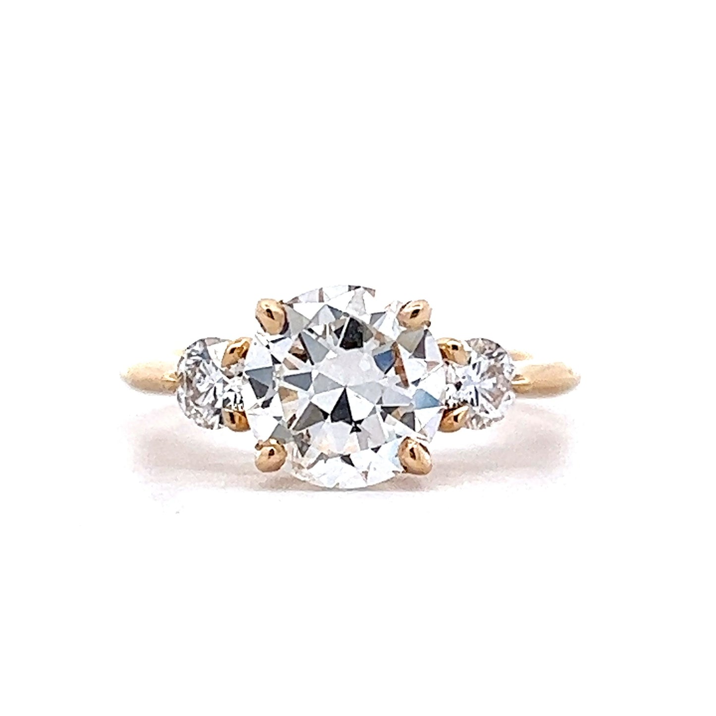 This beautiful three stone engagement ring is crafted in 14 karat yellow gold. The center stone is a GIA certified 1.76 carat round brilliant cut diamond with a near-colorless G color and I1 clarity. Two sparkling accent natural diamonds, each with a weight of .19 carats, flank the center diamond. The open gallery design is enhanced by the delicate filigree metalwork, finished in polished yellow gold.