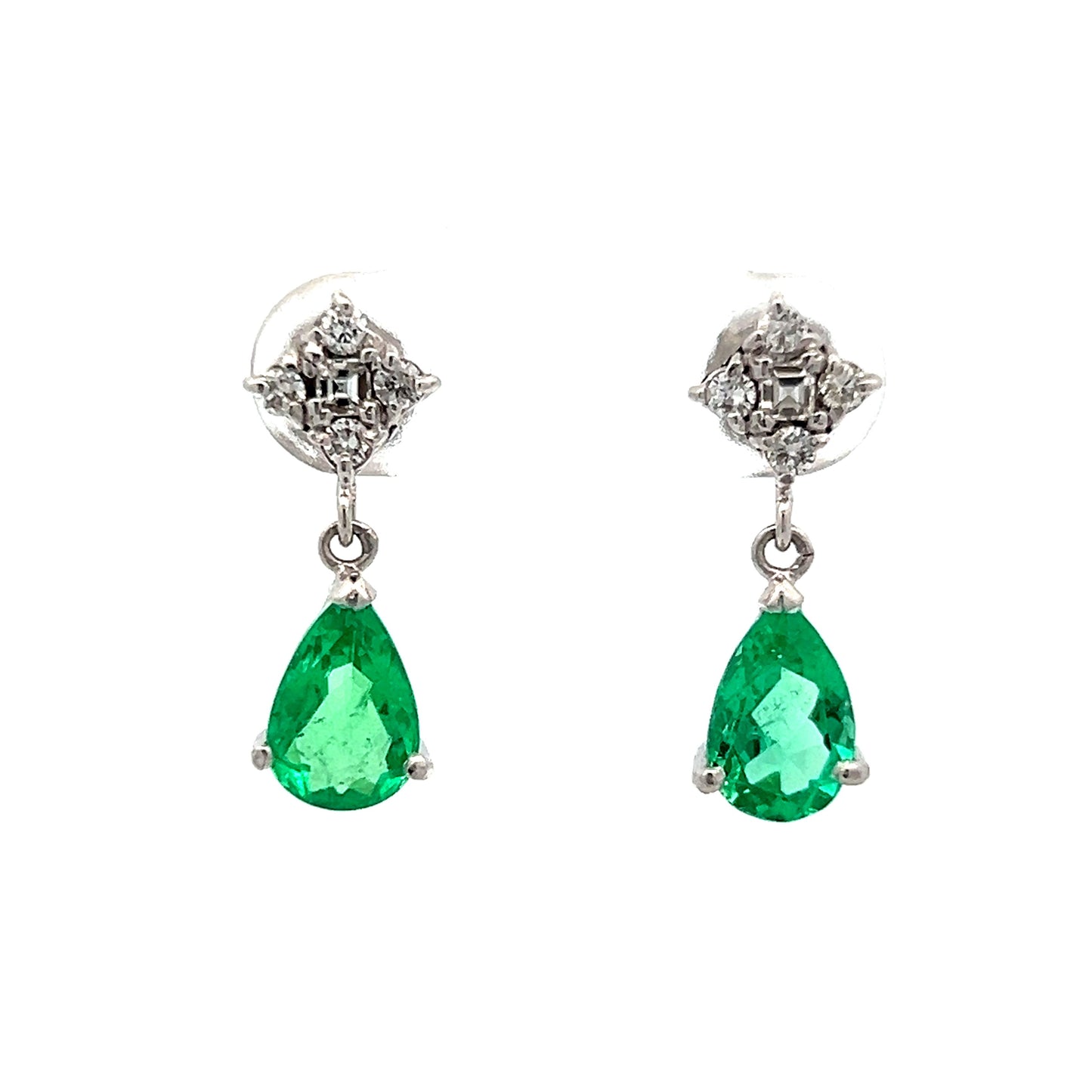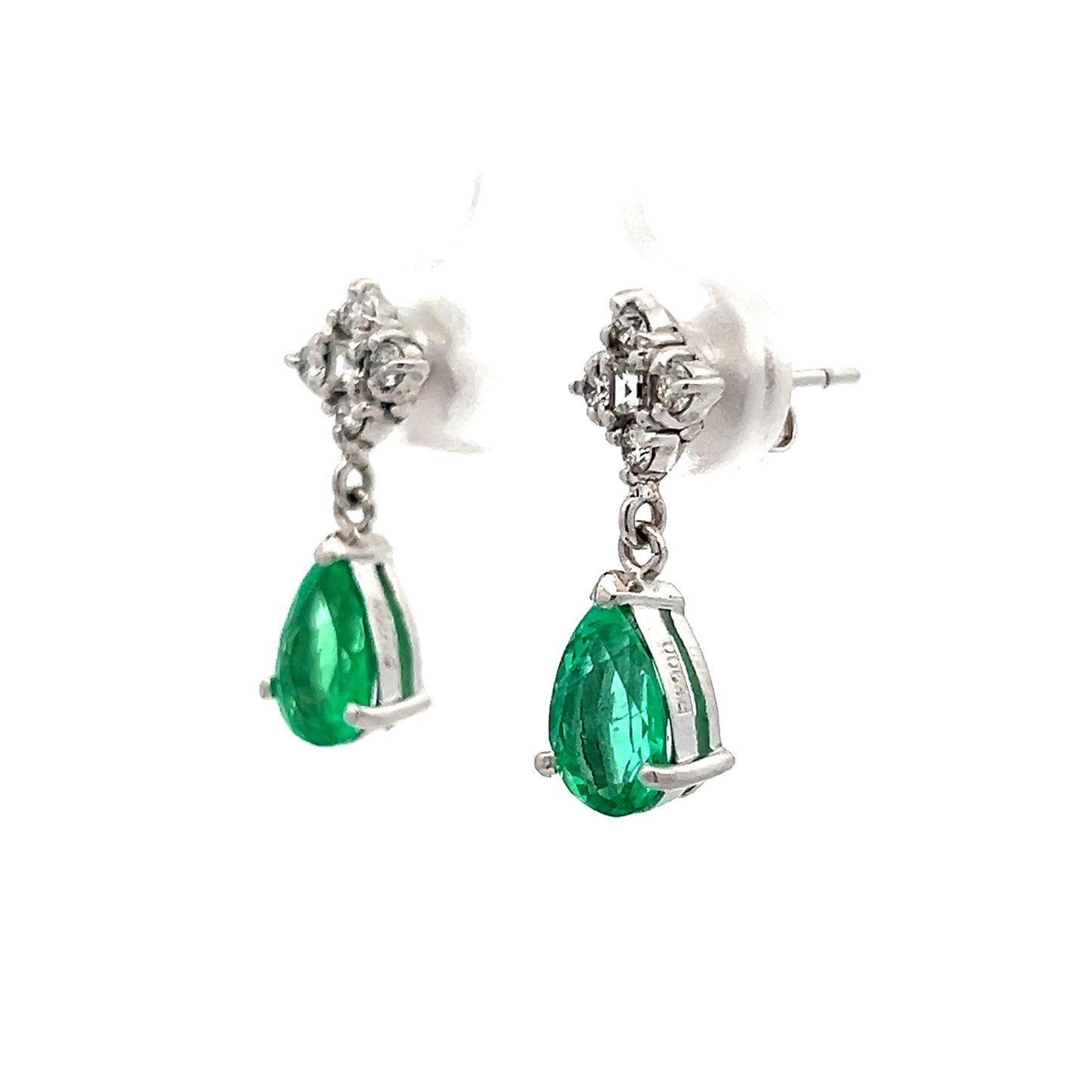 Crafted in 14 karat white gold and platinum, these earrings feature a beautiful pear cut emerald as the primary stones with a total weight of 1.79 carats. The emerald's deep, rich color is accented by a cluster of round brilliant cut diamonds around a square cut diamond, adding a total of .04 carats for a sparkling touch. These earrings are versatile and can be dressed up or down, making them the perfect addition to any jewelry collection.
