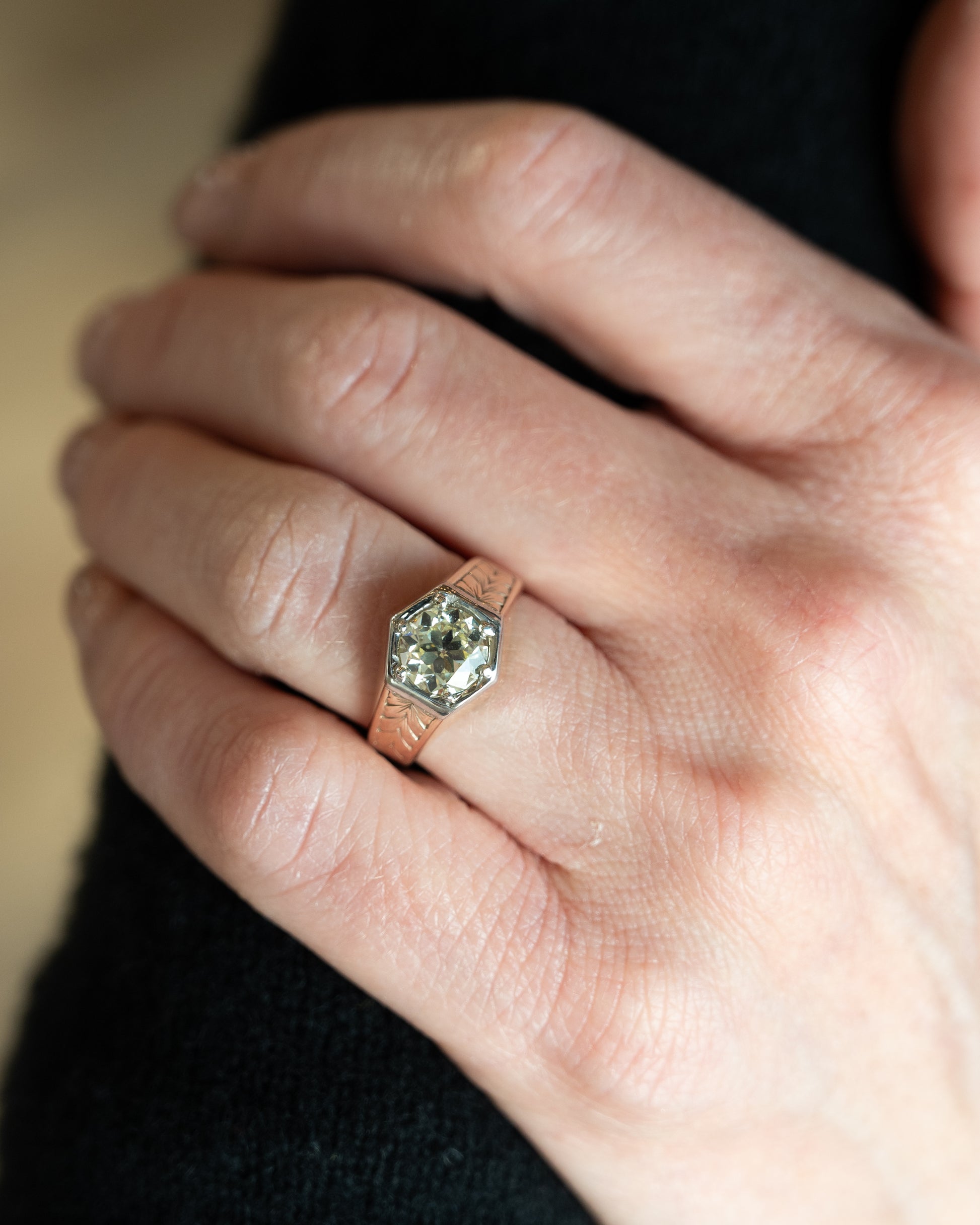 This Art Deco era men's solitaire diamond ring features a 1.80 carat old European cut diamond with VS1 clarity and U-V color in a hexagon-shaped head, set in a two-tone design of 14 karat rose gold and 14 karat white gold. The tapered shank displays intricate chevron engraving that adds texture and visual detail to the band. The contrasting gold tones create depth while highlighting both the diamond and the geometric Art Deco design elements.