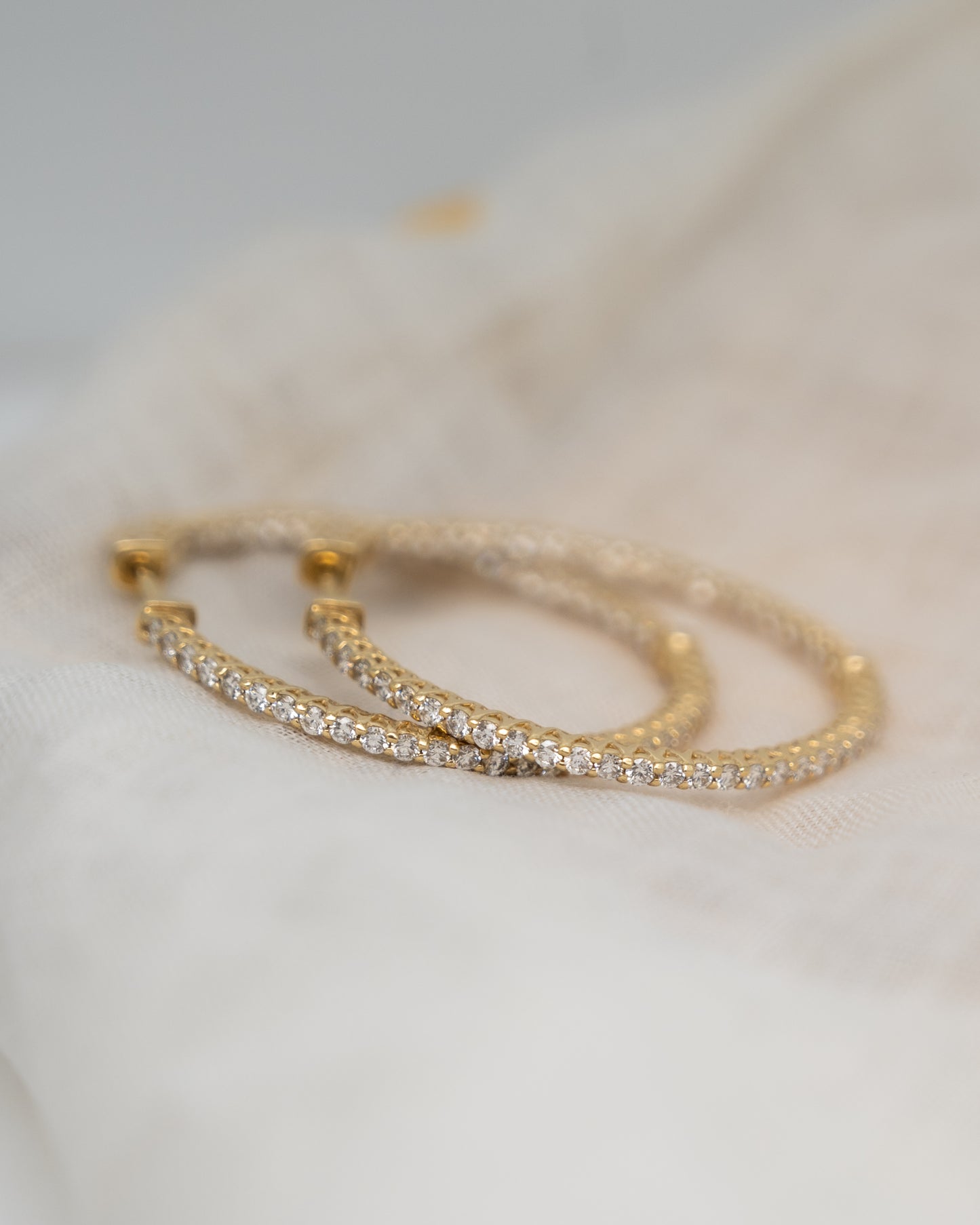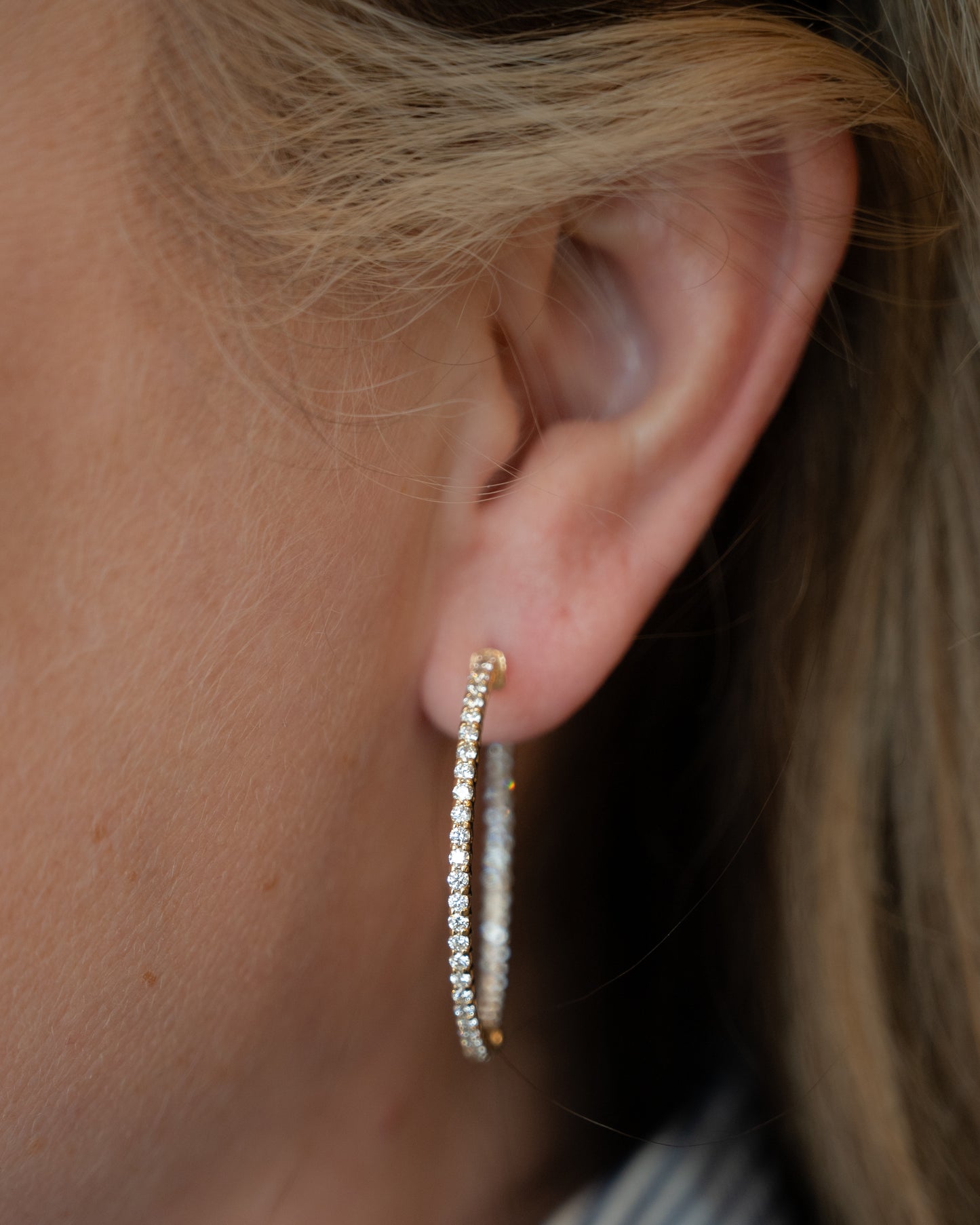 Measuring 37 mm in length, these hoops are big enough to be noticed but not so large that they feel heavy when worn. The bright yellow gold works well with the white diamonds to create an eye-catching combination. The diamonds go around both the inside and outside of the hoops, making them visible from multiple angles when worn.