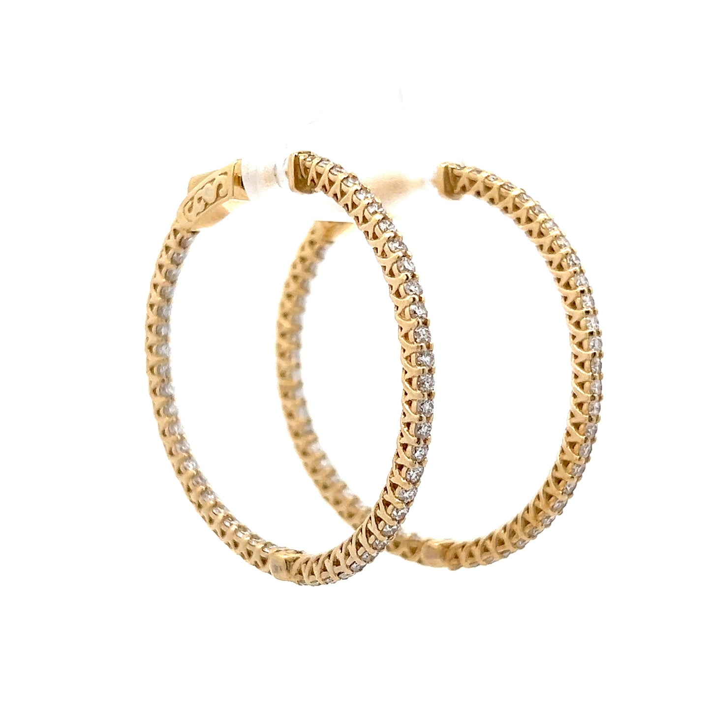 These diamond hoop earrings are made from 14 karat yellow gold with round brilliant cut diamonds set in an inside-out design. The earrings contain a total of 1.80 carats of diamonds with VS2/SI1 clarity and H color grade that create plenty of sparkle.