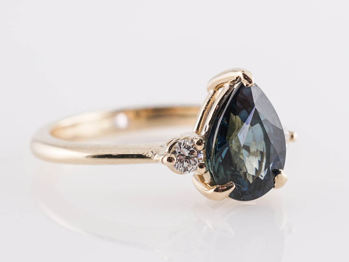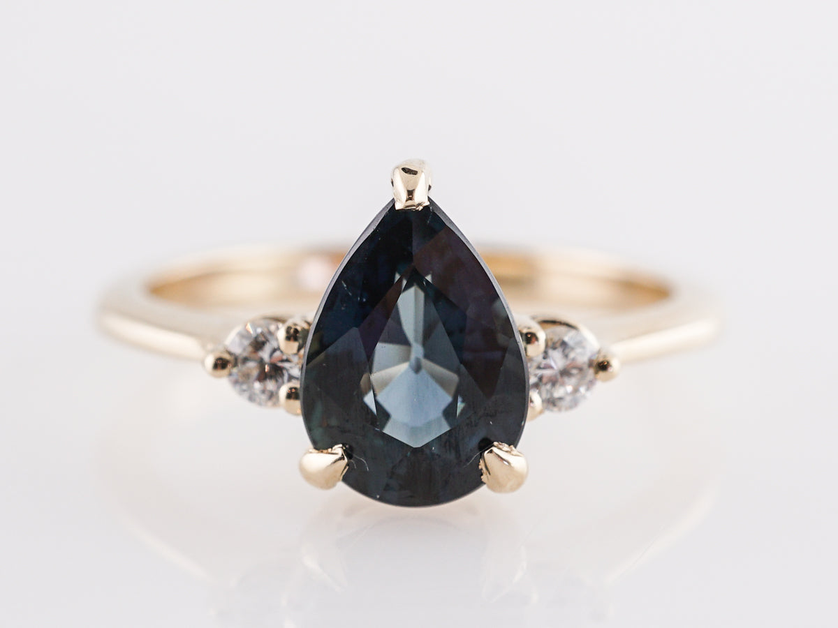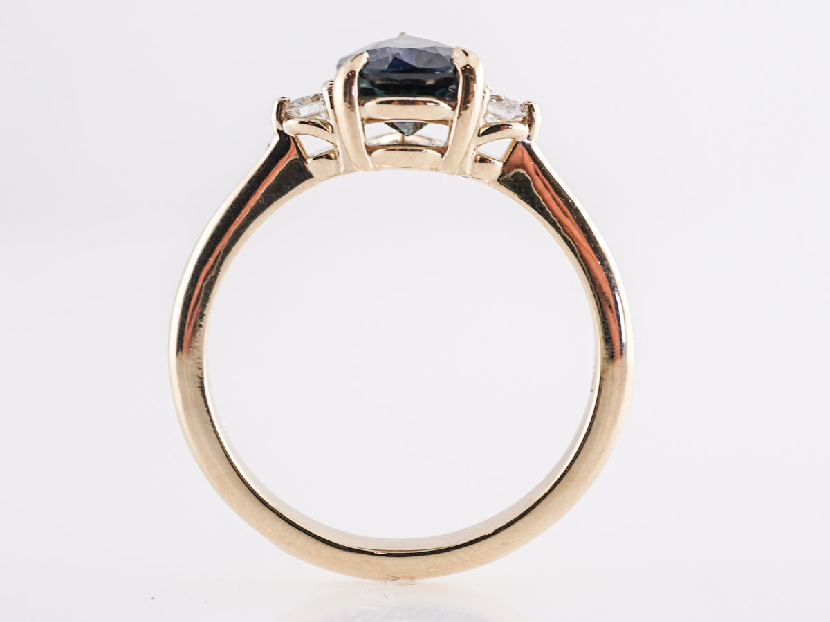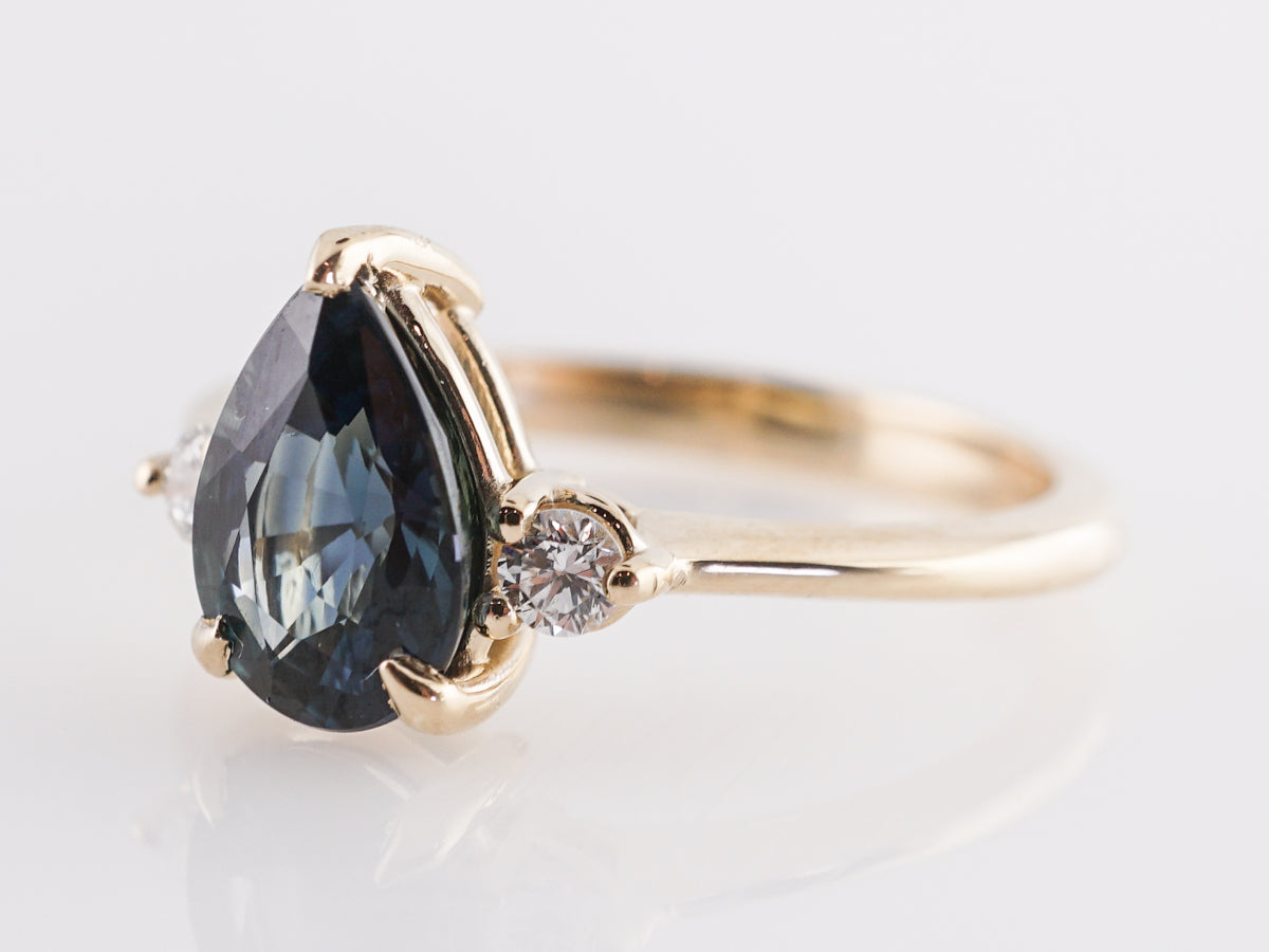1.80 Pear Cut Sapphire Engagement Ring in 14K Yellow Gold. This engagement ring features a 1.80 carat pear cut natural blue sapphire in 14k yellow gold. The sapphire is a deep, midnight blue stone with undertones of navy blue and denim. This dark sapphire showcases the wide spectrum of its brilliance in its variety of slim and wider facets of the oval cut. The natural blue sapphire is accented with two(2) .05 carat genuine natural diamonds and set in three(3) yellow gold prongs. The band is tapered and polished, inscribed with “14K” on the inside of the shank.