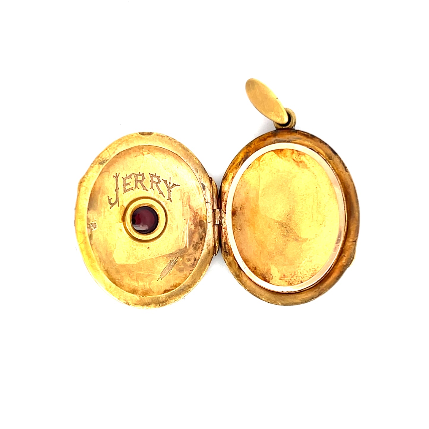 The pendant opens as a locket with the name "JERRY" inscribed inside and has space for keeping a small photo or memento. Measuring 2 inches by 1.25 inches, the locket is roomy enough to hold something meaningful. This piece comes from the Victorian period when lockets were popular for keeping loved ones close, making it both decorative and functional.