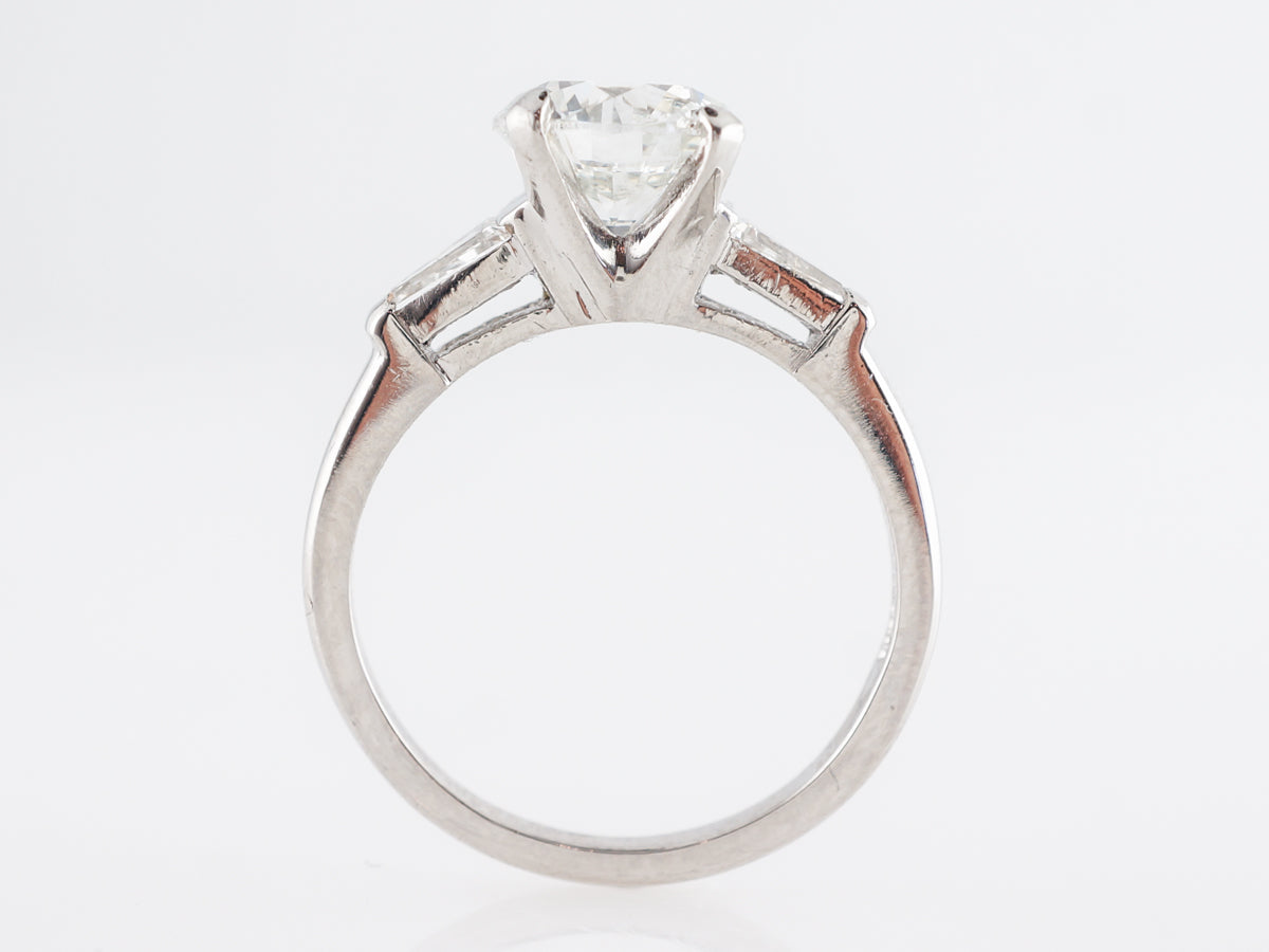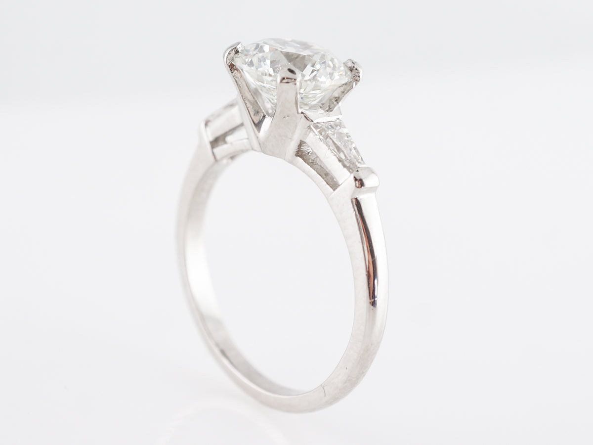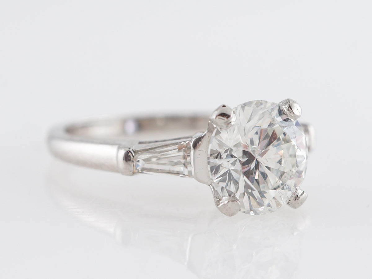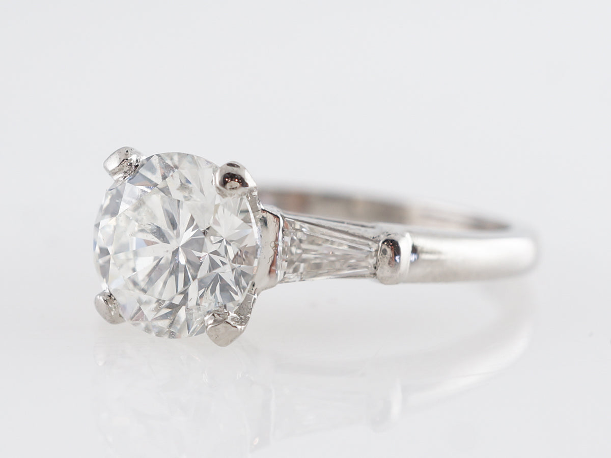 1.83 Round Brilliant Diamond Engagement Ring in Platinum. This modern engagement ring features a 1.83 carat round brilliant cut diamond set in platinum. Accented by tapered baguettes across the shoulders, this clean design looks great next to any wedding band and the 1.83 carat diamond is a perfect size for most people. A great choice for someone looking for a simple and elegant look that will never go out of style.