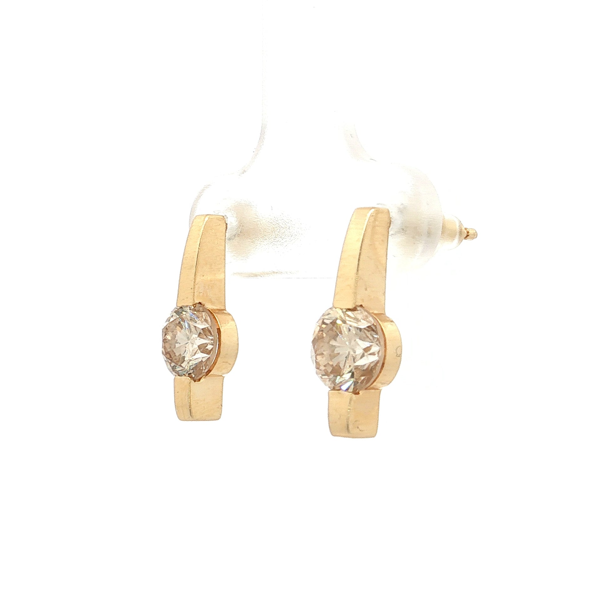 These 14 karat yellow gold stud drop earrings feature round brilliant cut diamonds totaling 1.86 carats suspended between gold bars. The diamonds are graded VS2 in clarity and N in color—VS2 clarity means very minor inclusions that are typically invisible to the naked eye, while N color displays a warm tint that appears light yellow to faint brown.