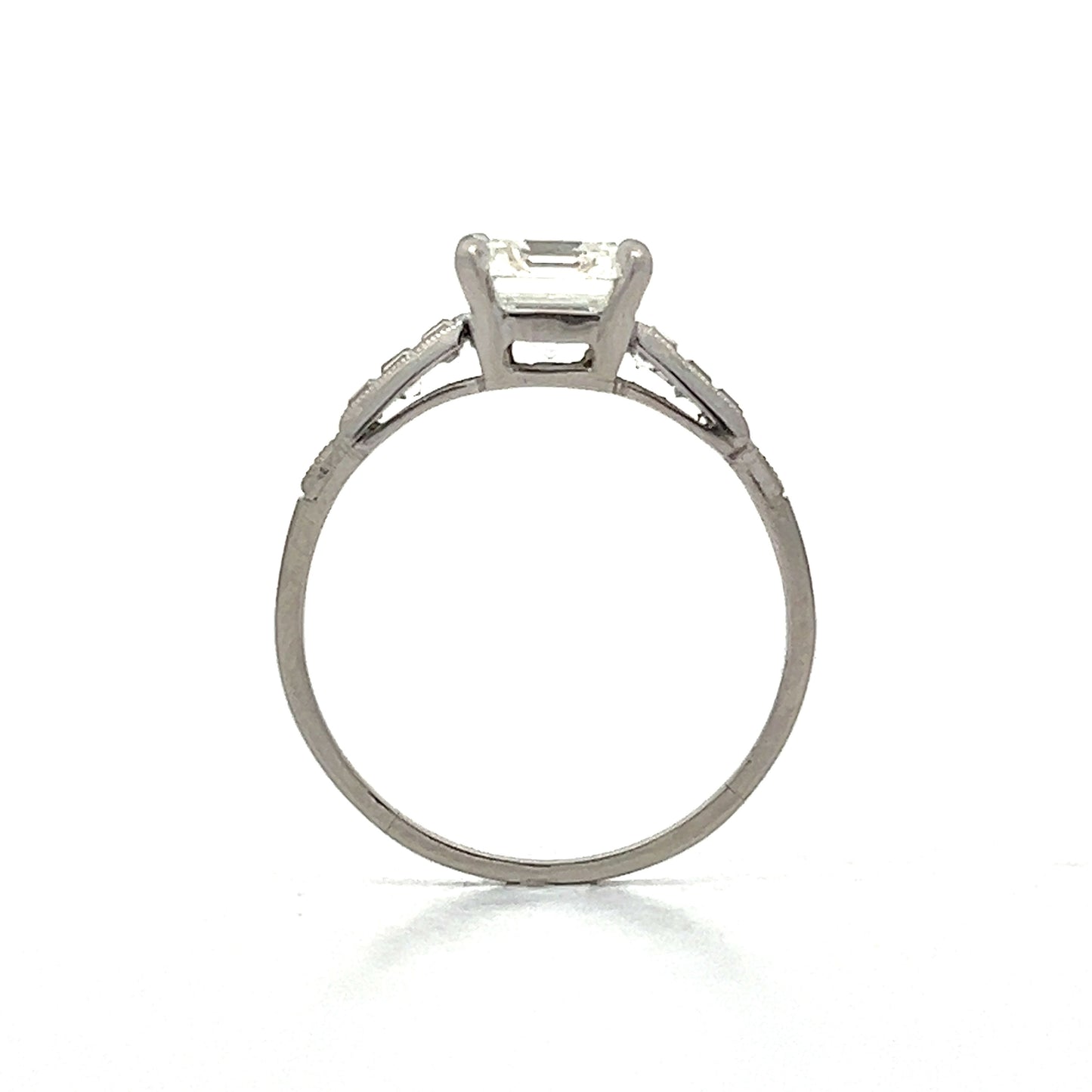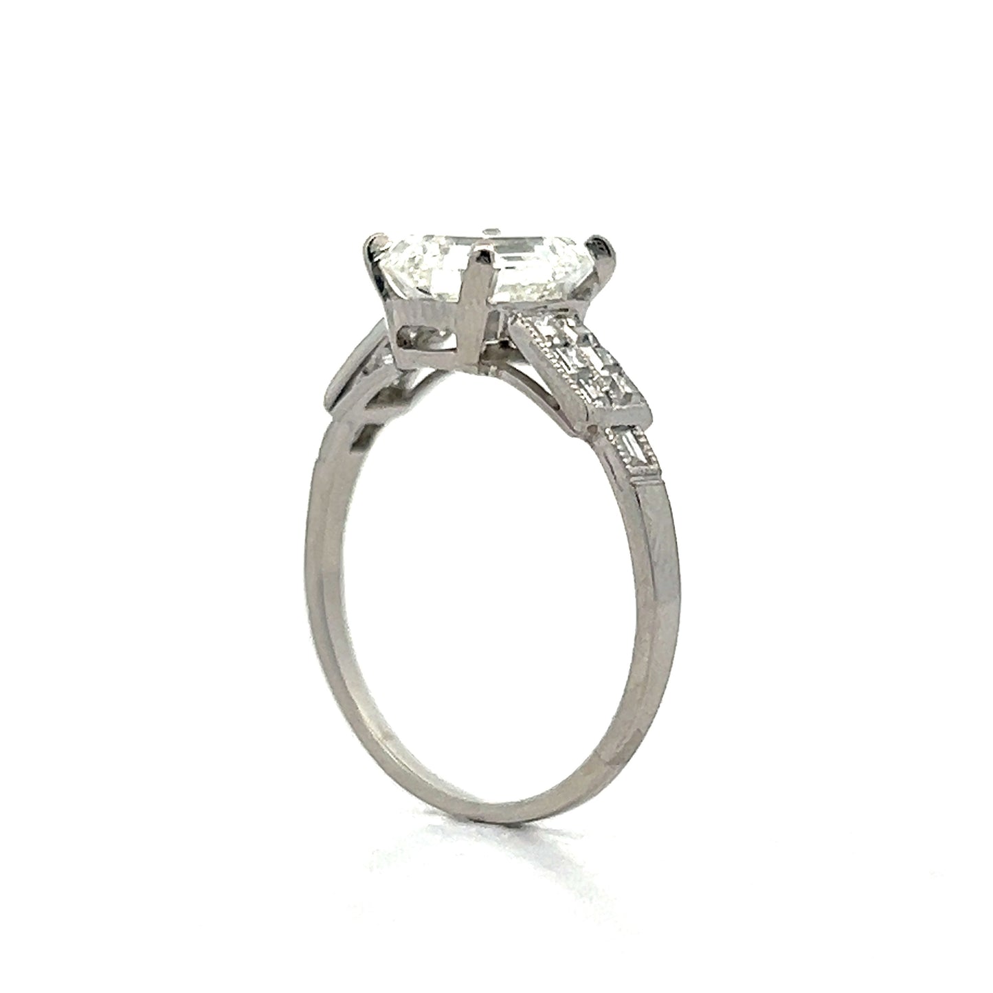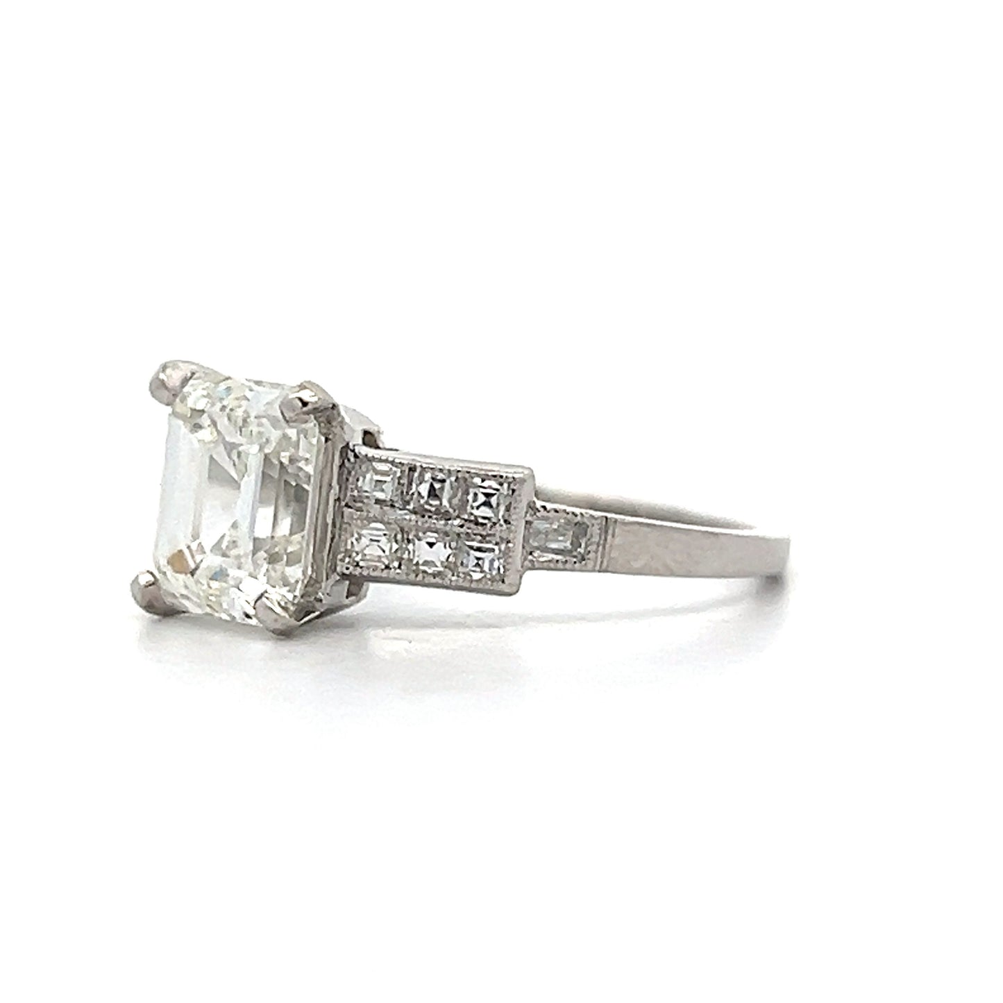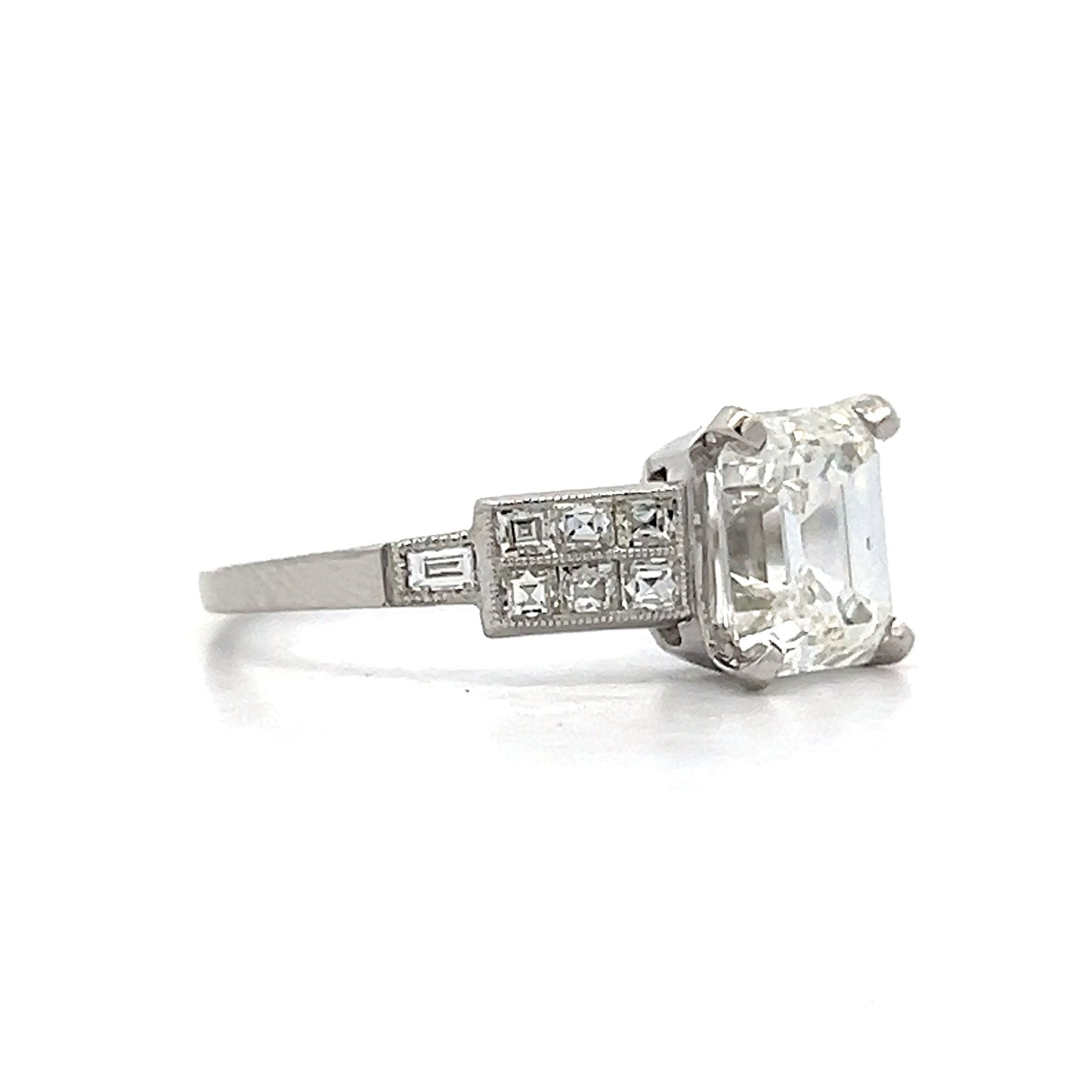 This antique Art Deco engagement ring features a striking 1.90 carat emerald-cut diamond set in platinum. The diamond, with I color and VS1 clarity, is secured by four prongs and showcases large linear facets that beautifully catch the light. Surrounding the center stone are twelve channel-set Asscher-cut diamonds, each measuring 1.50 x 1.75 mm and weighing .03 carats, with G color and VS2 clarity. These diamonds create a sparkling frame around the emerald-cut diamond. Milgrain detailing along the edges of the band adds a layer of intricate craftsmanship.